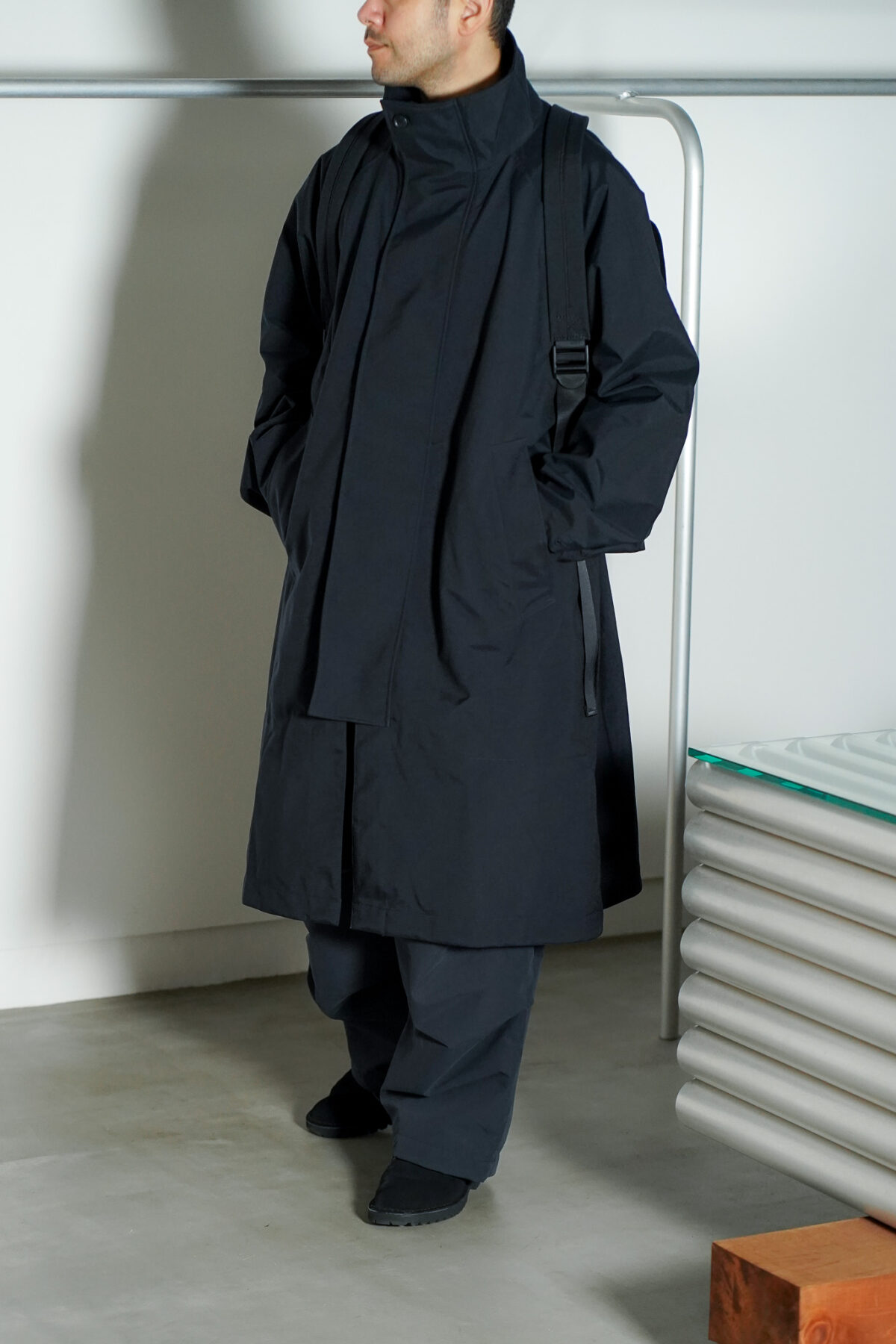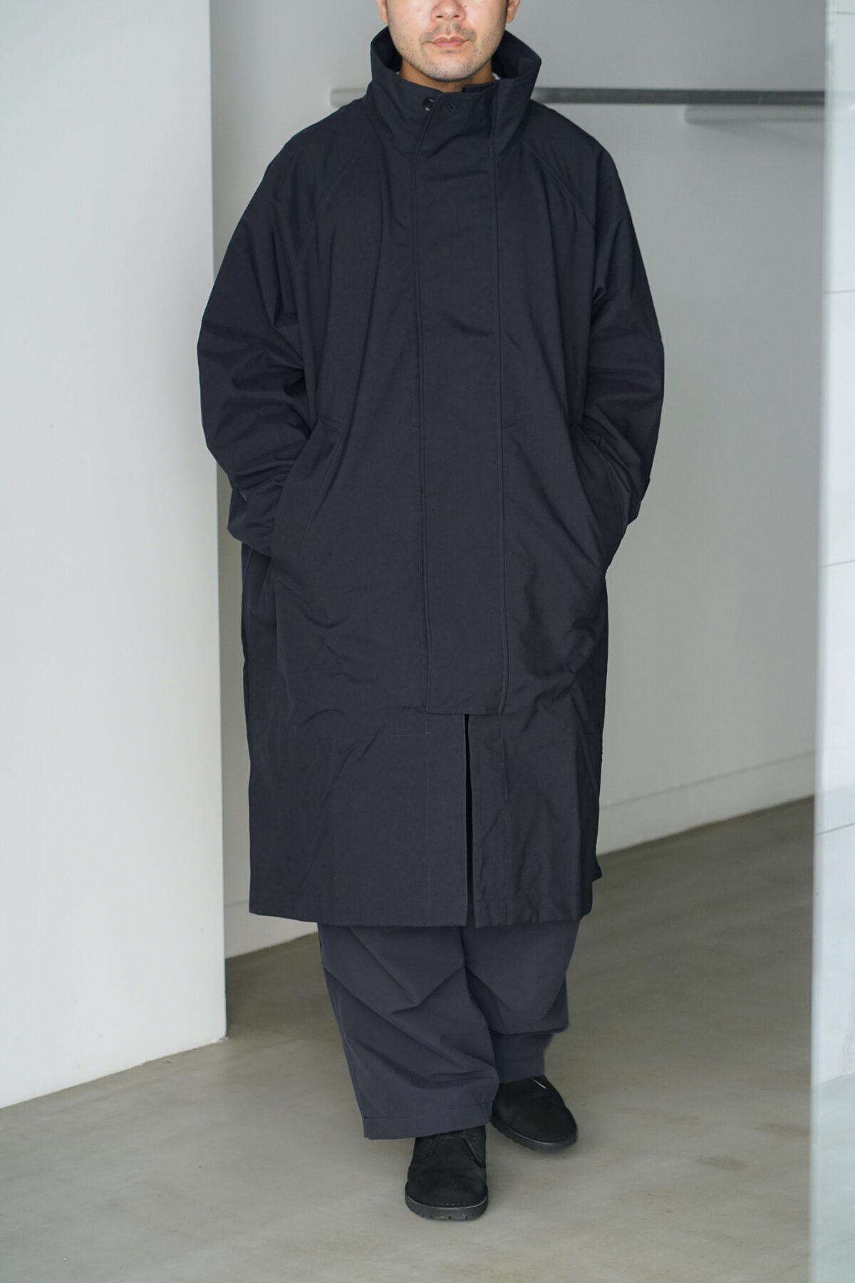 天然素材のような質感を持つ、 タスランナイロンオックスを使用した 3レイヤーのスタンドカラーコート。