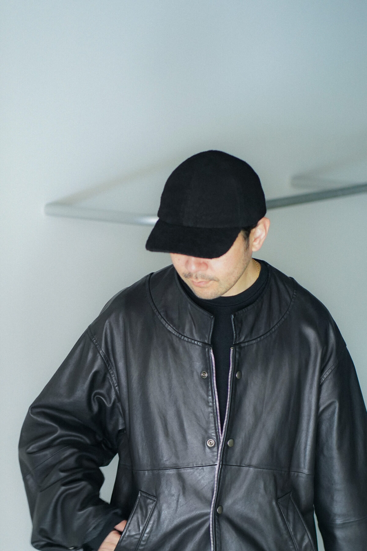 毛足が荒めで粗野な風合いのカンガルーレザーを使用。クラウンが深く、ブリムは広めですので髪型をセットせずラフに被っていただけて、スタイリングがまとまる良さがございます。サイズ調整は後頭部ドローコードを絞っていただくことで調節が可能、サイズ調整の機能とデザイン性が相まったディテールとなっています。