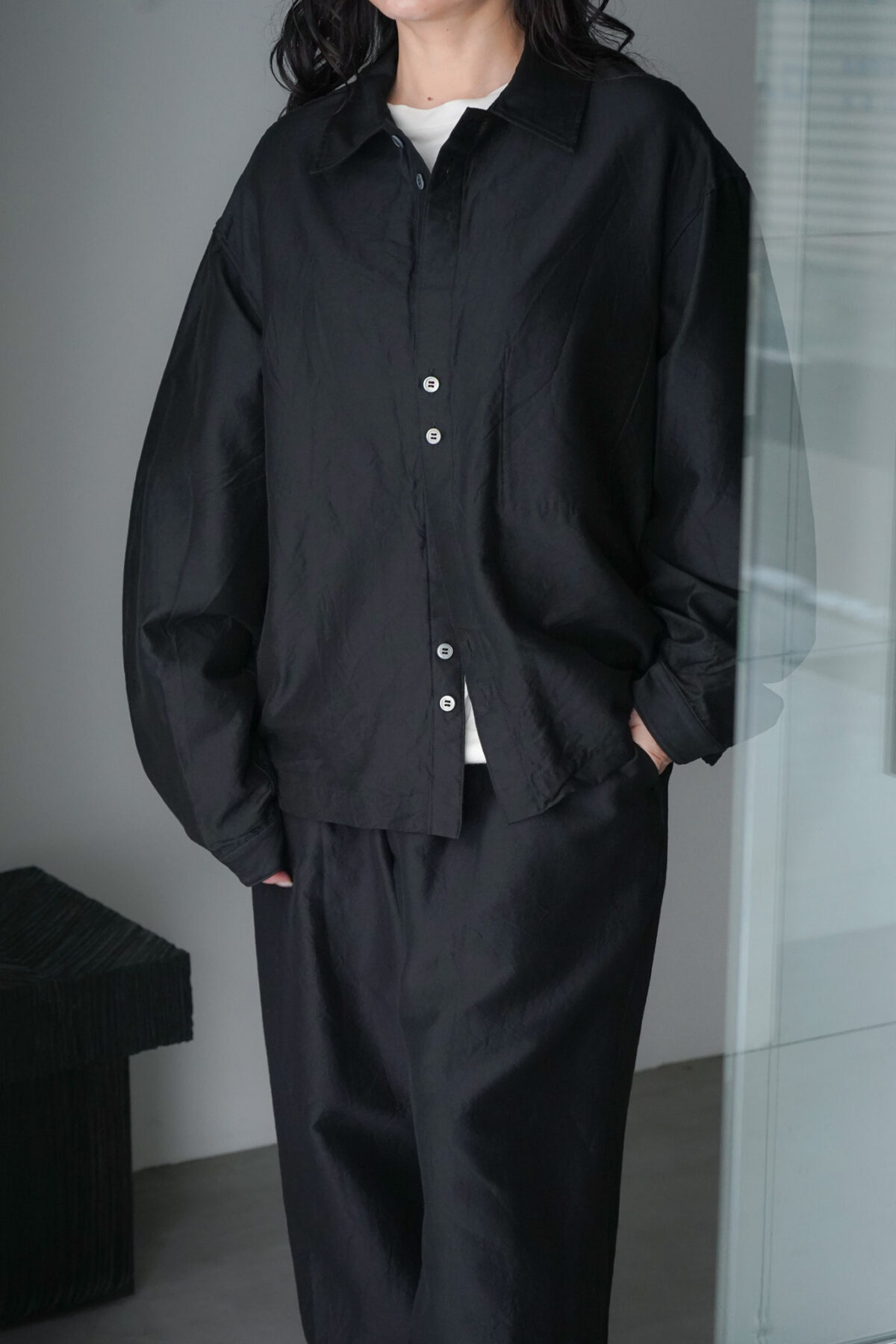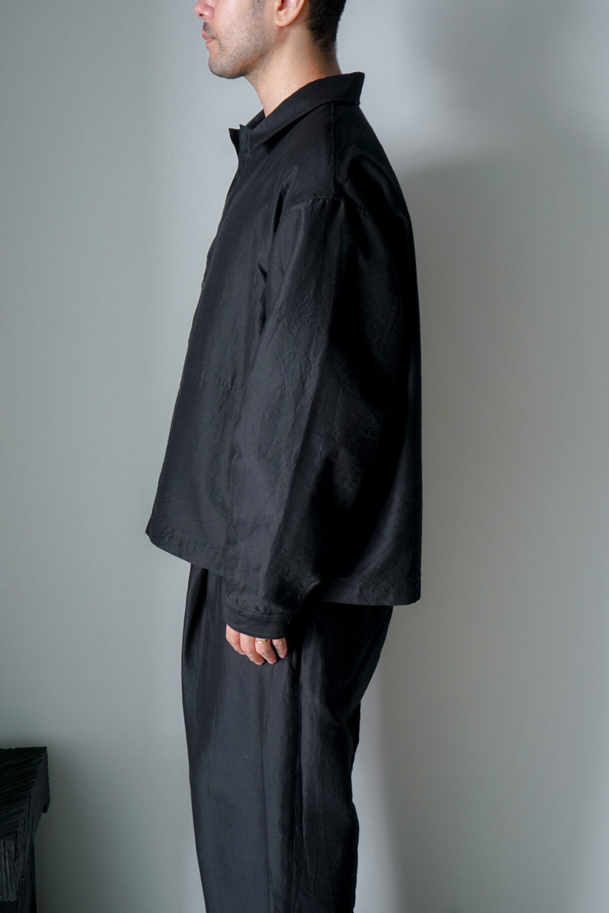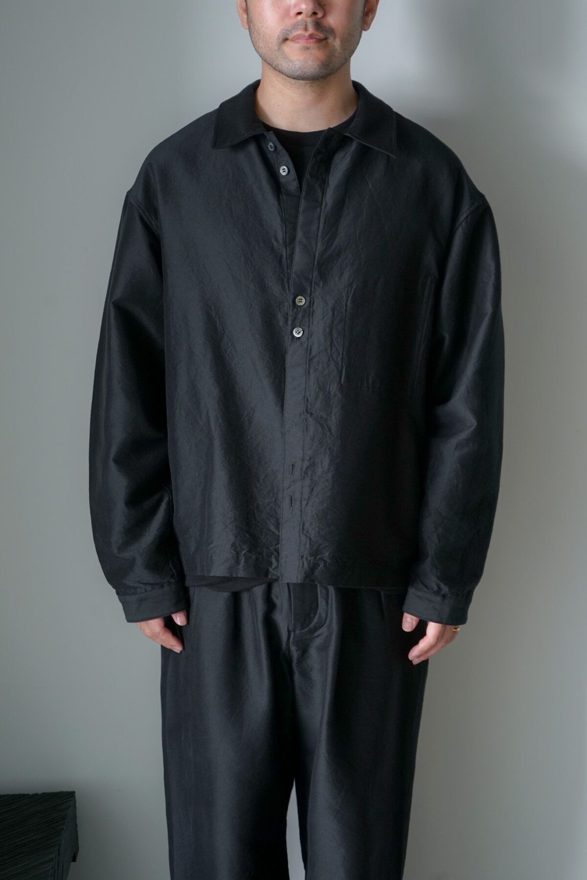 シャツジャケットのような立ち位置で羽織れる一枚。ボックスシルエットで大変収まりのいい着丈、パンツは素材感問わず幅広く合わせていただけます。共生地のzipper ptでセットアップは勿論のこと、例えば同ブランドのnep ptのようなリラックスした印象のものと合わせても良い抜け感がありつつ、カジュアルに行きすぎないバランスでした。