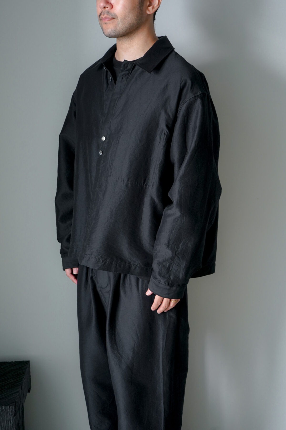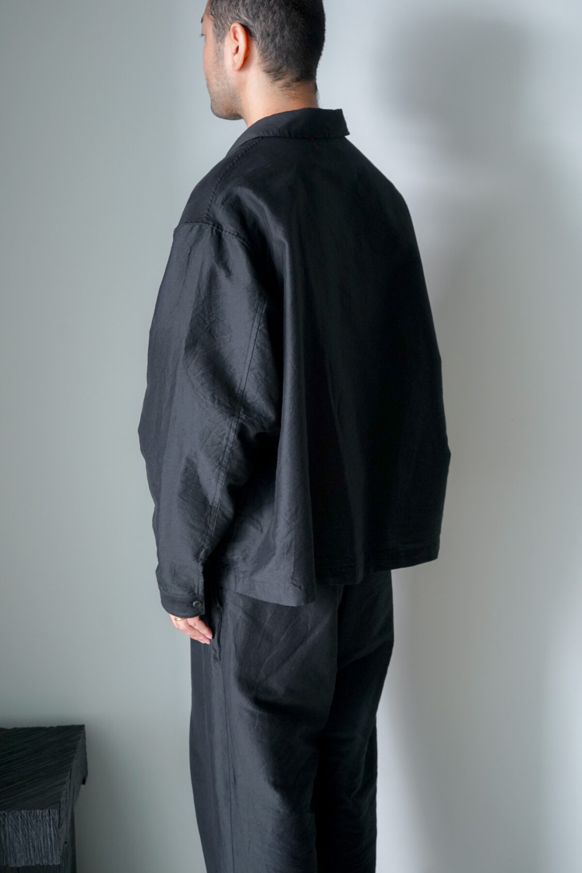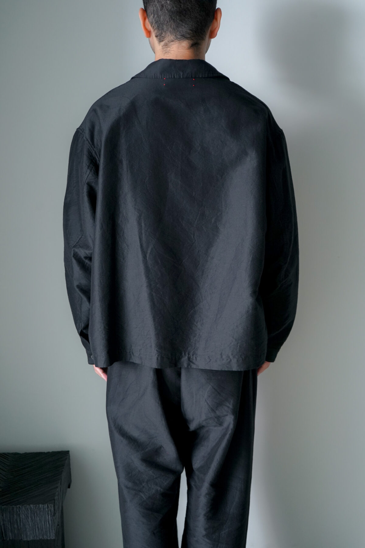 シャツジャケットのような立ち位置で羽織れる一枚。ボックスシルエットで大変収まりのいい着丈、パンツは素材感問わず幅広く合わせていただけます。共生地のzipper ptでセットアップは勿論のこと、例えば同ブランドのnep ptのようなリラックスした印象のものと合わせても良い抜け感がありつつ、カジュアルに行きすぎないバランスでした。