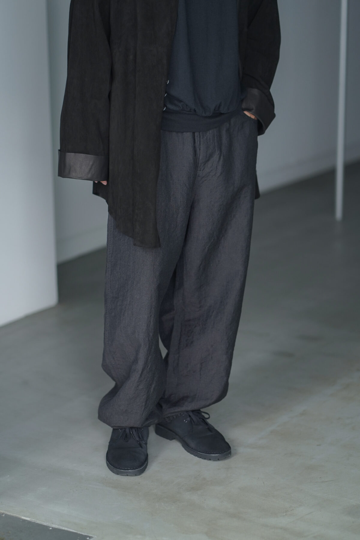 裾のカットオフされたデザインが特徴的なb/off pt。ウールリネンの生地は見た目は重く、着用感は軽やかでこの時期から快適にご着用いただけます。裾のディテールも相まって、シンプルなスタイリングの際にもしっかりとした存在感があります。