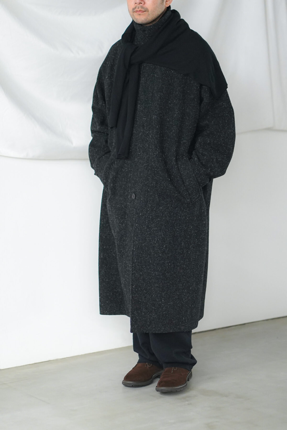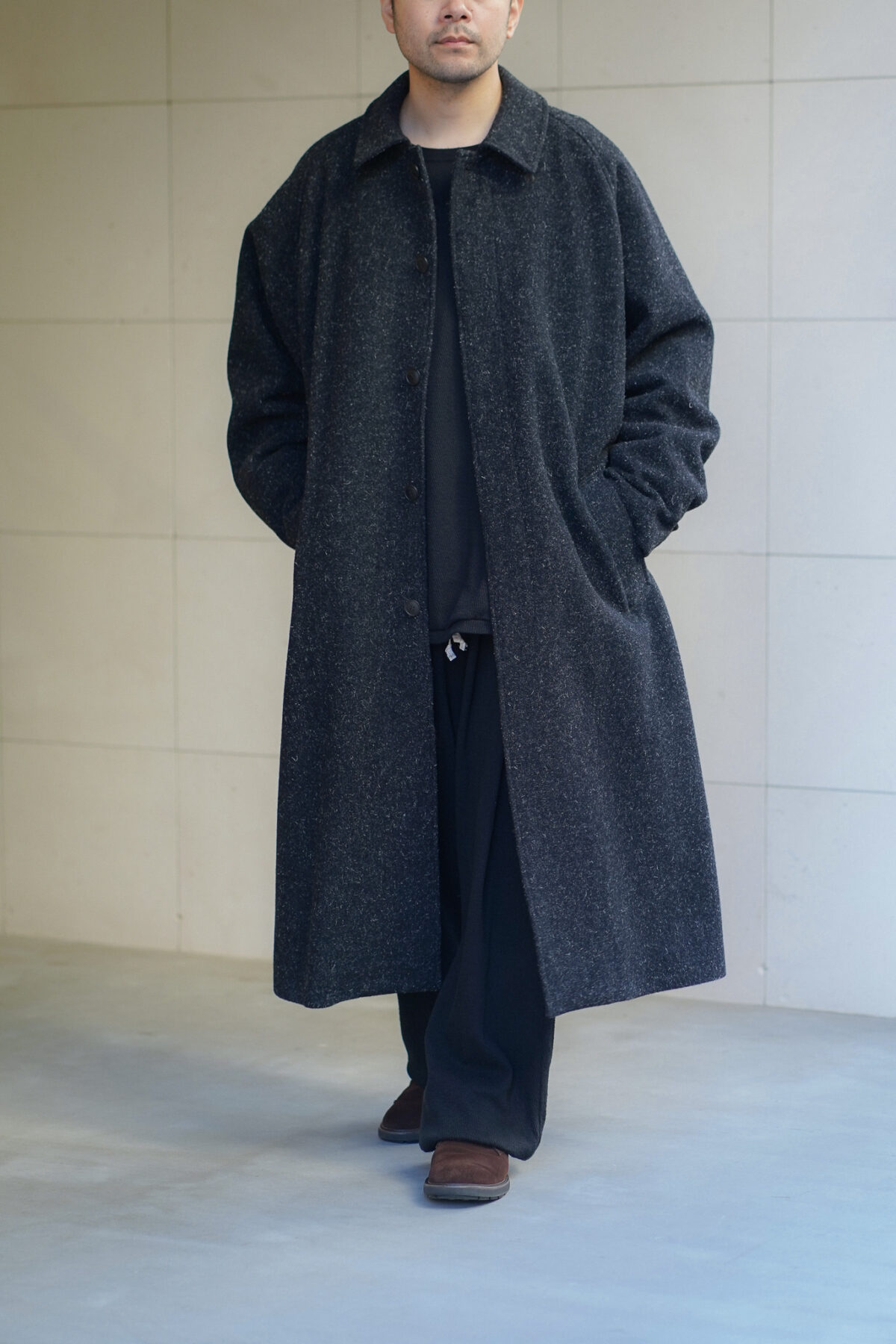 クラシックなロングコートのデザインをルーズなサイズ感に落とし込んだオーバーサイズバルカラーコート。