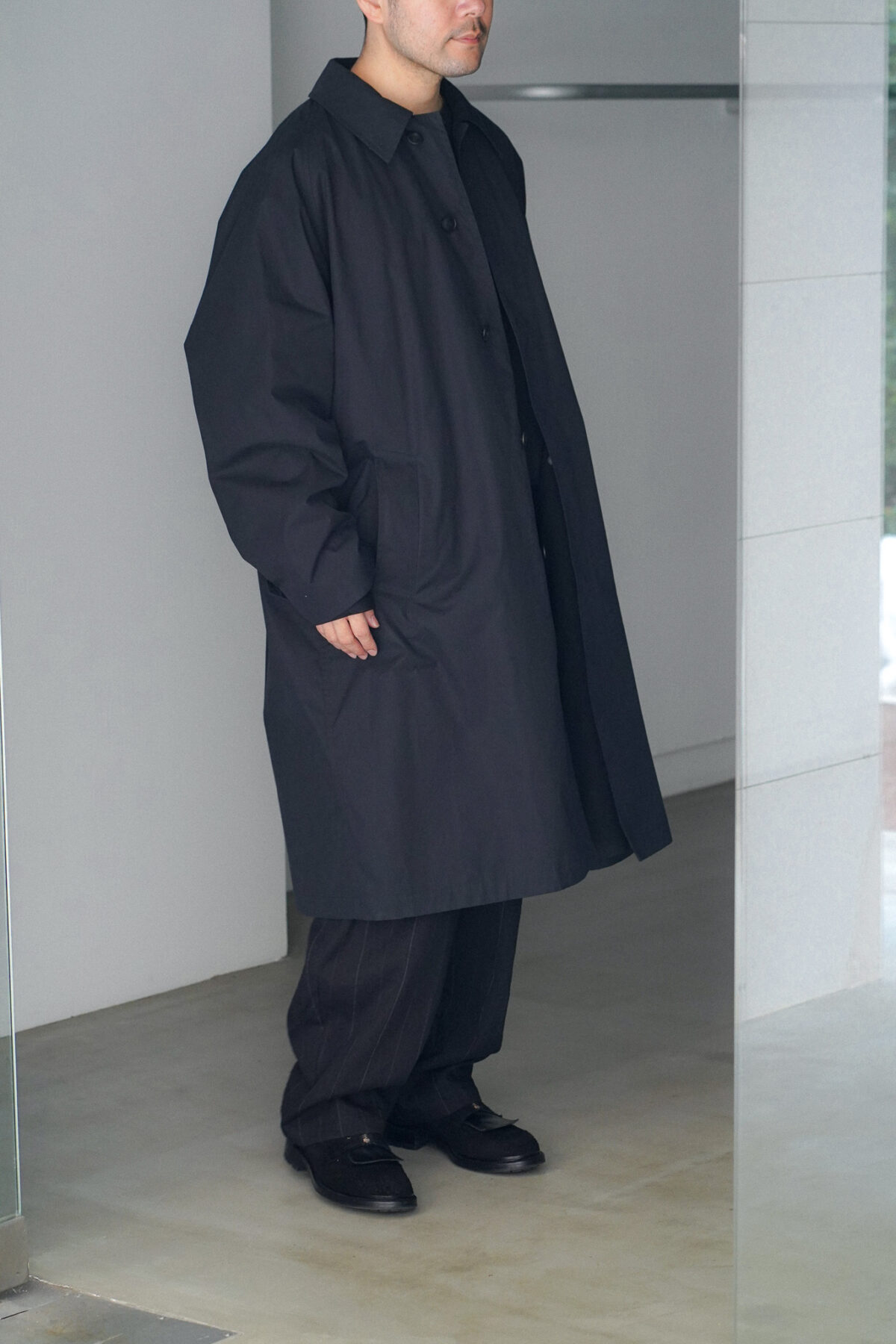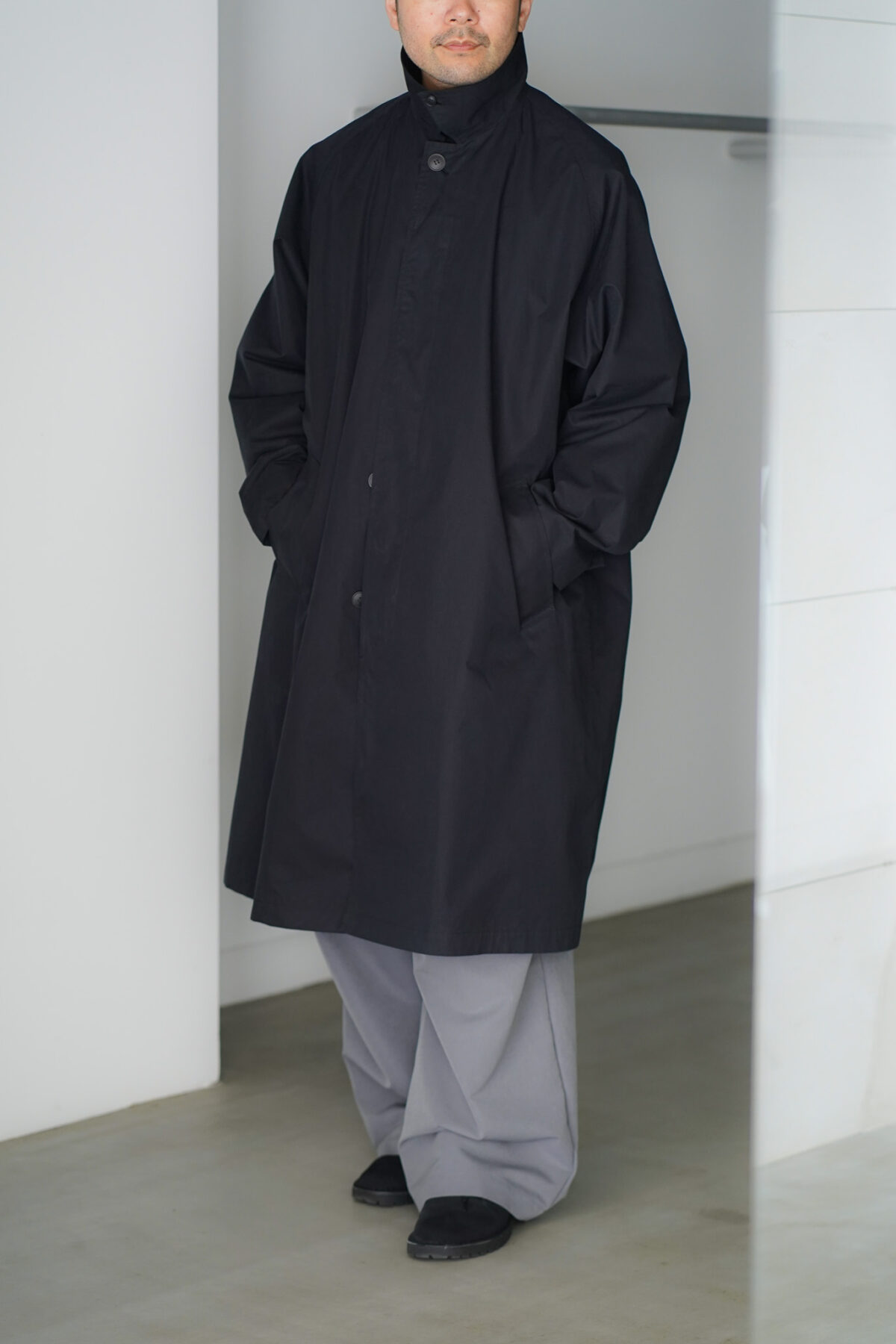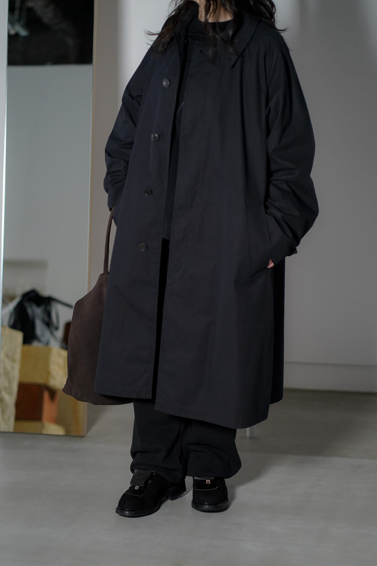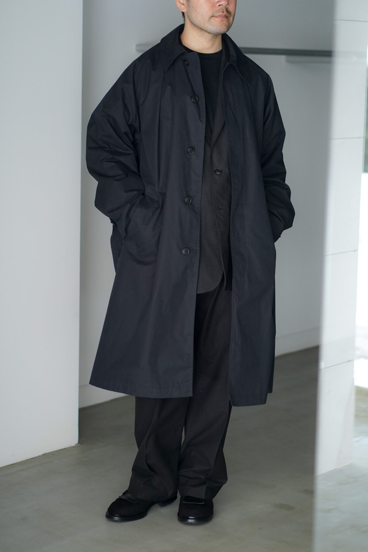 YOKO SAKAMOTO BAL COLLAR COAT - MAX HIGH COUNT WEATHER TYPEWRITER - BLACK