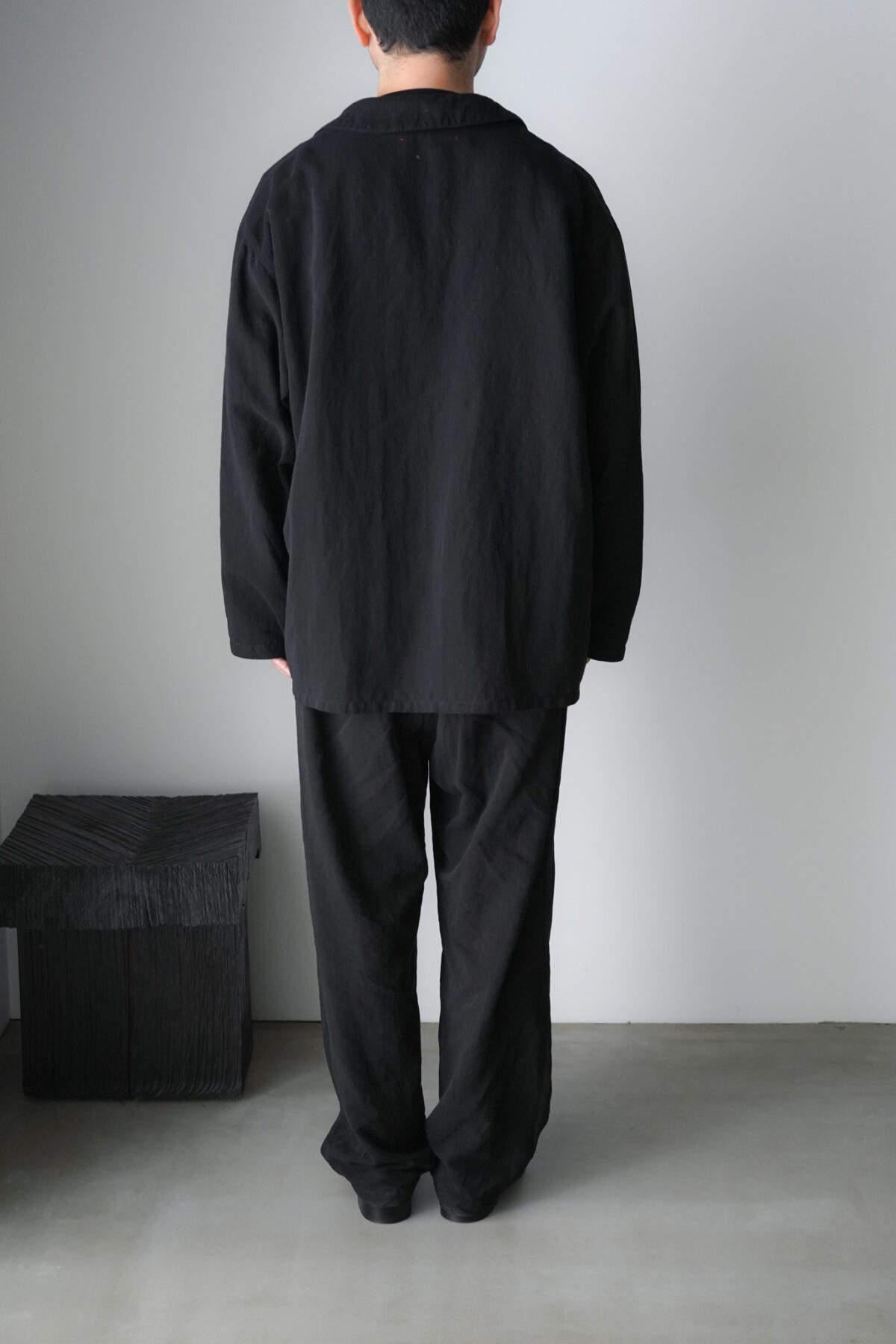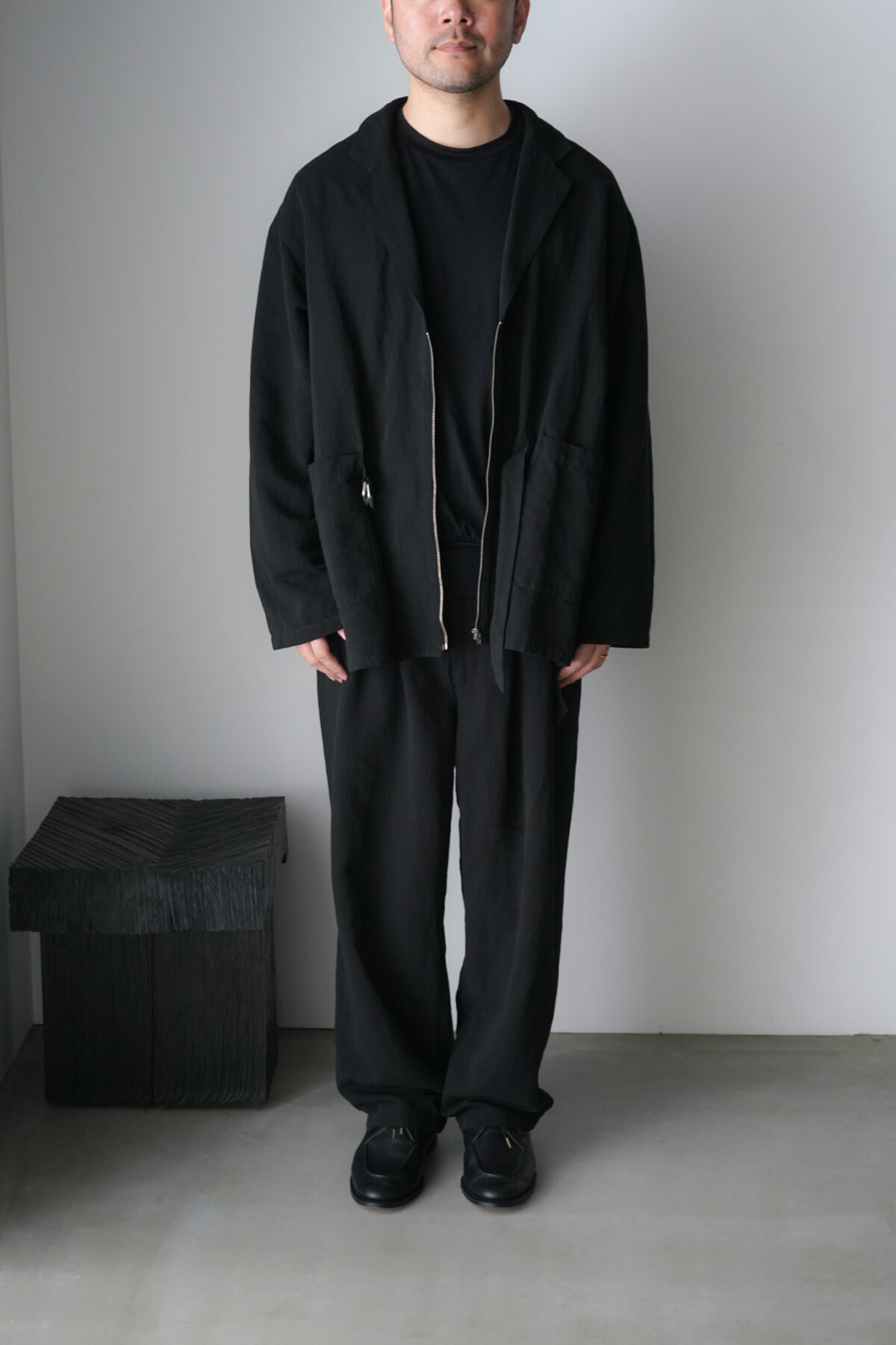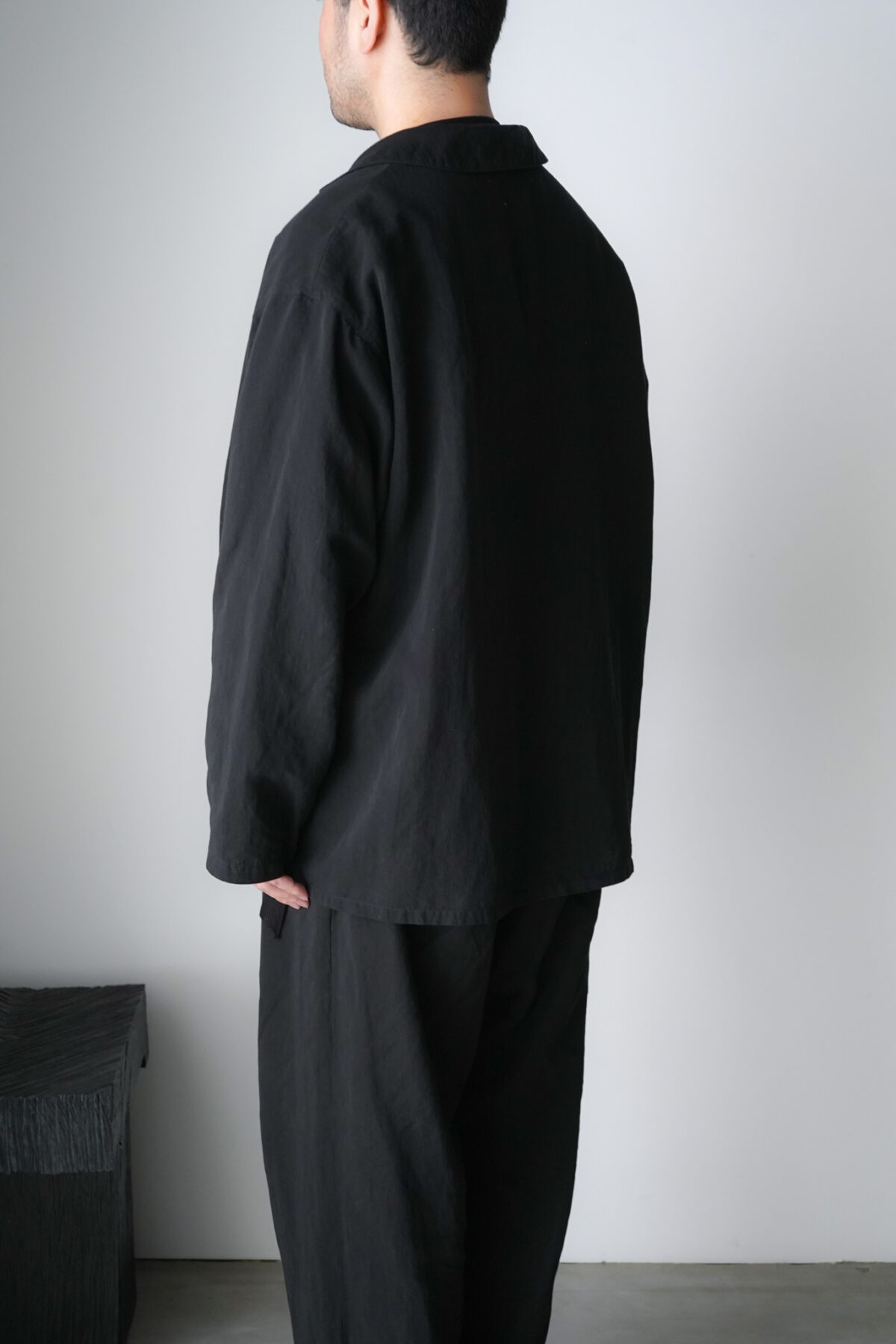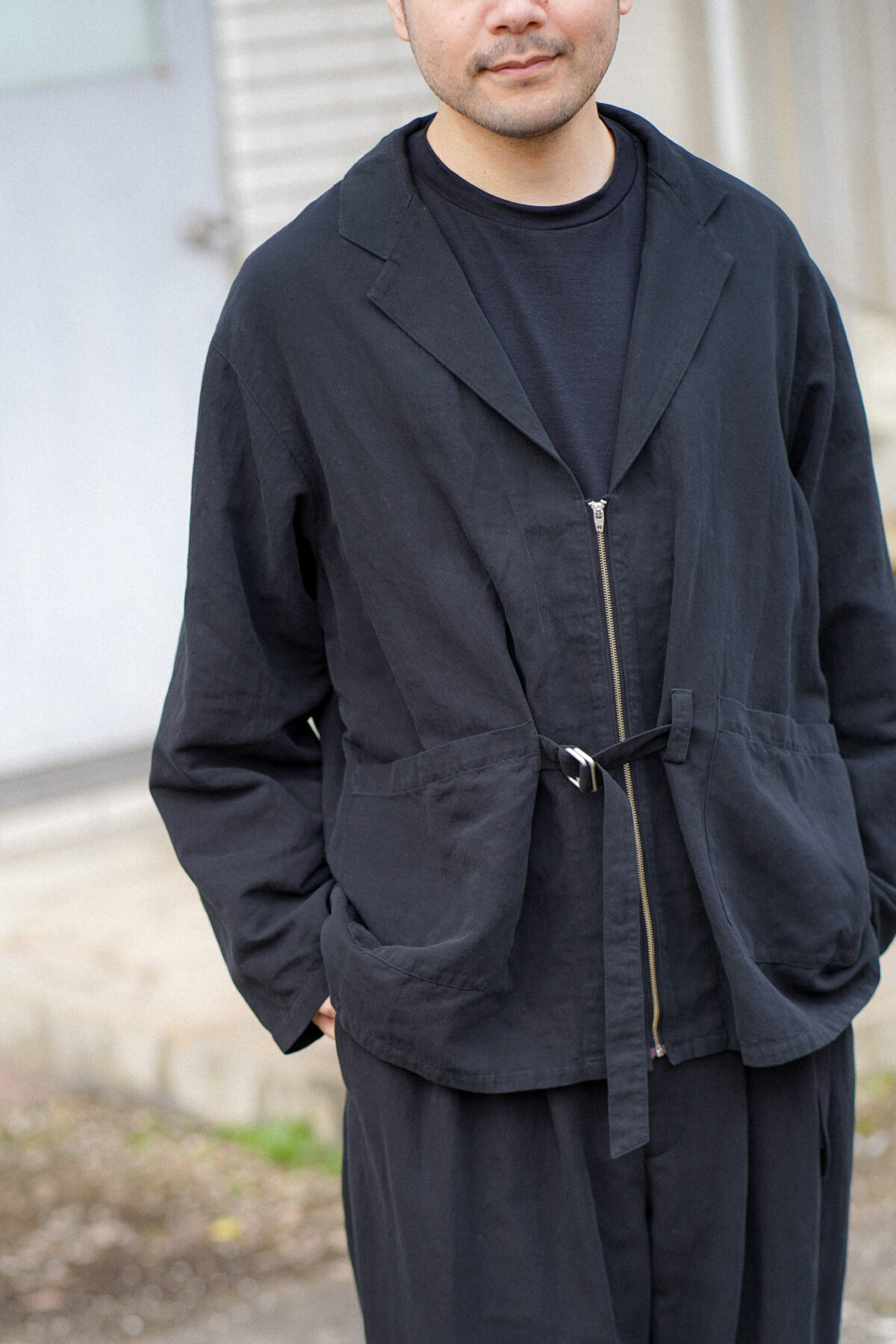 製品染めによって程よくカジュアルな表情を持たせながらも、光沢を抑えたラミーの質感が品を添え、ワーク由来の印象になりすぎないバランスに仕上げられています。
