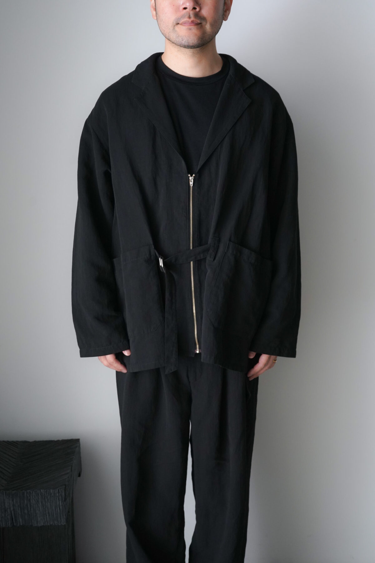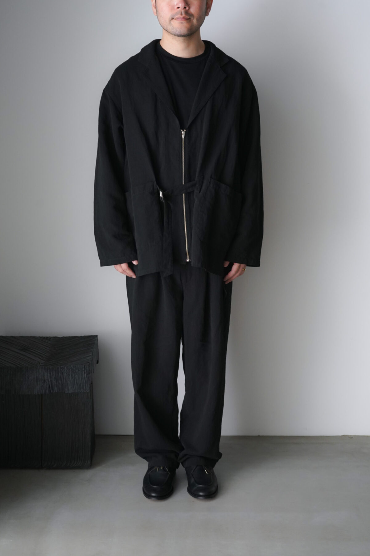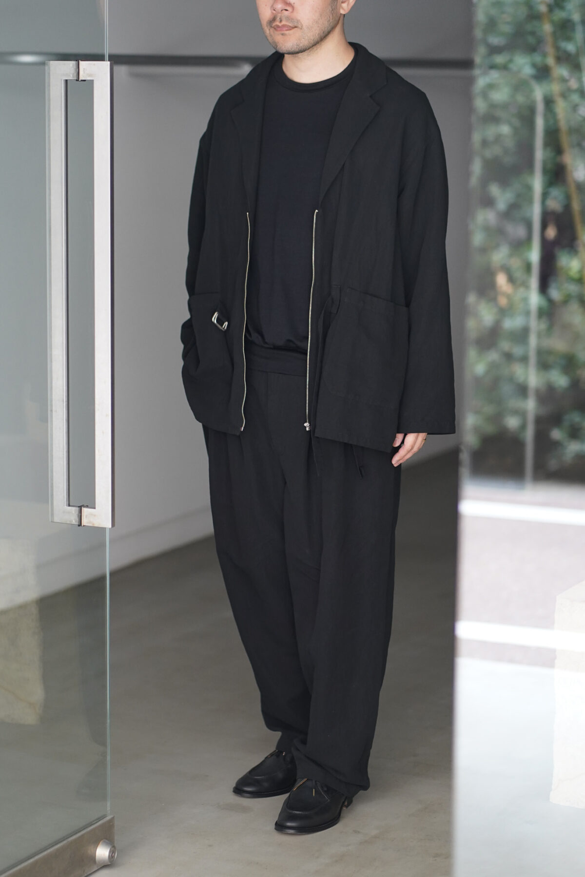 製品染めによって程よくカジュアルな表情を持たせながらも、光沢を抑えたラミーの質感が品を添え、ワーク由来の印象になりすぎないバランスに仕上げられています。