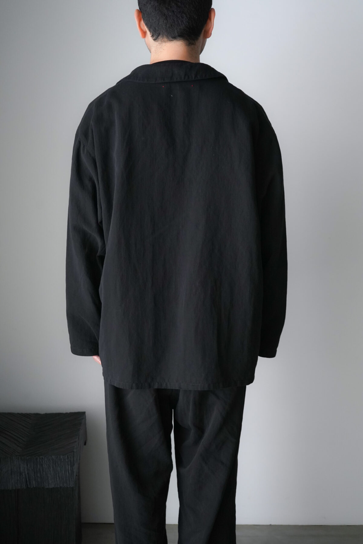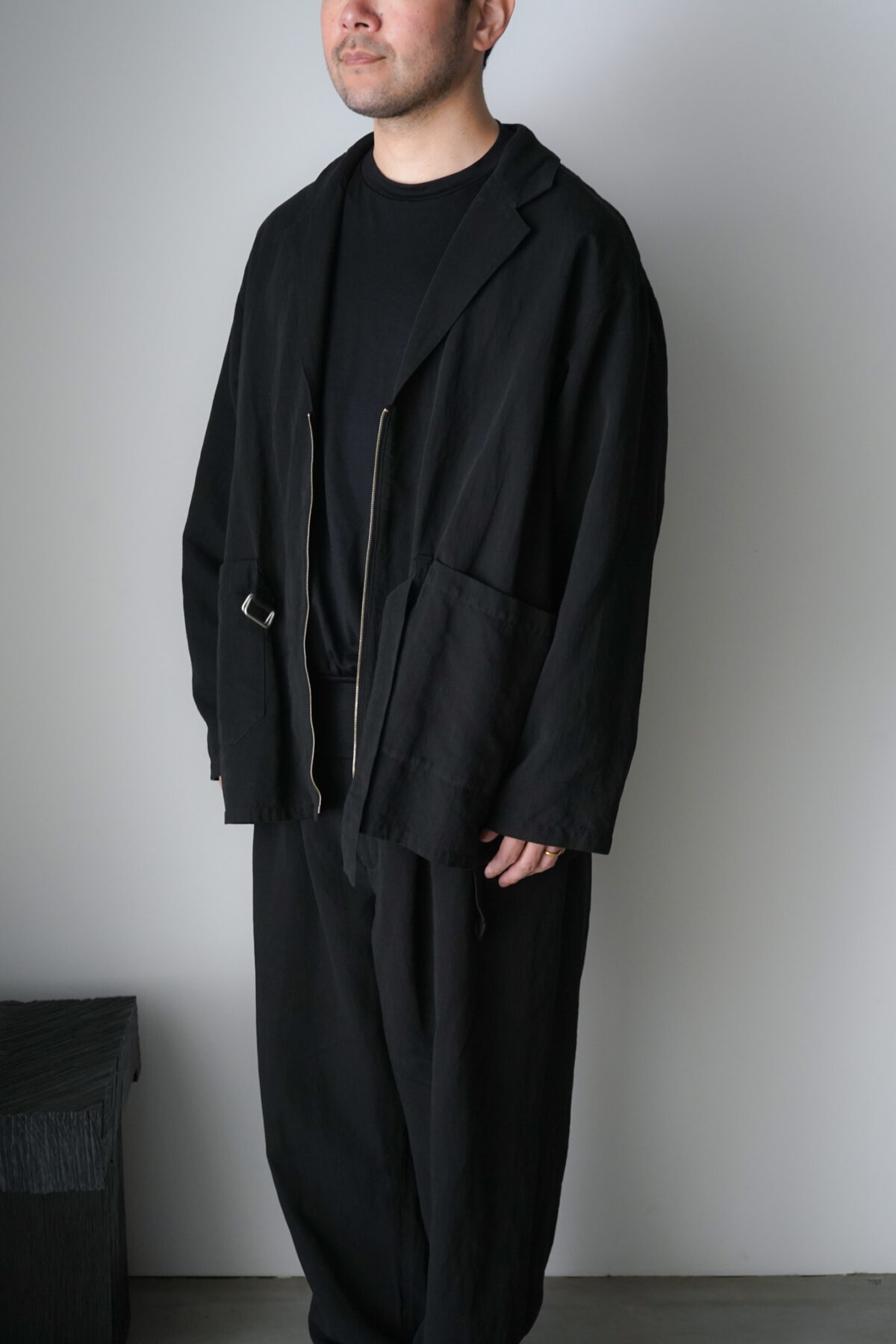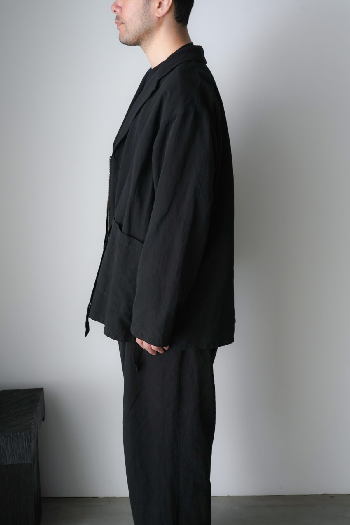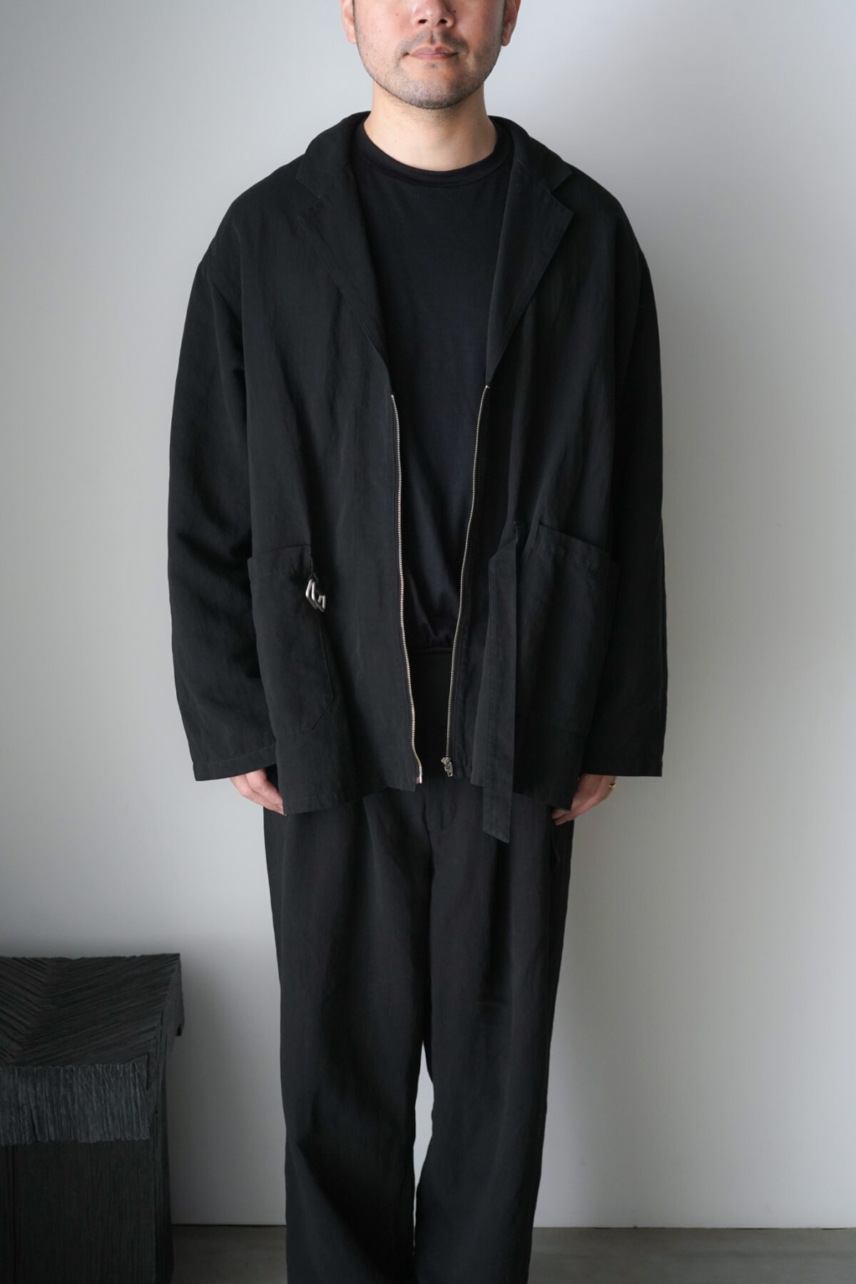 製品染めによって程よくカジュアルな表情を持たせながらも、光沢を抑えたラミーの質感が品を添え、ワーク由来の印象になりすぎないバランスに仕上げられています。