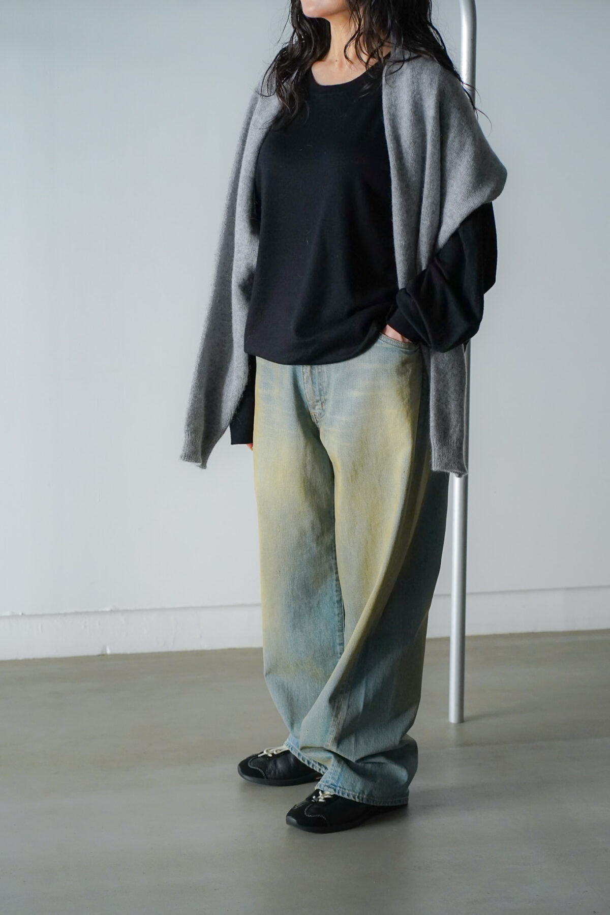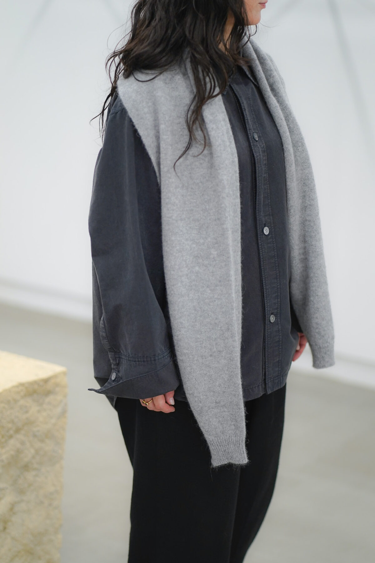 両側が筒状になっており、腕を通すとたっぷりとした生地感がポイントのボレロ風にも使用できます。