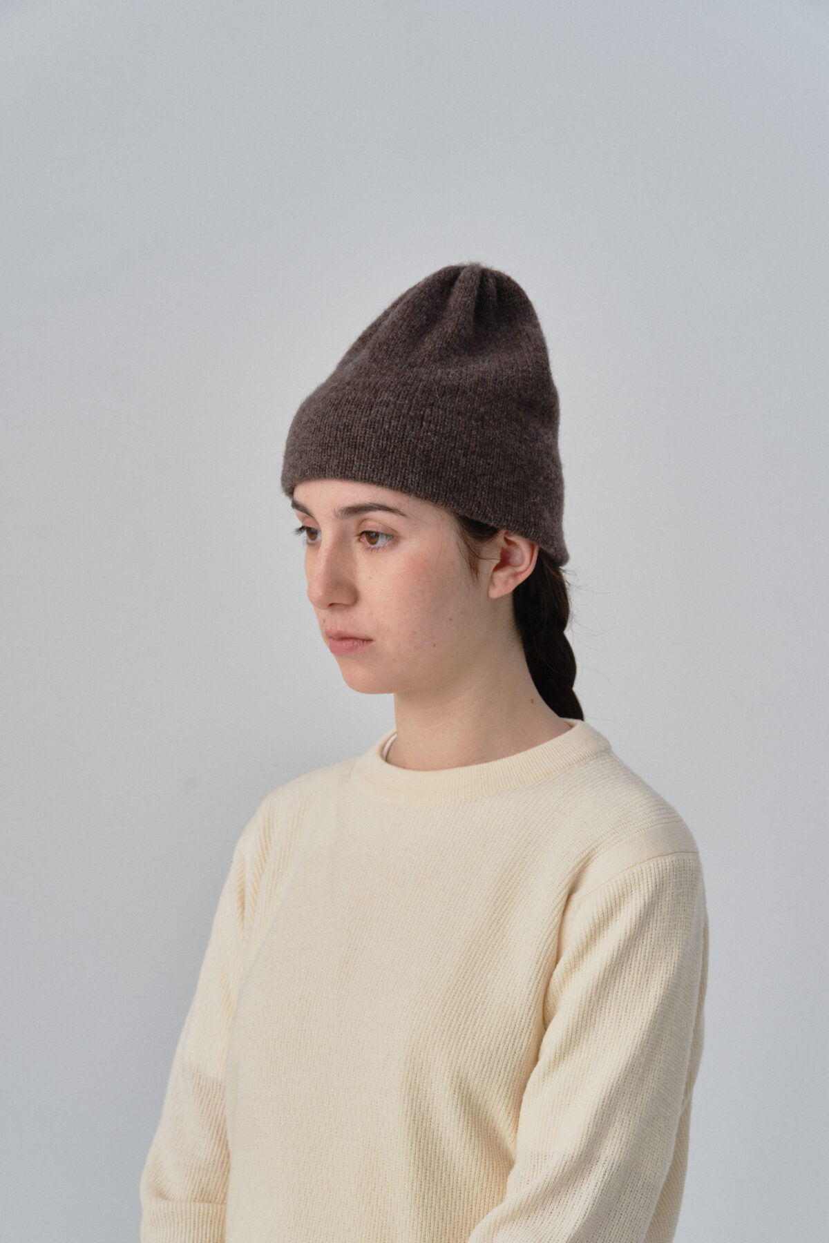 ふわっと柔らかな印象のベビーアルパカ混の糸で編み立てたニット帽。