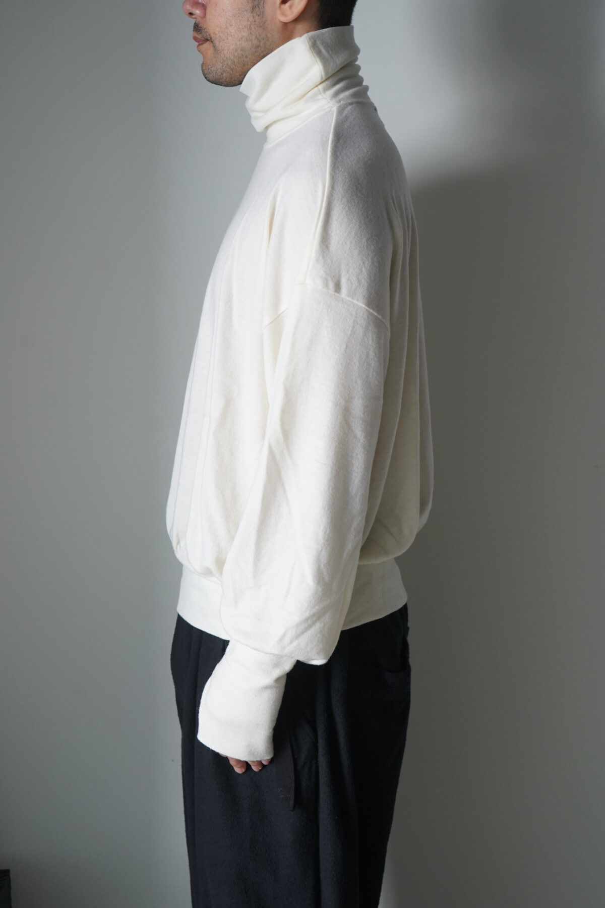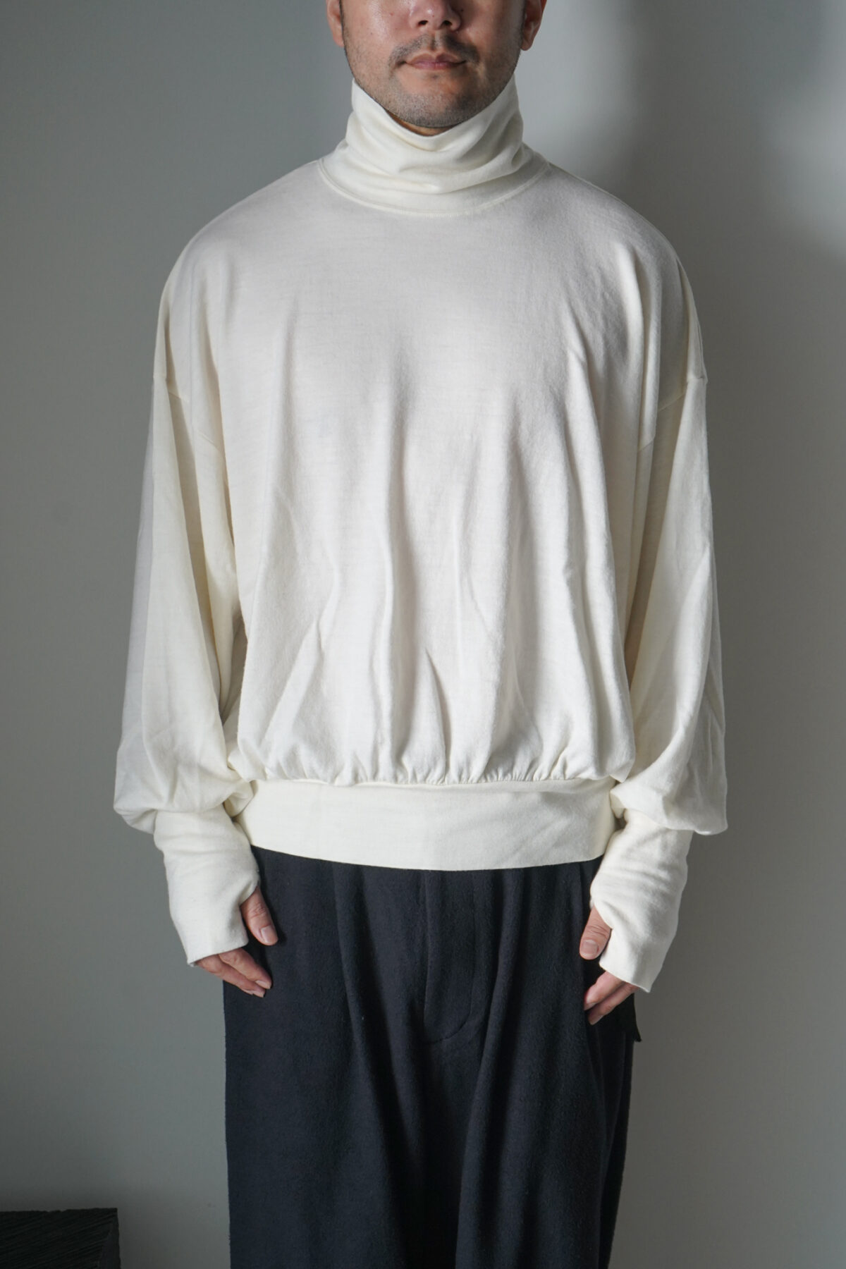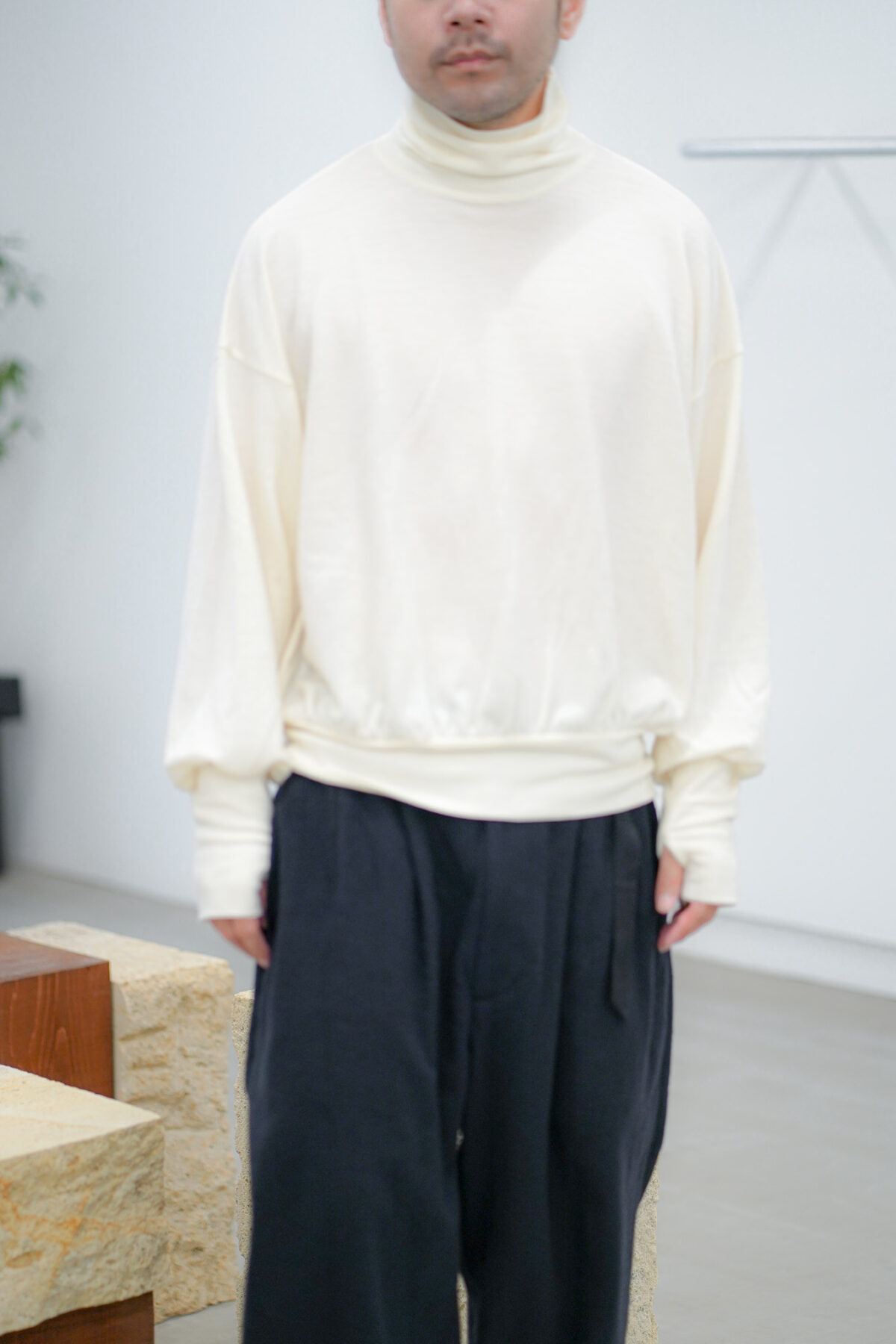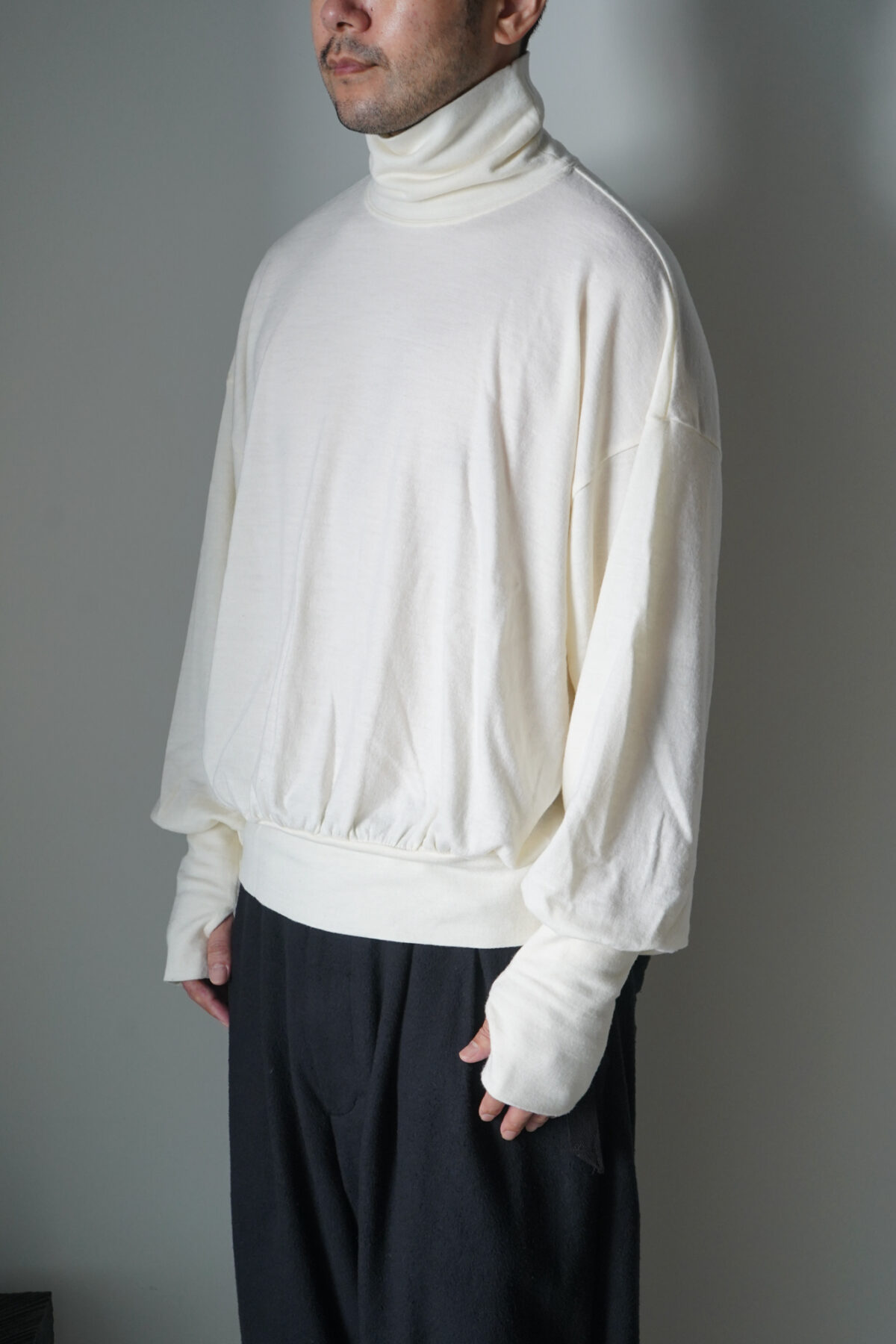 スタイリングのベースとして着用したいタートルネック。首周りは緩やかで程よい余白があり、袖にはフィンガーホールが付いています。