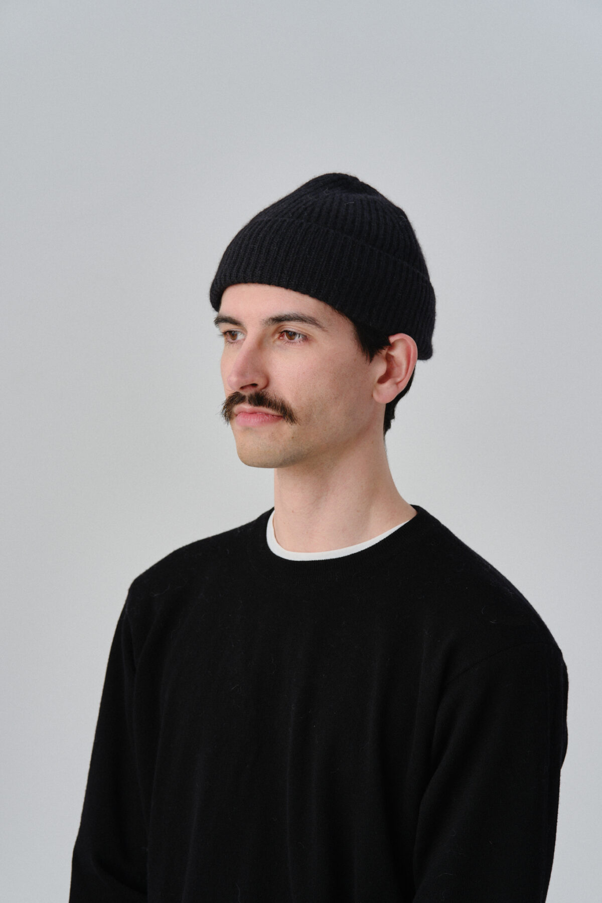 柔らかく肌触りの良いカシミヤをシンプルなリブ編みで編み上げたニット帽。