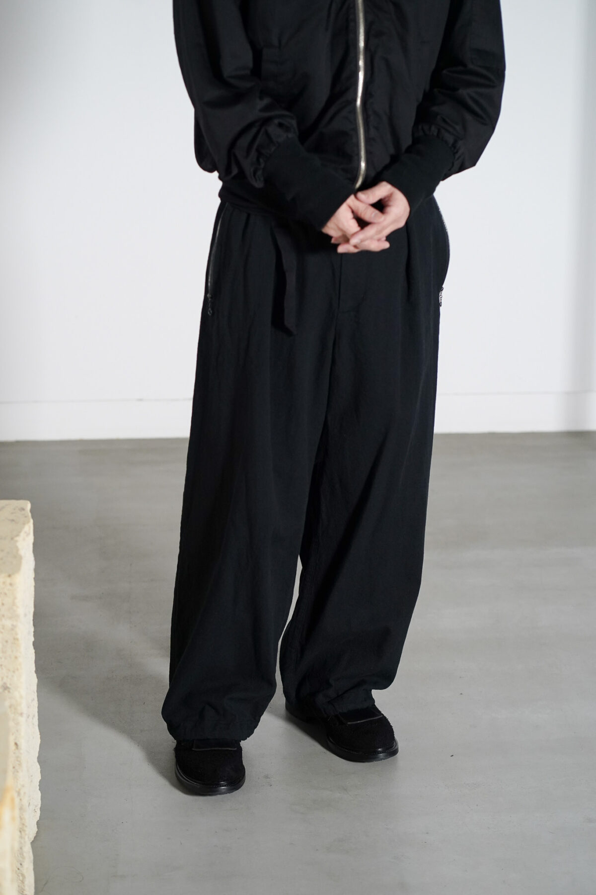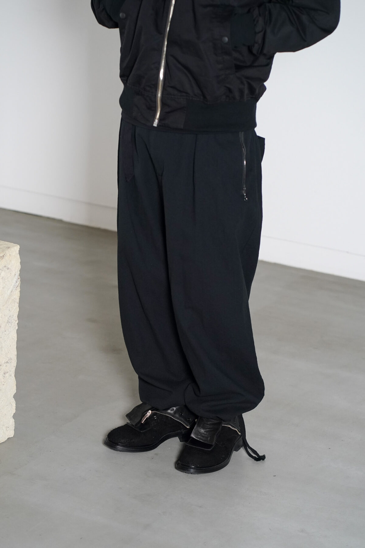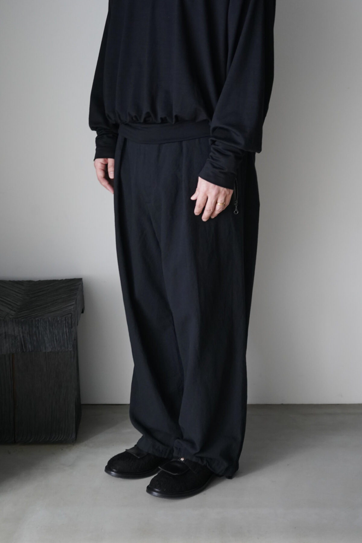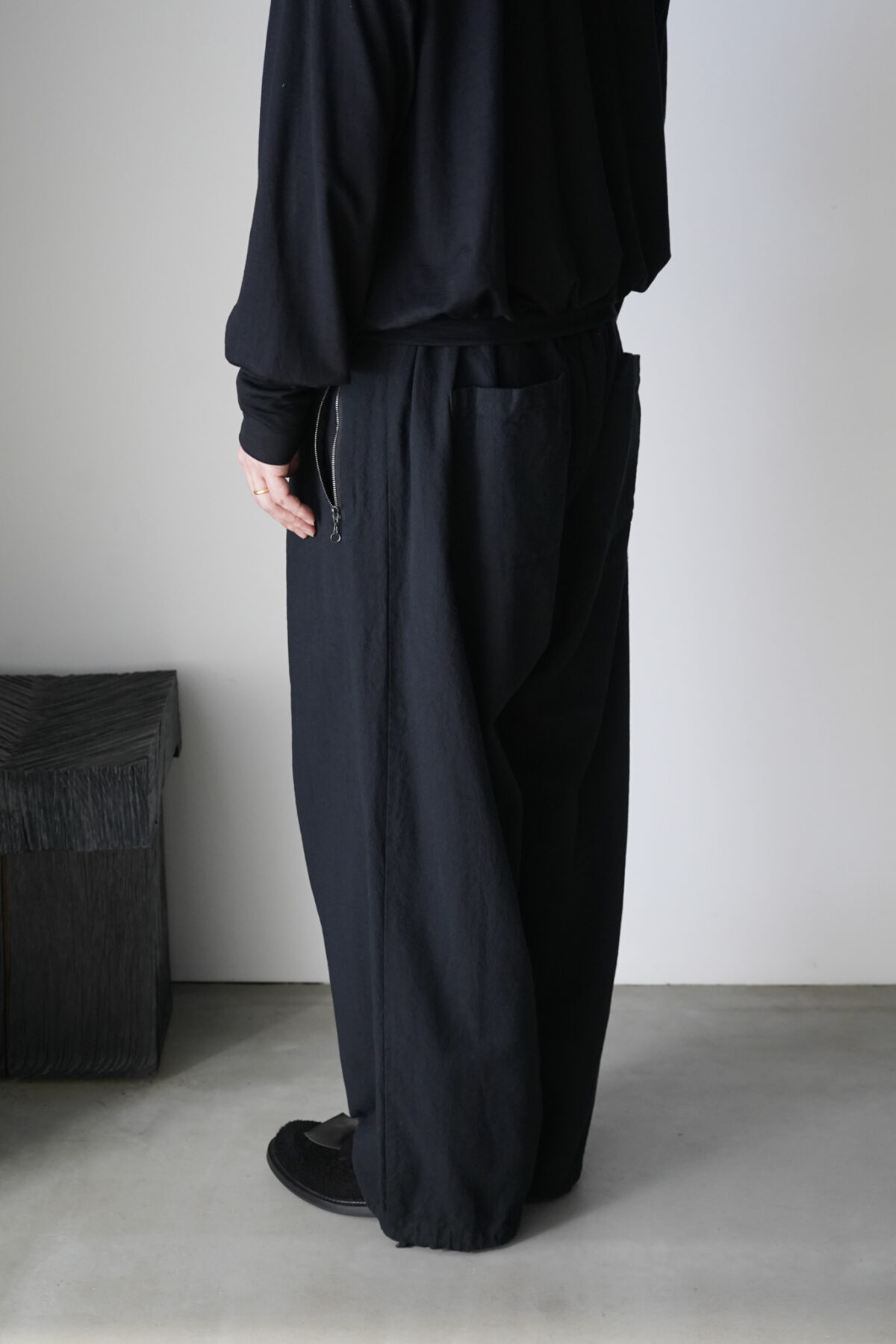 腰回りのボリュームから流れるように落ちるストレートシルエット。