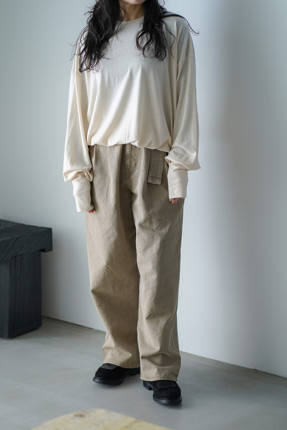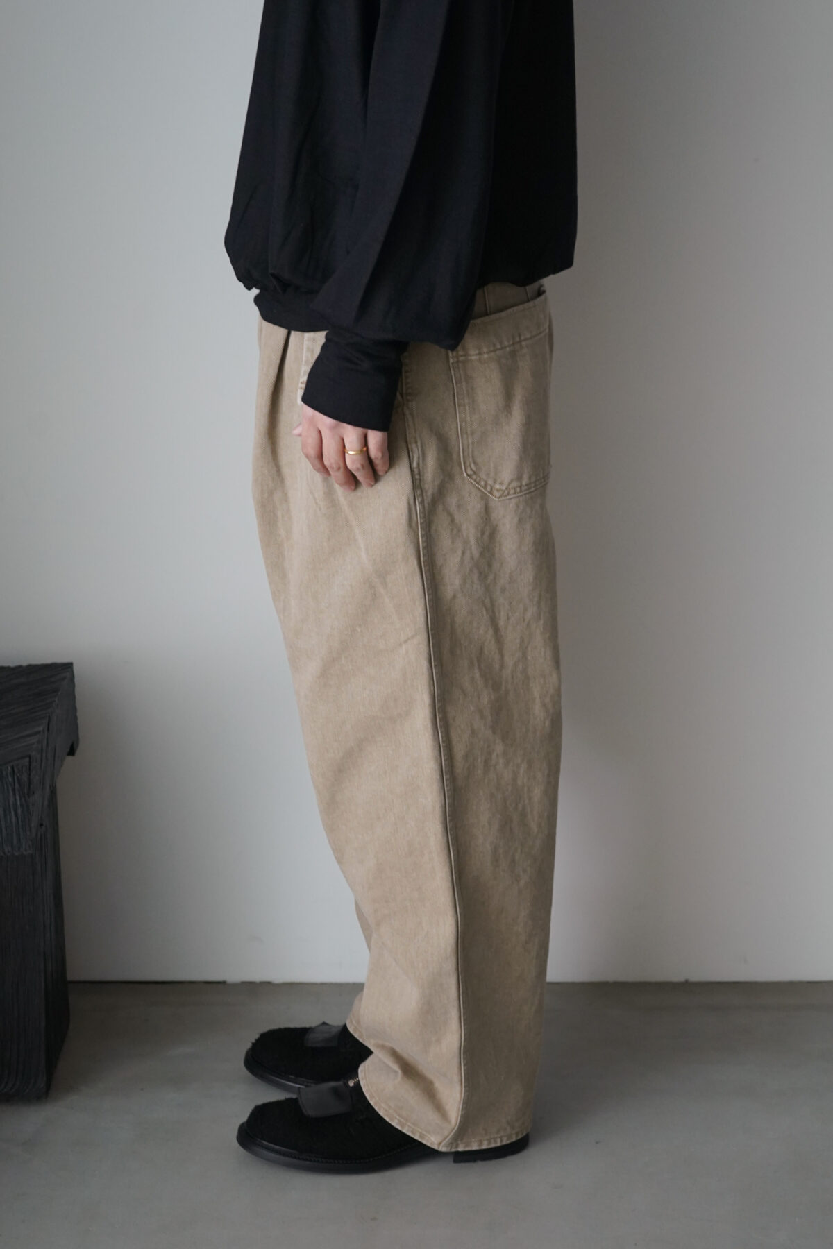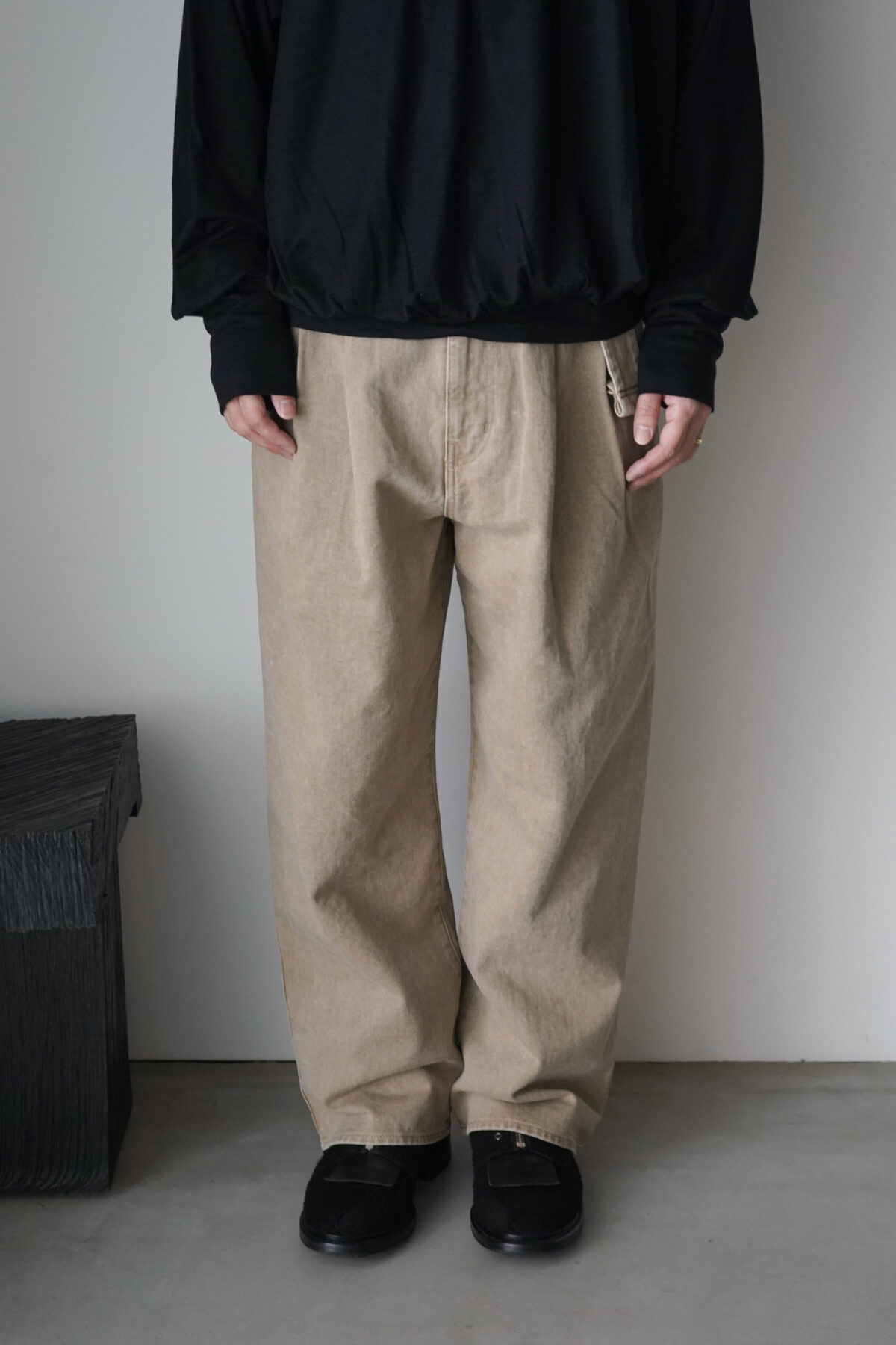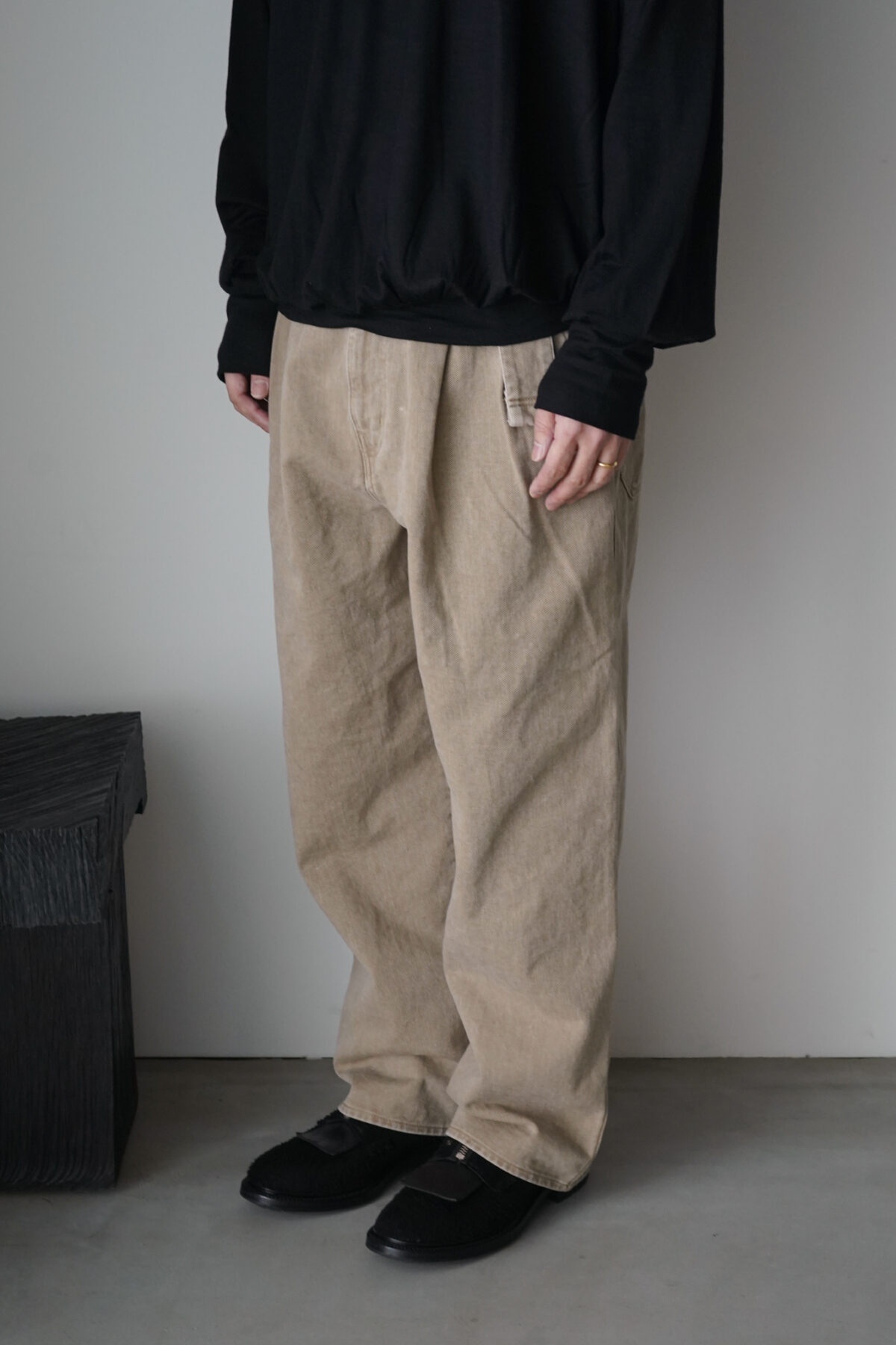 ウエストに2タックを入れ腰回りに程よいボリュームを持たせ汎用性の高いフォルムに。またツールバックのようなハンドルのベルトはフィット感が大変高く、デザイン性と日常的な履きやすさを兼ね備えたディテールです。硫化染料で染められたブラックと、ベージュに洗いをかけ色味のフェードやあたりが付けられています。