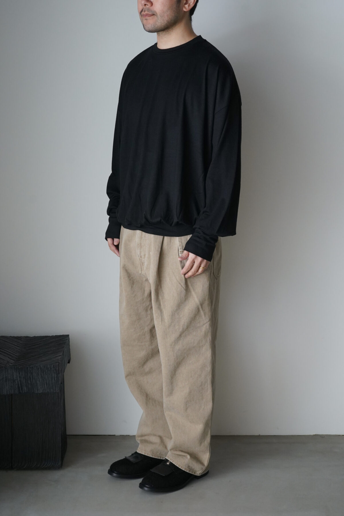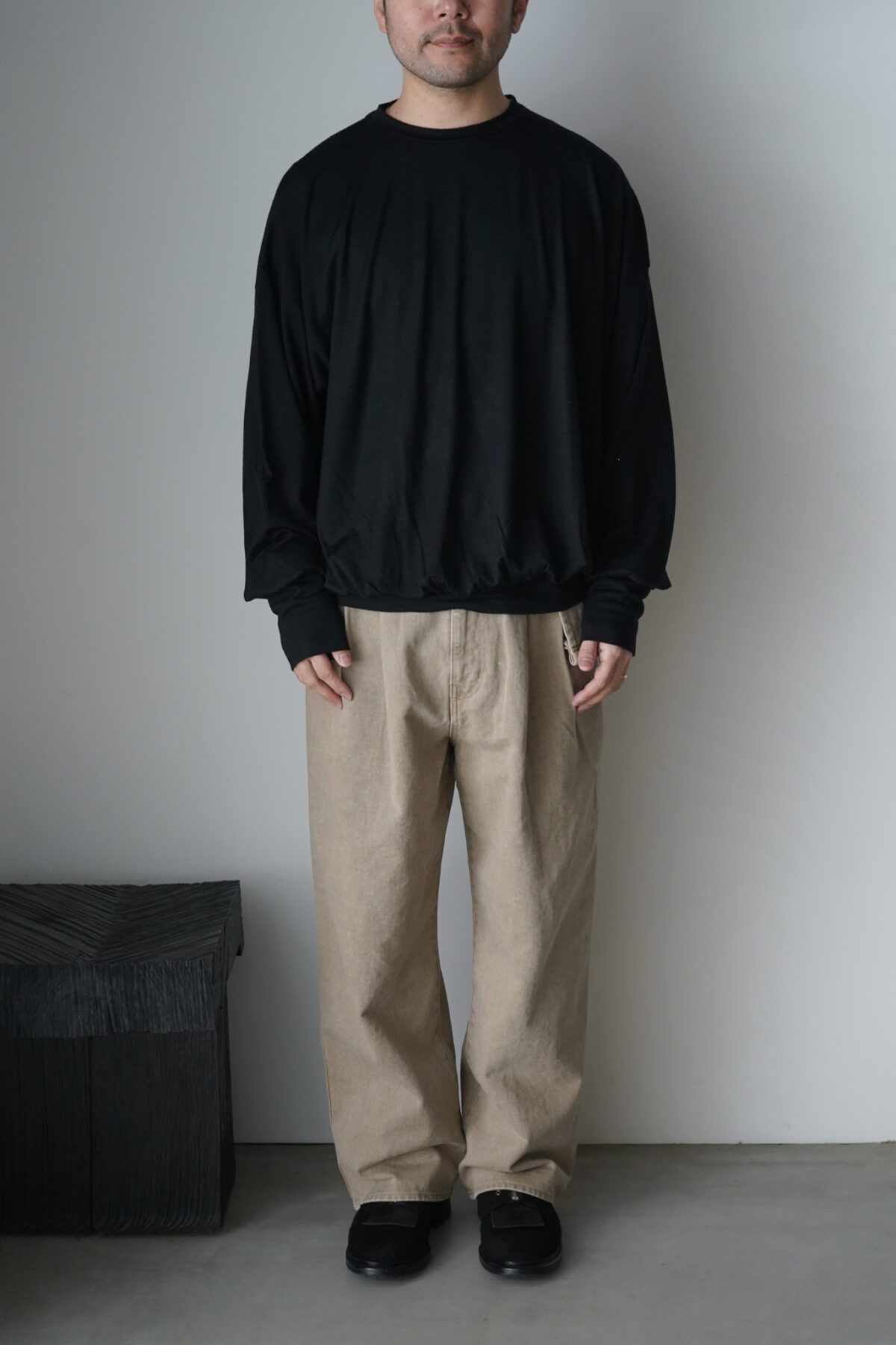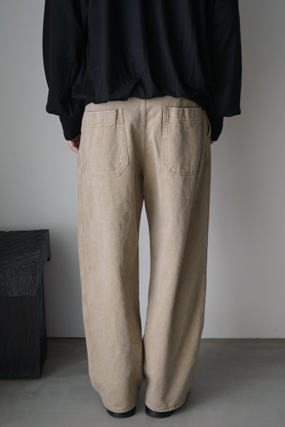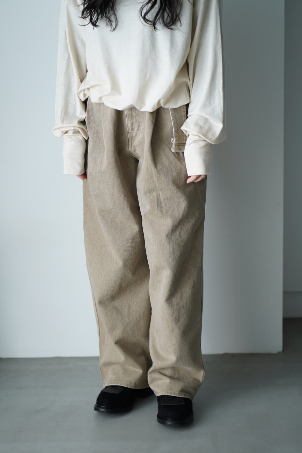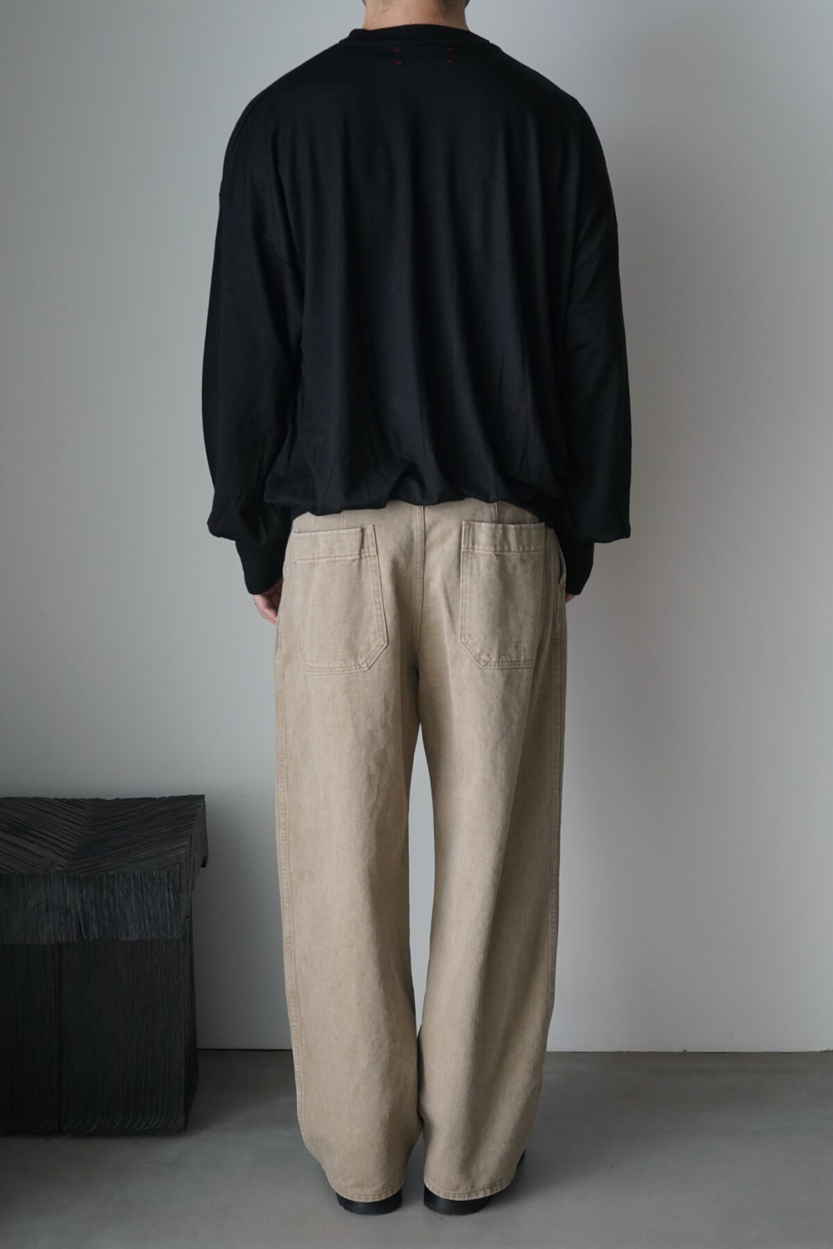 ウエストに2タックを入れ腰回りに程よいボリュームを持たせ汎用性の高いフォルムに。またツールバックのようなハンドルのベルトはフィット感が大変高く、デザイン性と日常的な履きやすさを兼ね備えたディテールです。硫化染料で染められたブラックと、ベージュに洗いをかけ色味のフェードやあたりが付けられています。