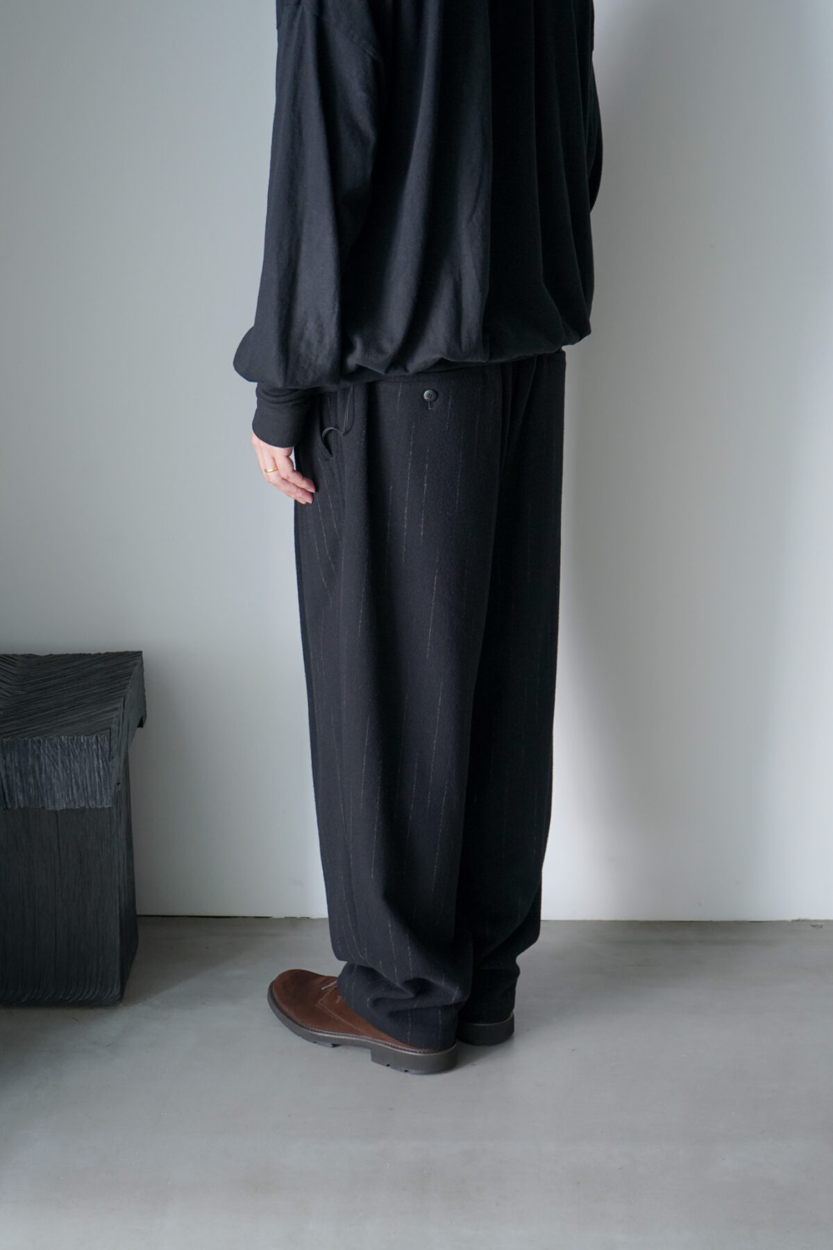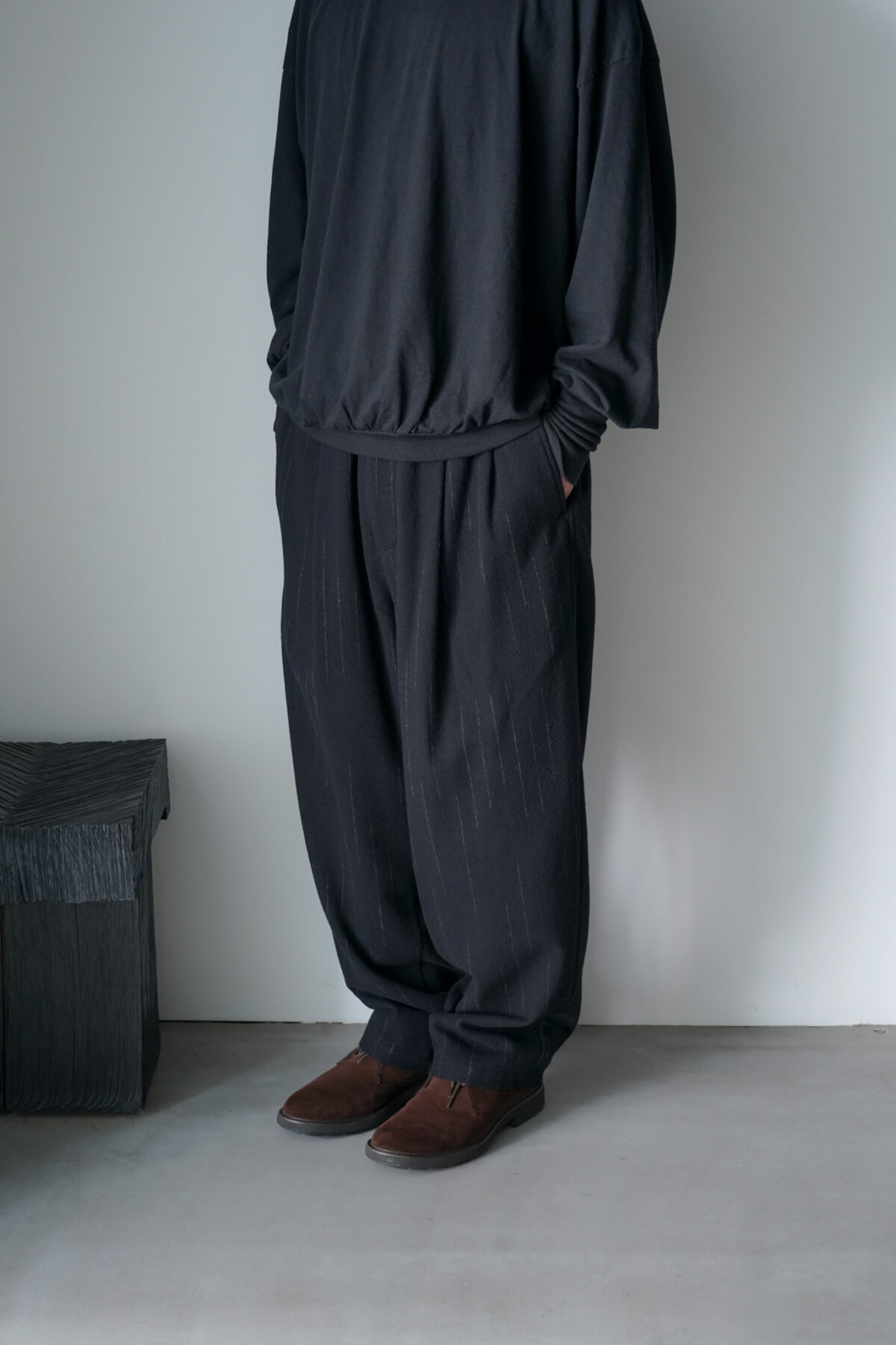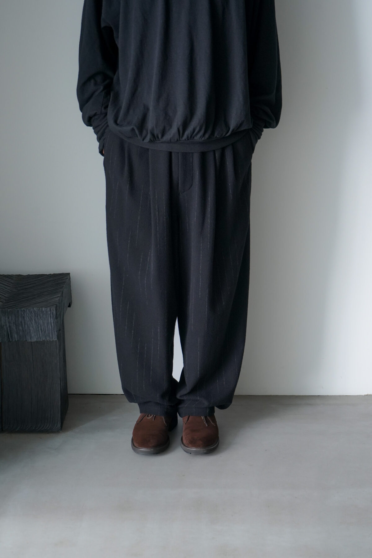 イージーパンツで有りながら、あたかも上品なスラックスを履いているかの様な品のあるルックスです。