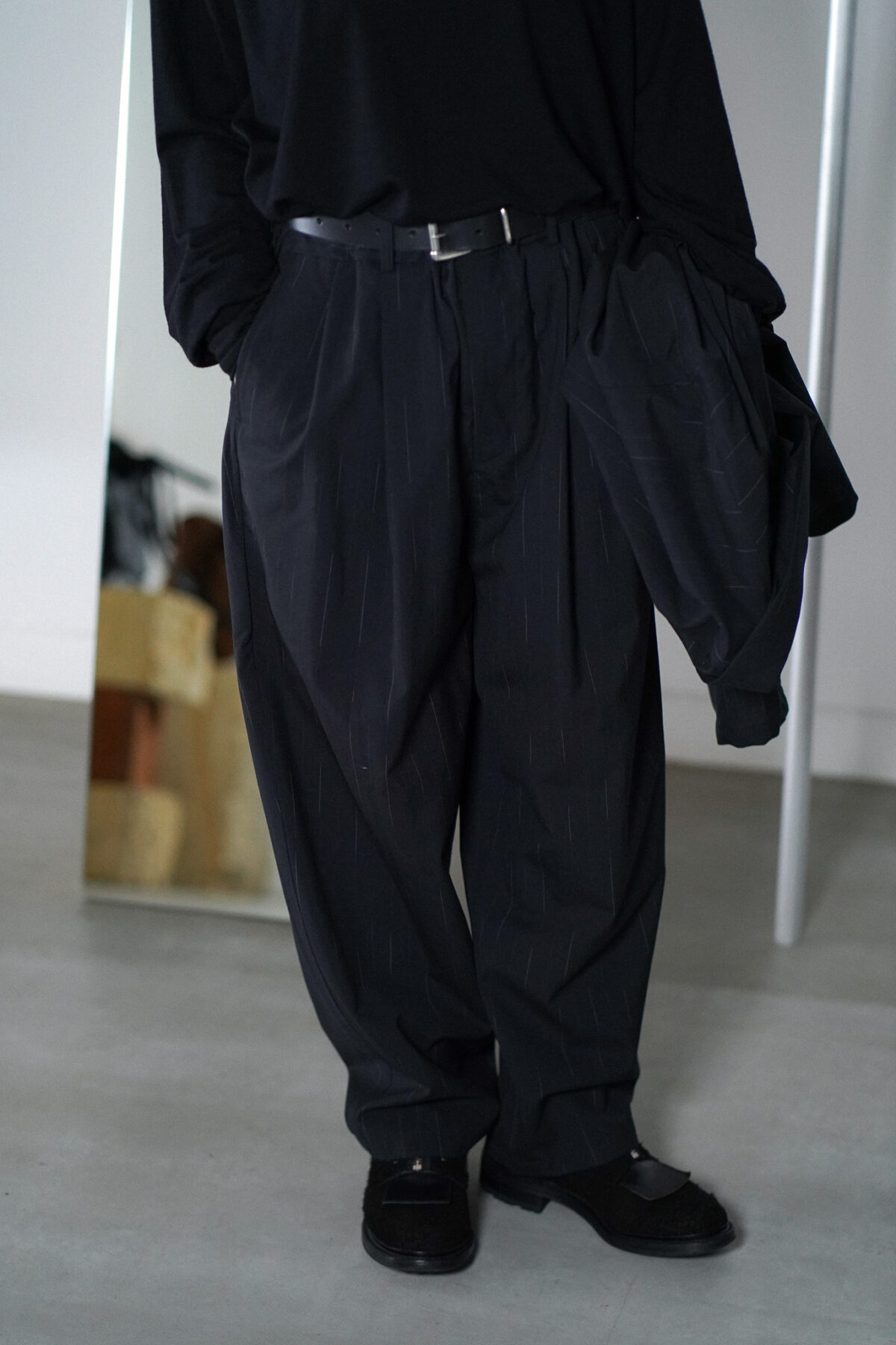 YOKO SAKAMOTO DOUBLE PLEATED WIDE EASY PANTS - WOOL KASURI STRIPE - BLACK