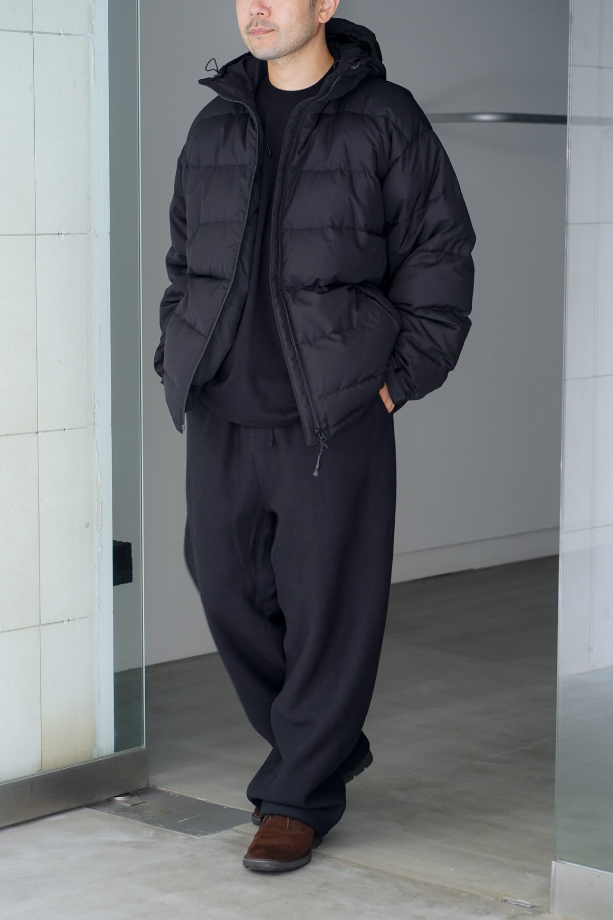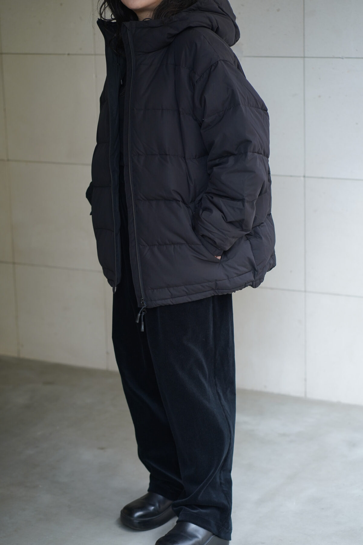 フードのドローコード、裾のドローコードを絞る事で、ニュアンスの効いたスタイリングが可能。