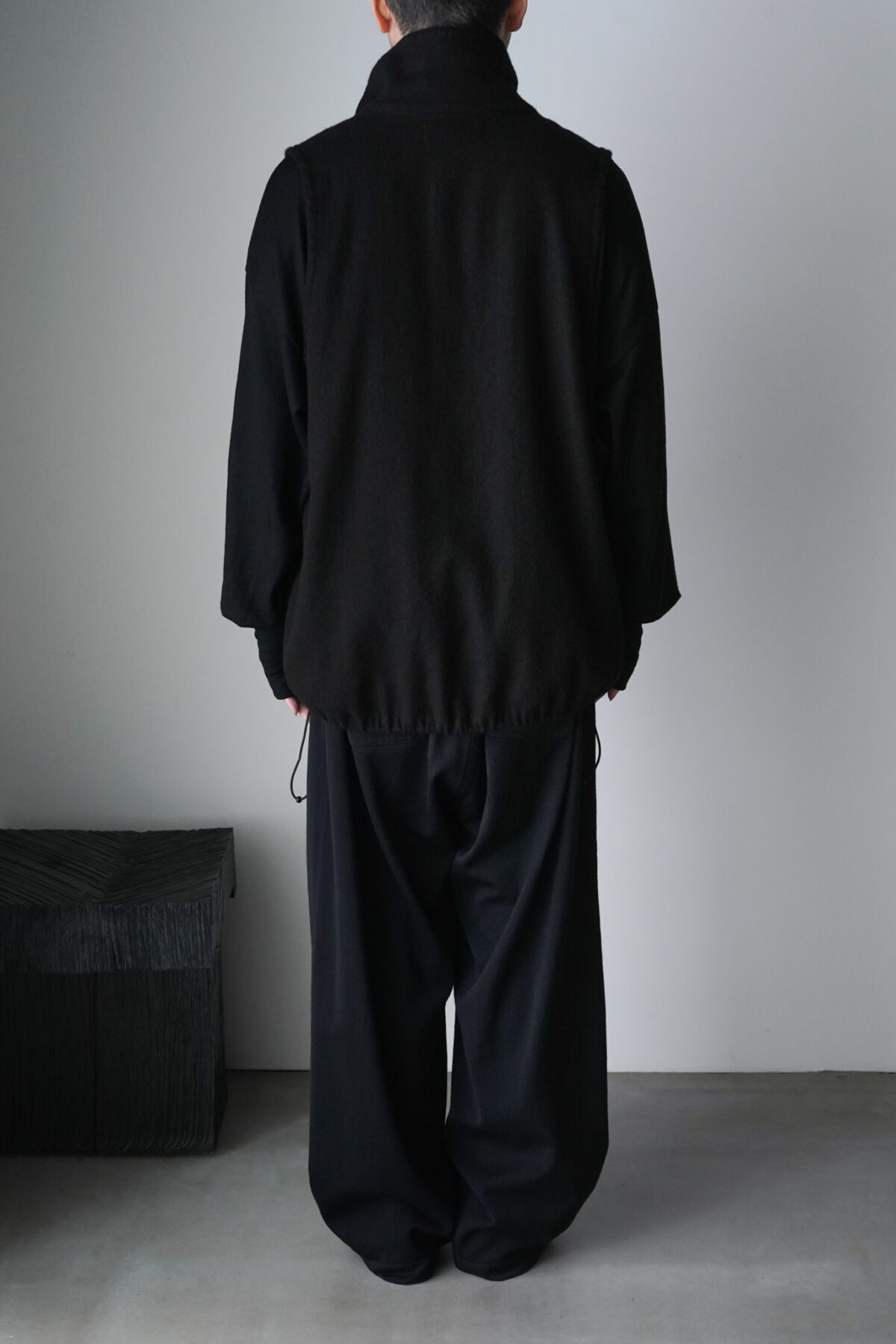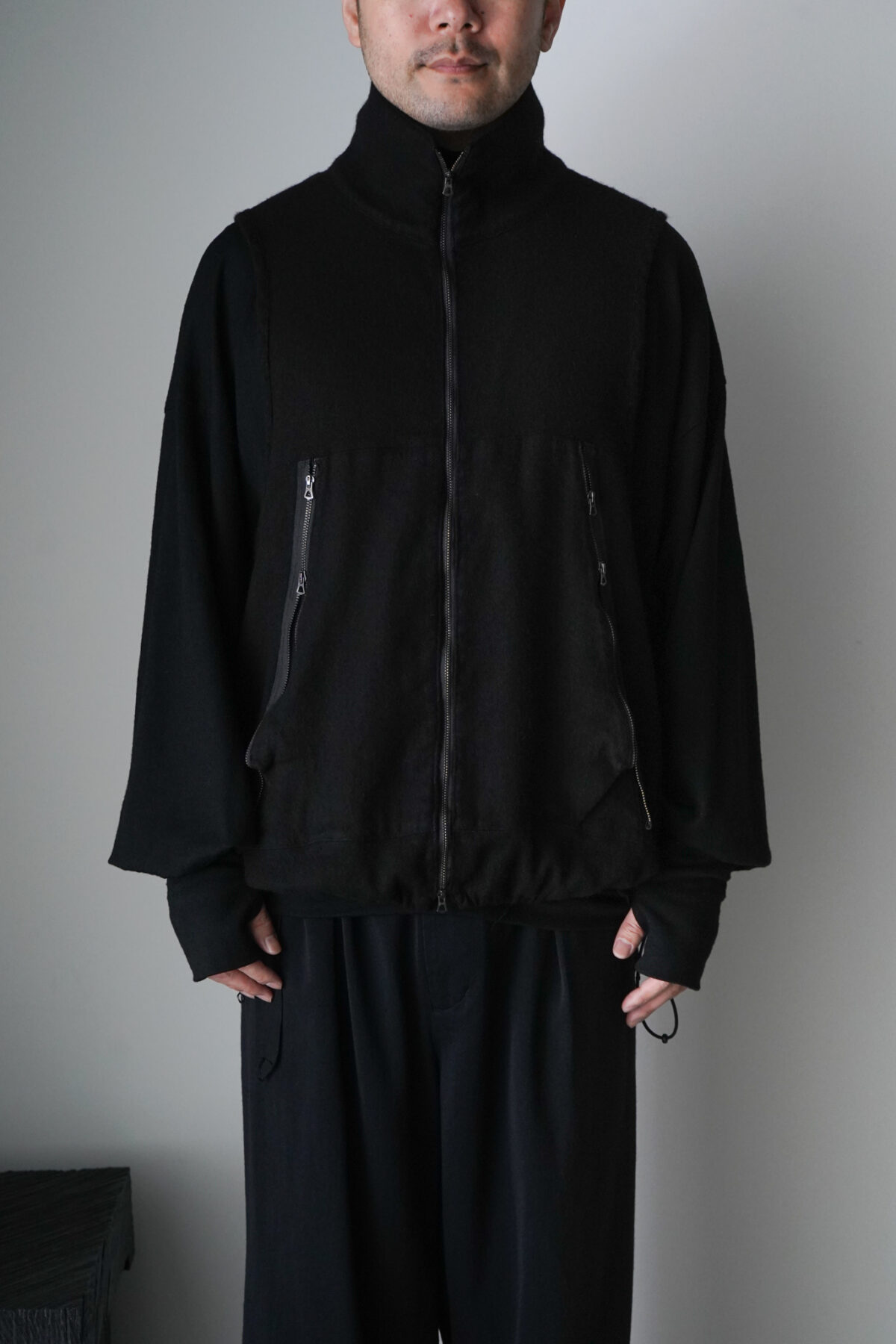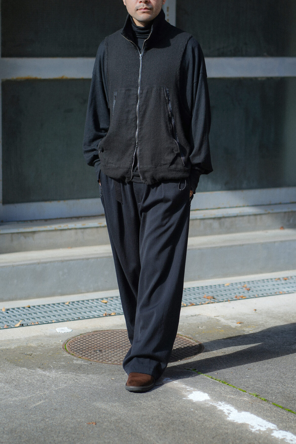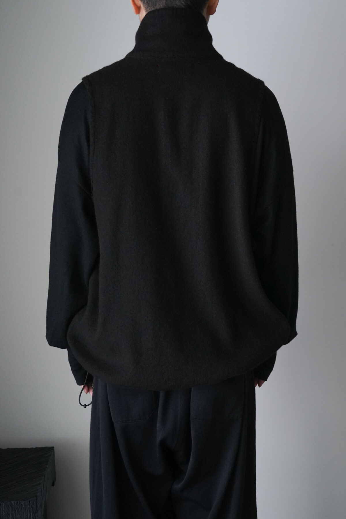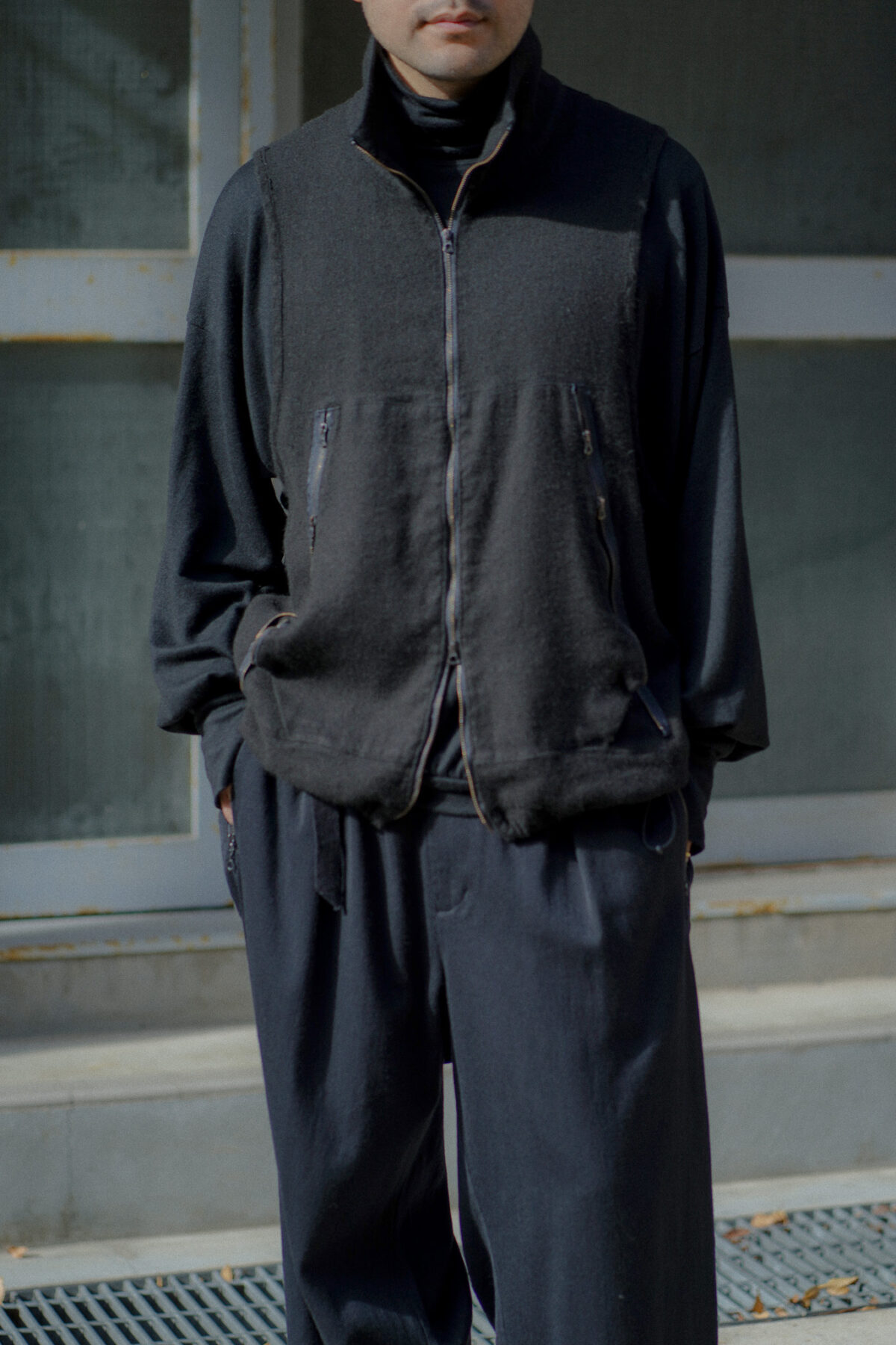 アウトでもインでも着用したくなるデザインのベスト、素材は経年で無数の毛玉やカシミヤが噴き出してくる、藻を張ったようなカシミヤ/リネンです。見た目以上に軽く且つ暖かさ、温もりがあります。鈍い製品染めブラックに品のある毛羽立ちは、一見で印象を残す空気感を持っています。