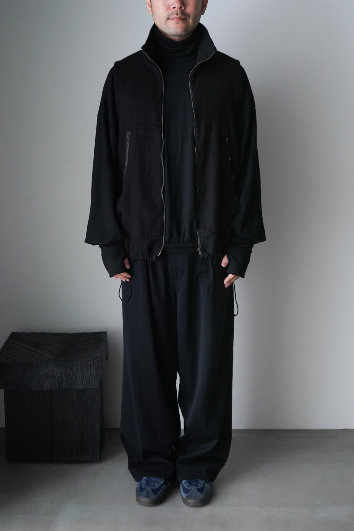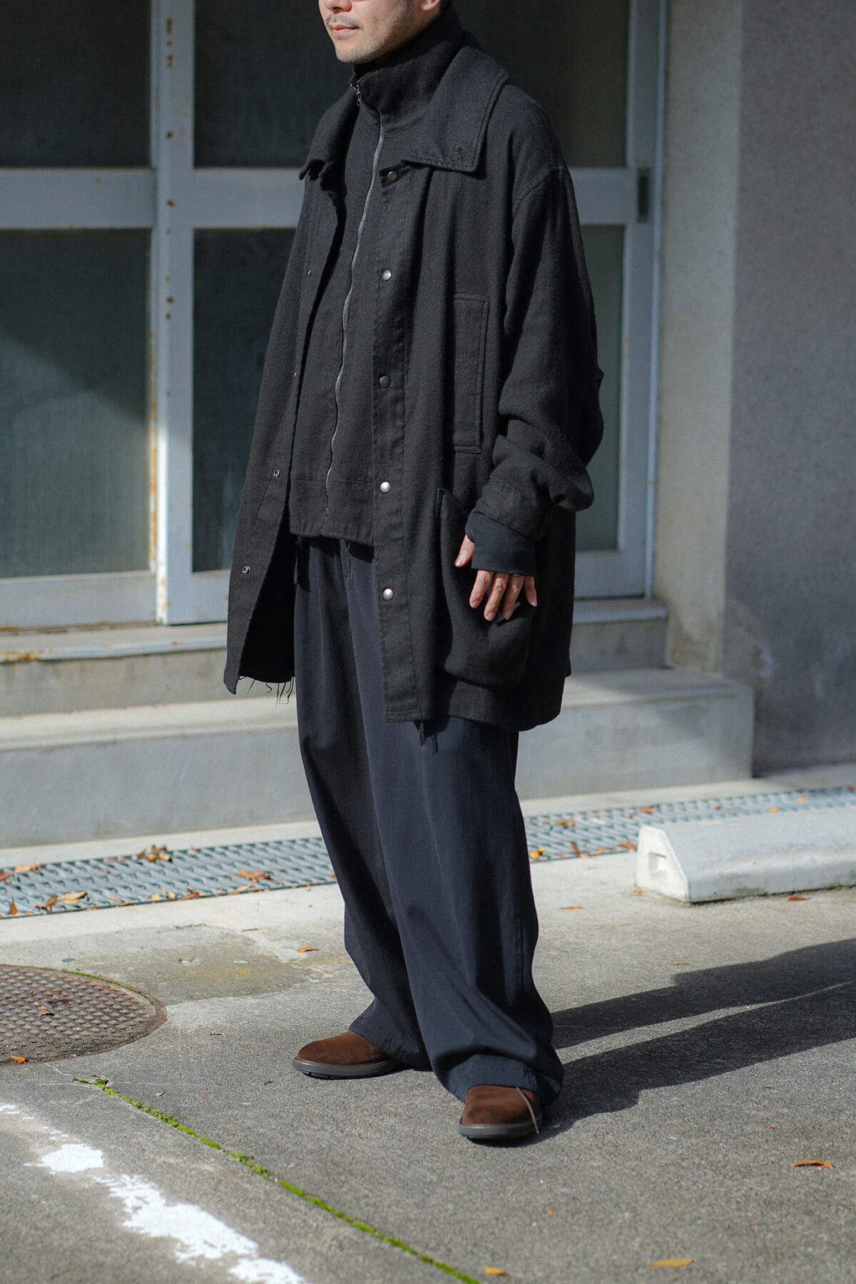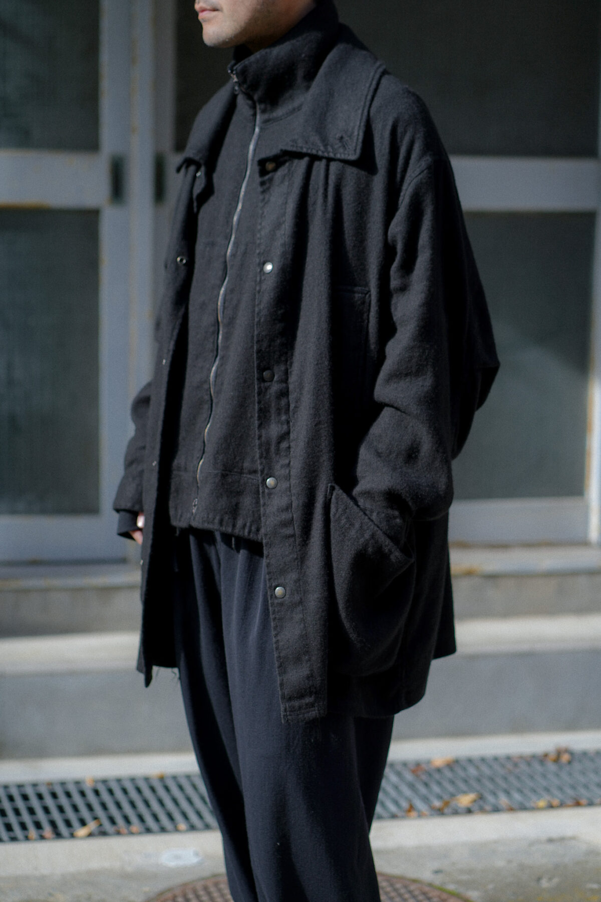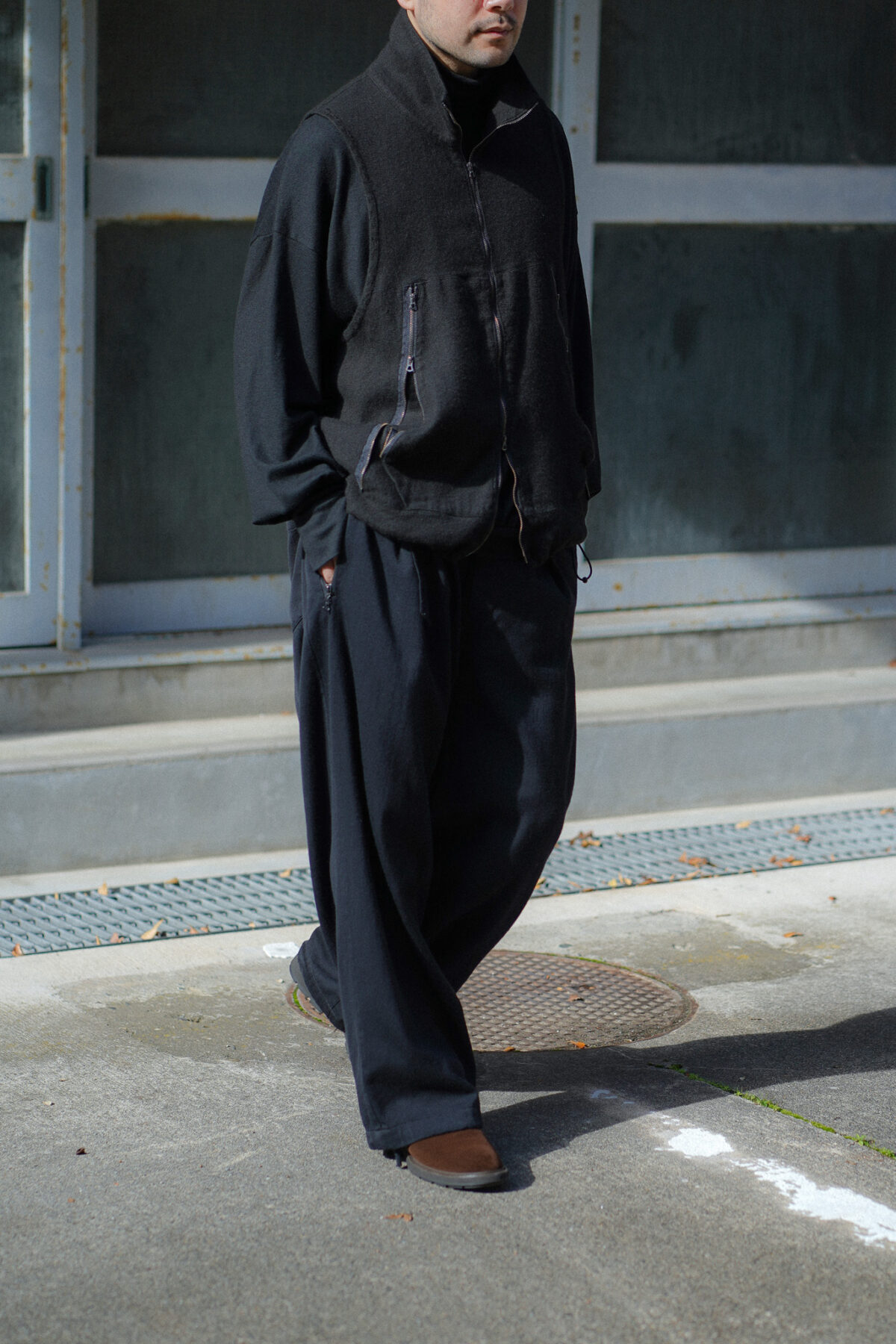 アウトでもインでも着用したくなるデザインのベスト、素材は経年で無数の毛玉やカシミヤが噴き出してくる、藻を張ったようなカシミヤ/リネンです。見た目以上に軽く且つ暖かさ、温もりがあります。鈍い製品染めブラックに品のある毛羽立ちは、一見で印象を残す空気感を持っています。
