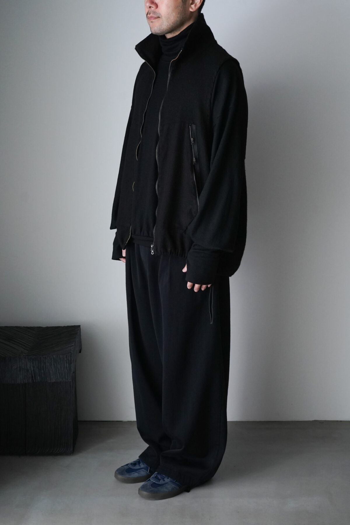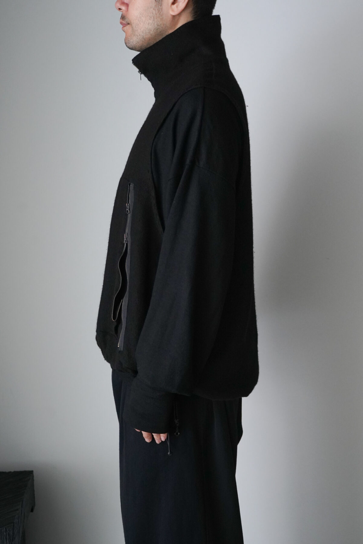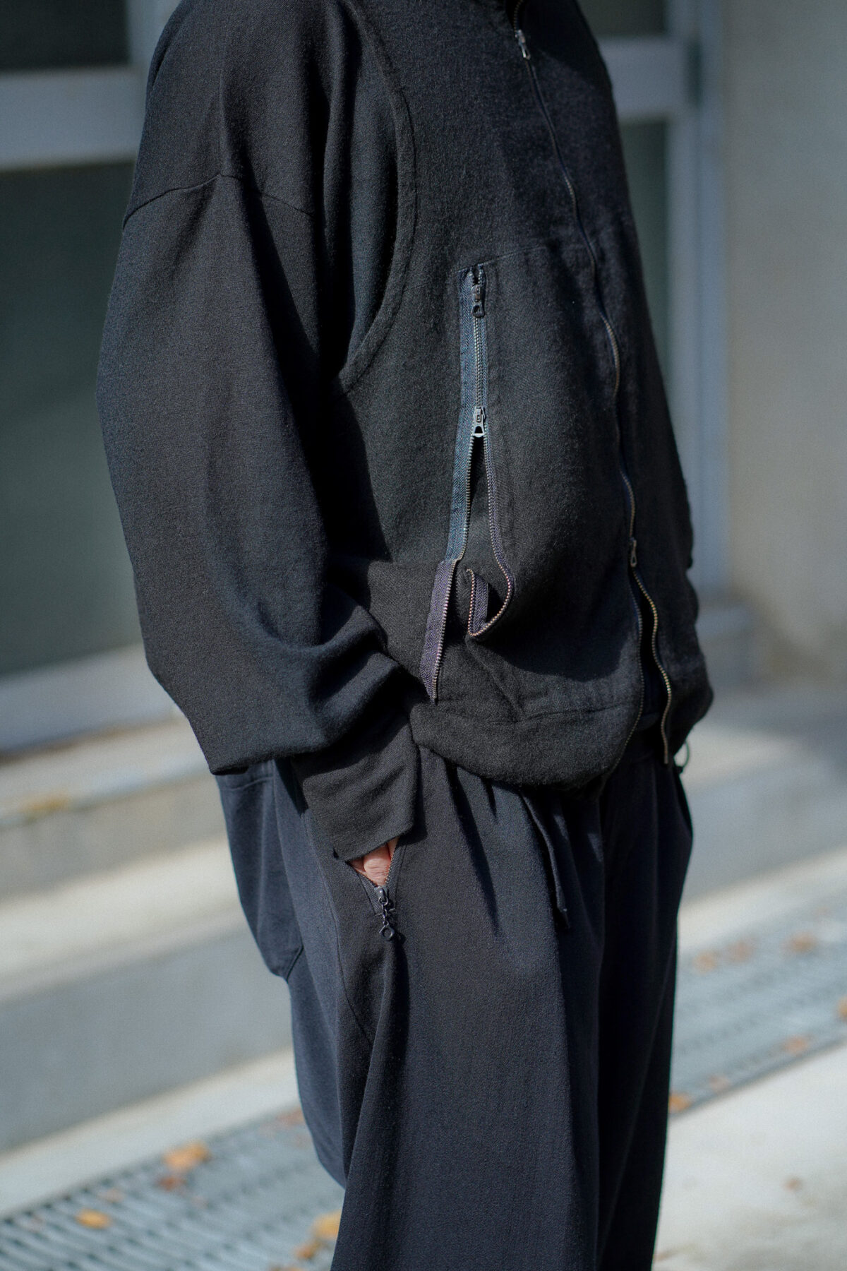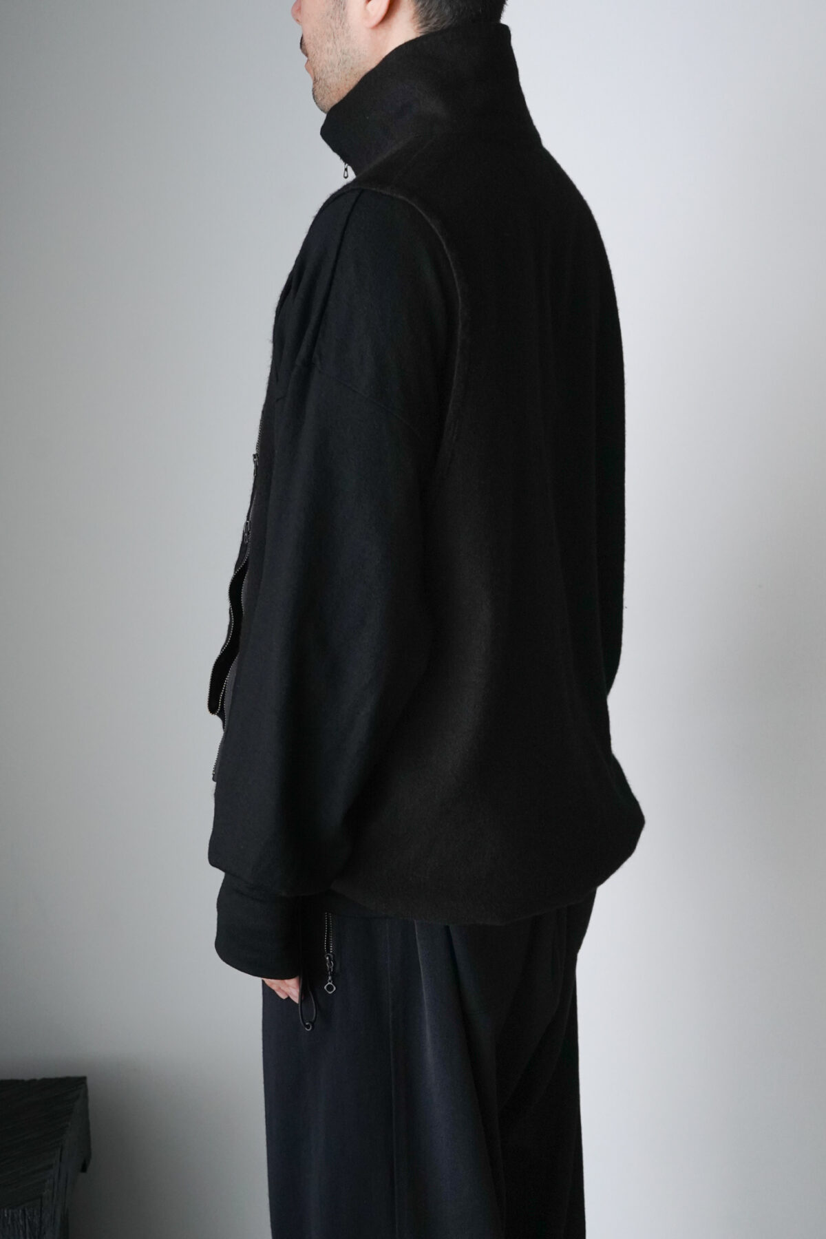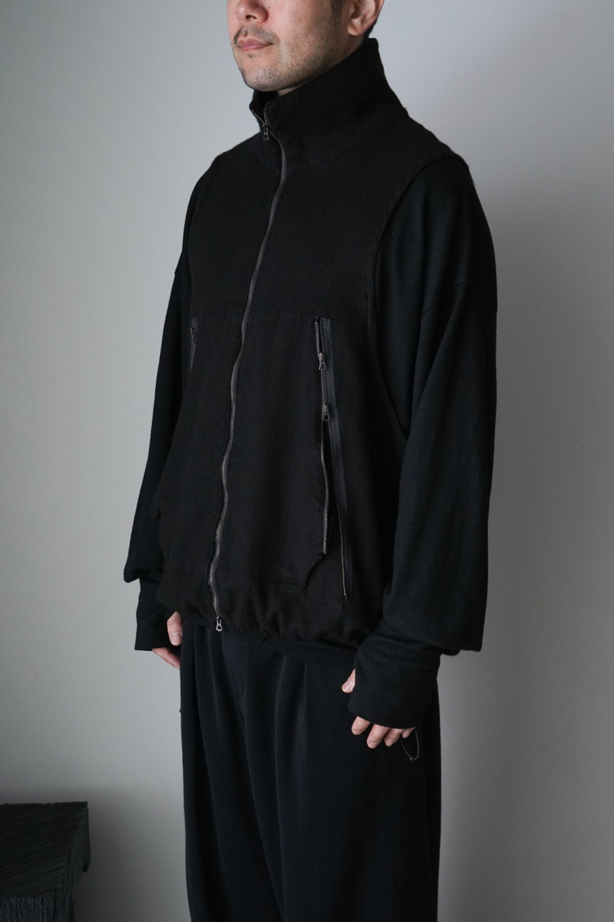 アウトでもインでも着用したくなるデザインのベスト、素材は経年で無数の毛玉やカシミヤが噴き出してくる、藻を張ったようなカシミヤ/リネンです。見た目以上に軽く且つ暖かさ、温もりがあります。鈍い製品染めブラックに品のある毛羽立ちは、一見で印象を残す空気感を持っています。