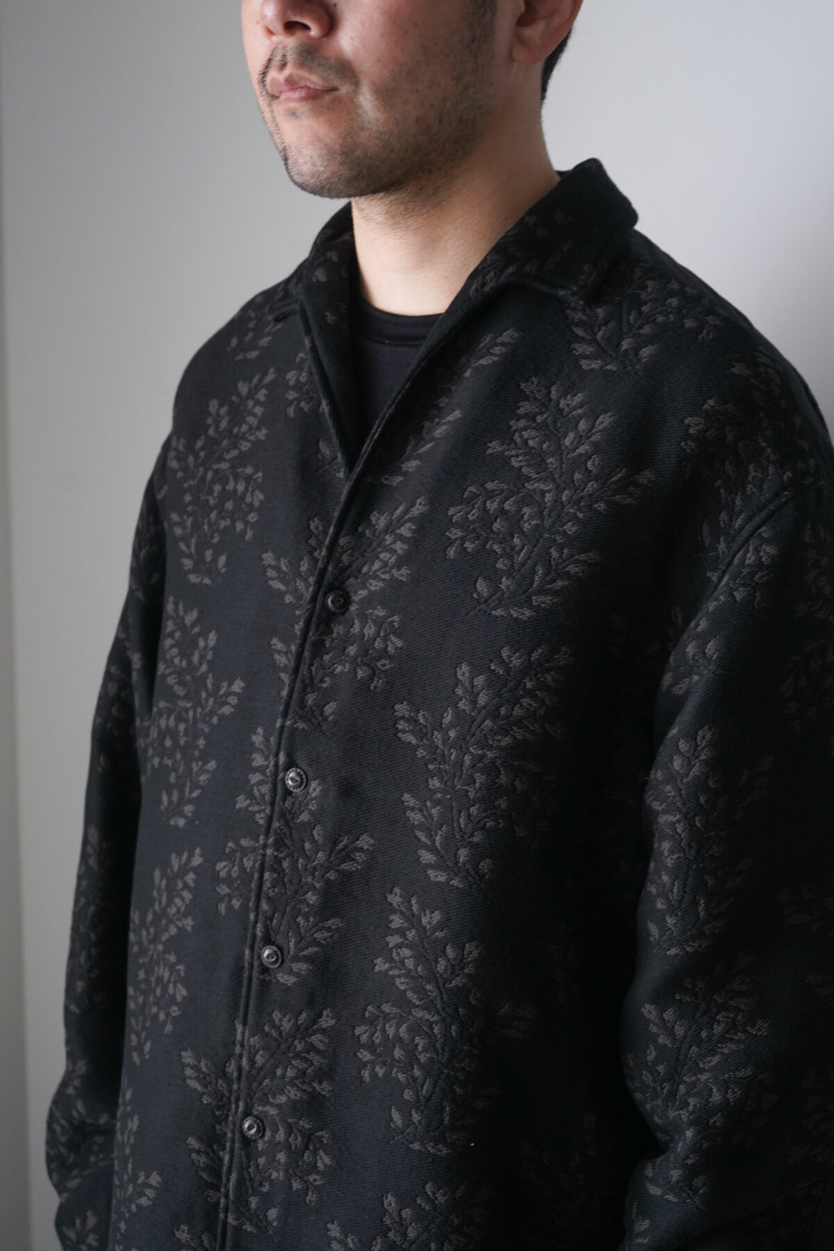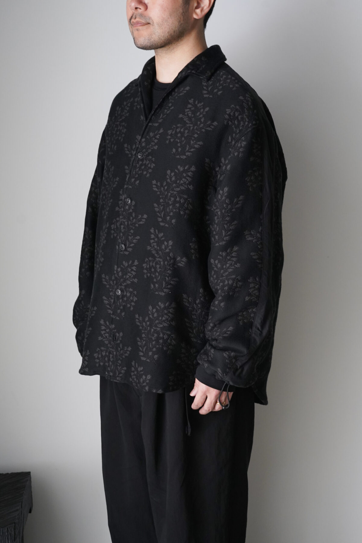 イタリアンカラーとオープンカラーがミックスされた印象的な襟元。