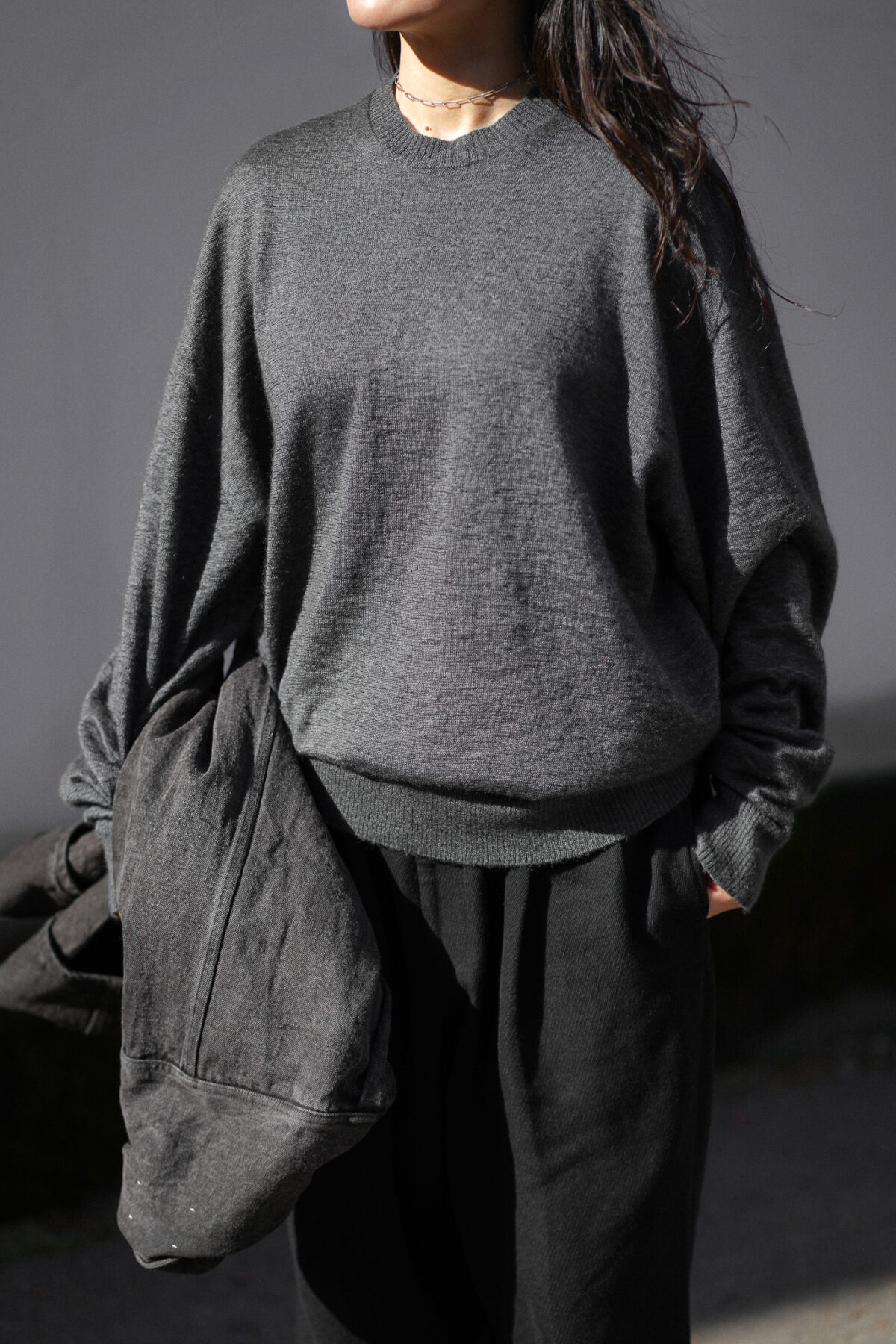 芯糸のシルクにエクストラキッドモヘアを巻き付けた特殊構造の糸 で編み立てたクルーネックプルオーバー。