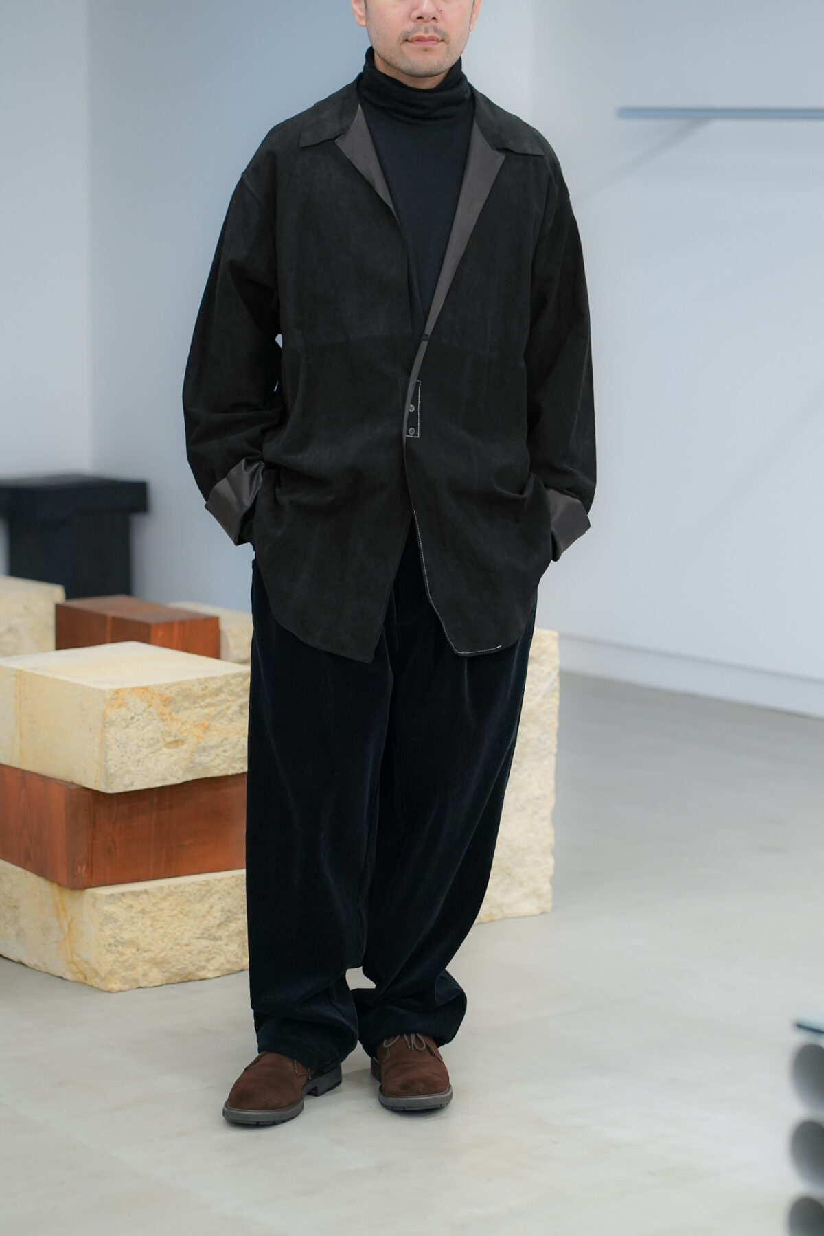 着丈が長く設定され羽織のような印象に、この着丈が個人的にしっくりきました。ばさっと羽織れるのは勿論のこと、例えばこの上にダウンなどのアウターを着用した時もレイヤーされたその見え方も良さそうです。シボ感のあるゴートレザーもとてもいい表情。手数は抑えられたデザインながらも、ステッチの配色やレザー銀面が襟口や袖から見えることで良いアクセントになっており、存在感ある一枚に仕上がっています。
