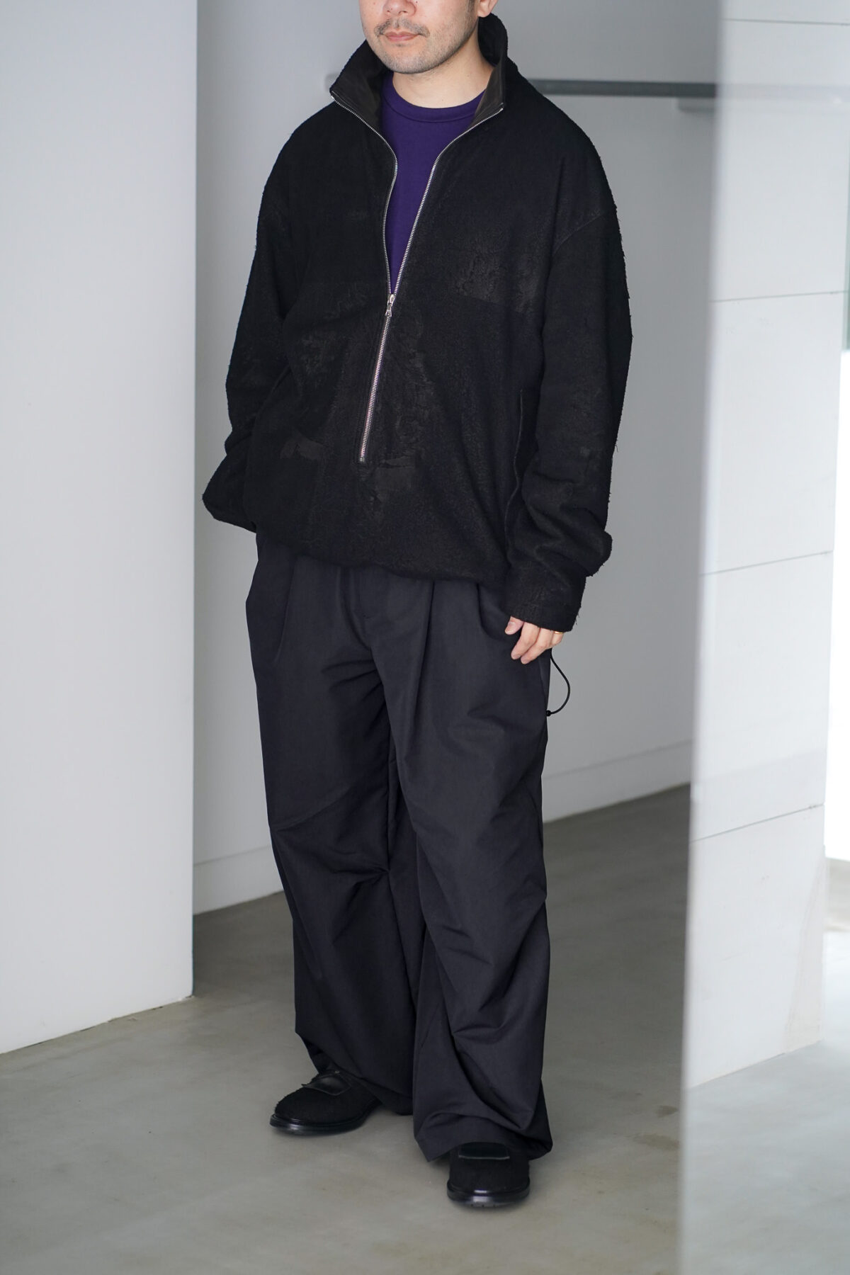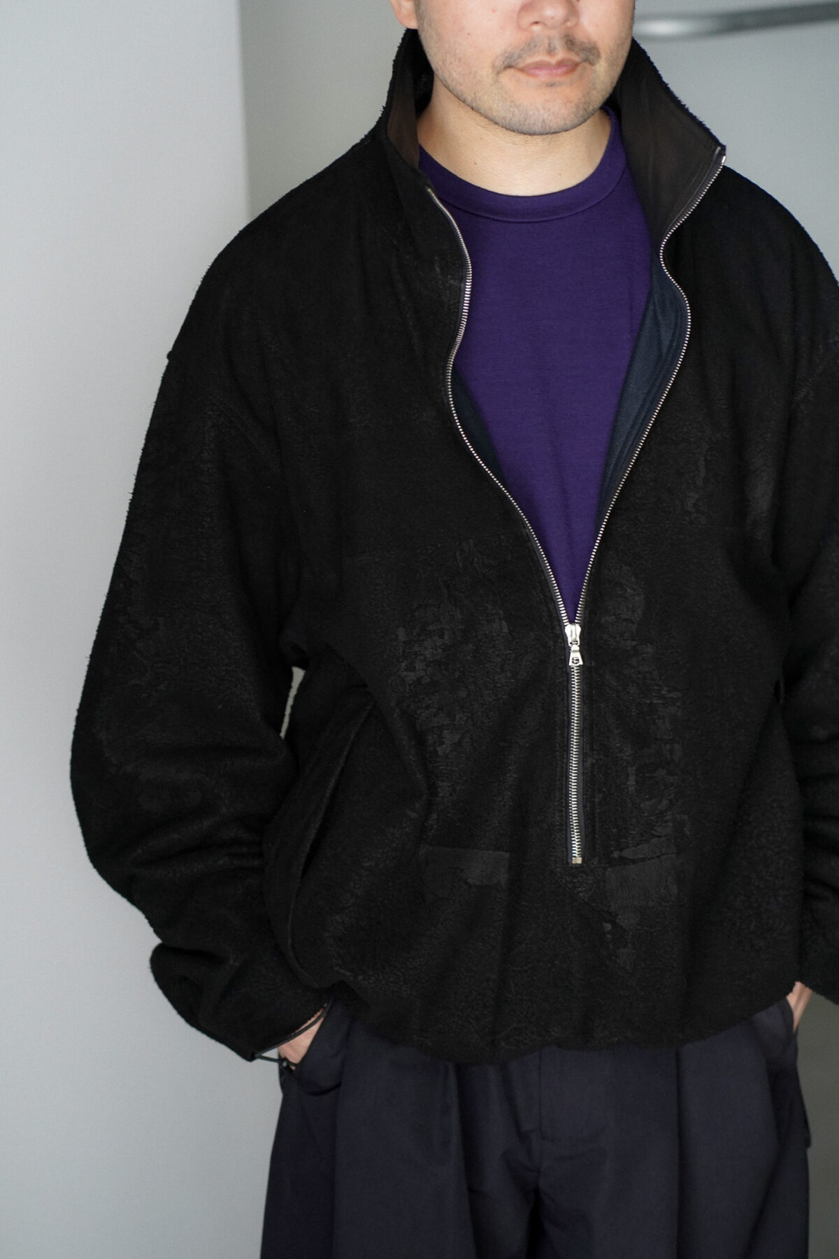 毛足荒めのカンガルーレザーニベが使用されたプルオーバー、粗野さとクリーンな印象が混在するブランドらしい仕上がり。見た目以上に軽く、しなやかで裏地には機能性トリコットが採用されています。程よく暖かく、また軽さもあるので快適にご着用いただけます。深いフロントジップはririを使用。