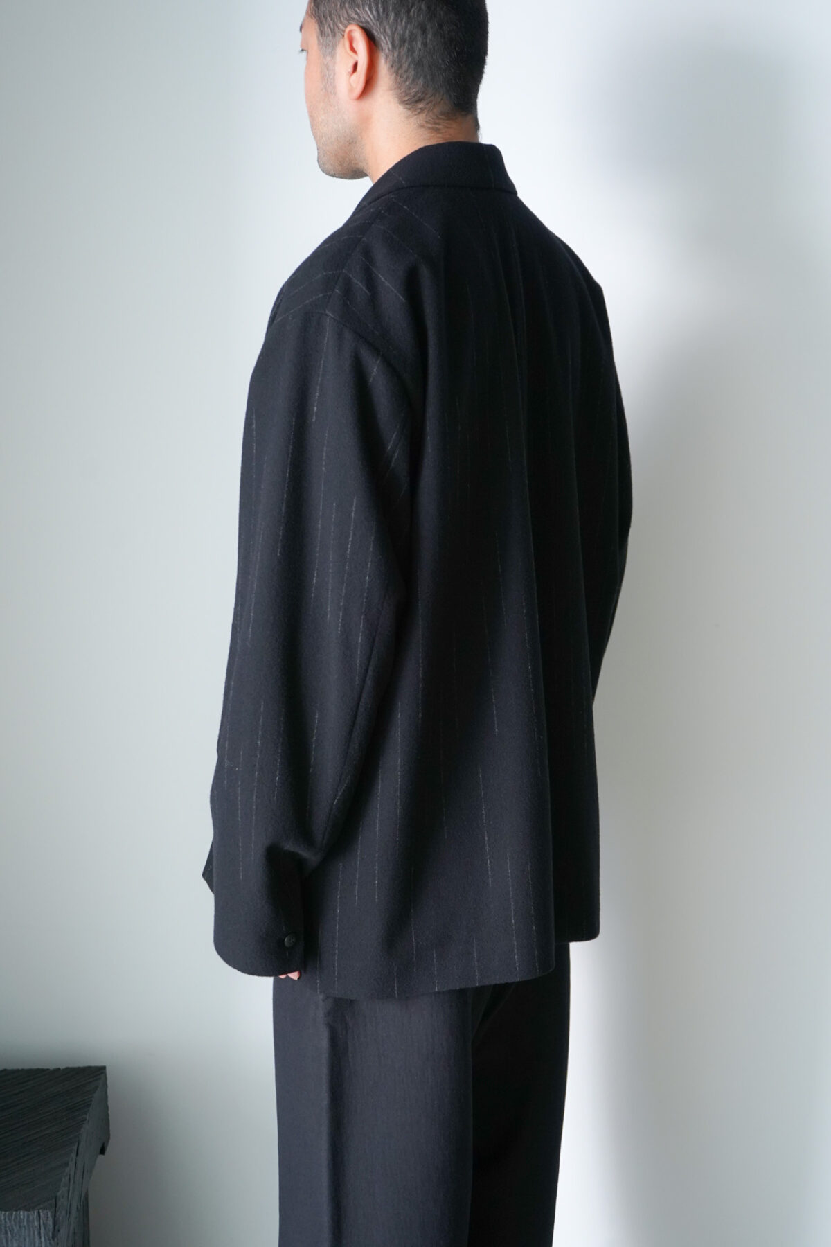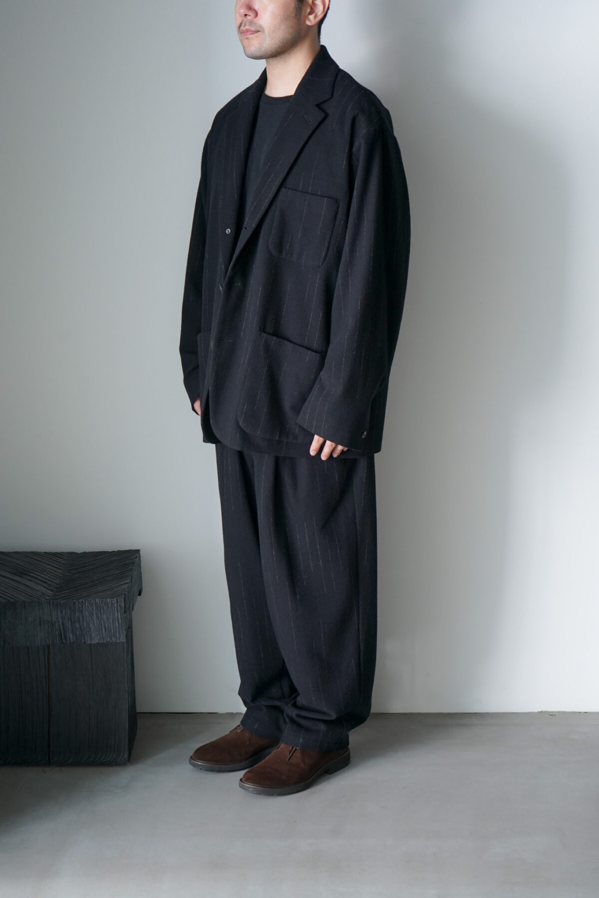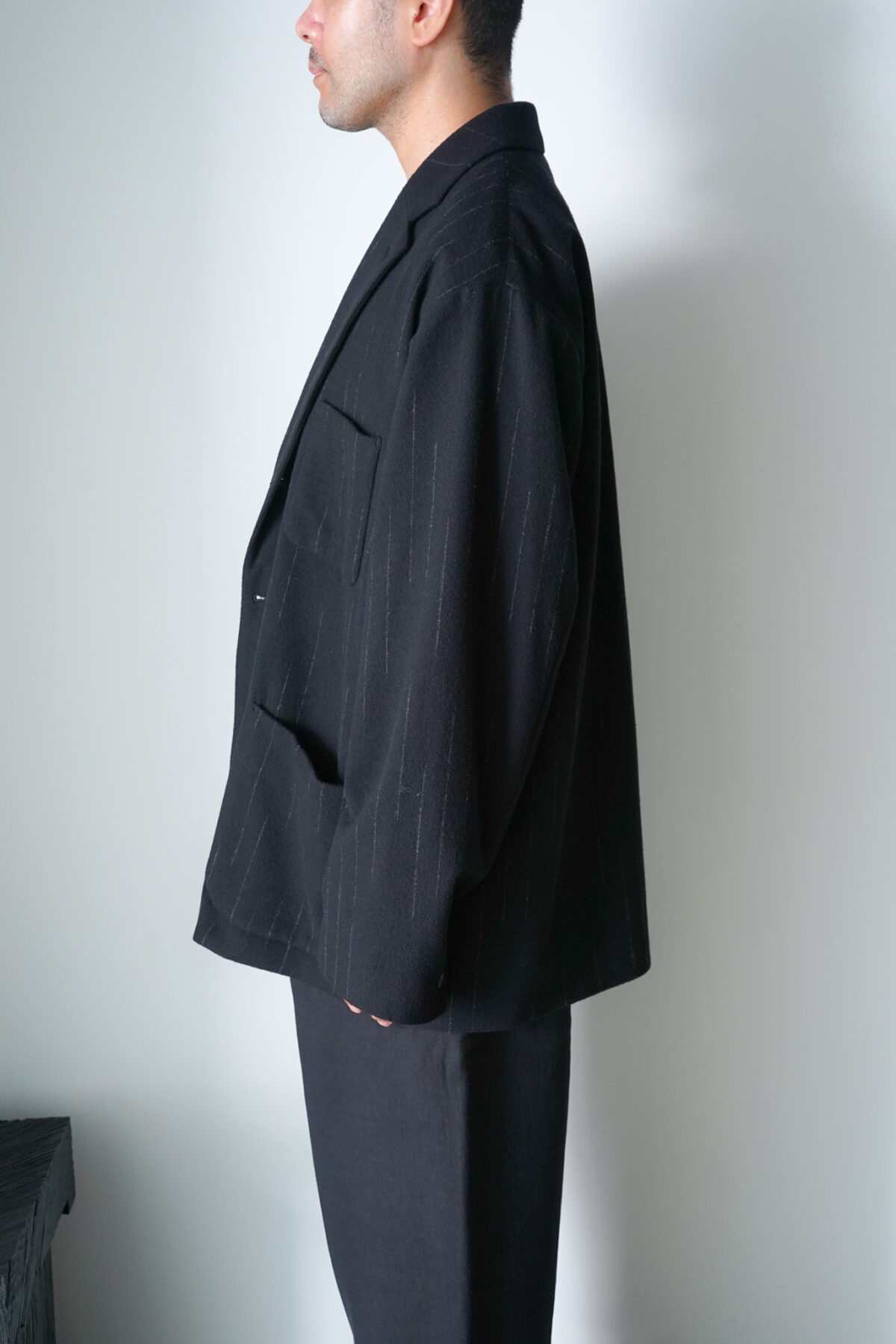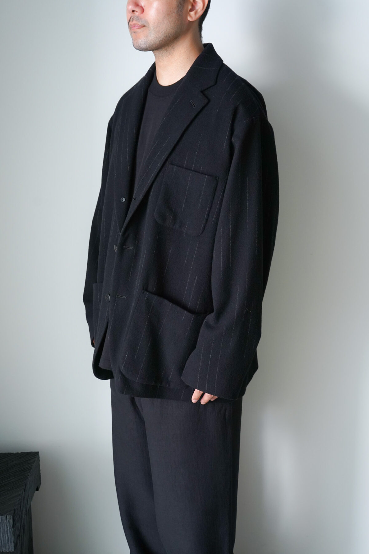 DOUBLE PLEATED WIDE EASY PANTS – KASURI STRIPE – と同素材、セットアップで着用可能です。