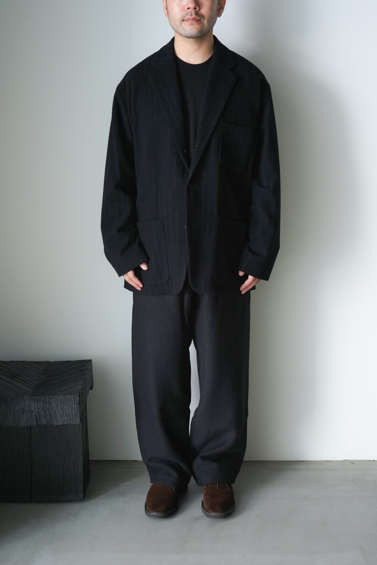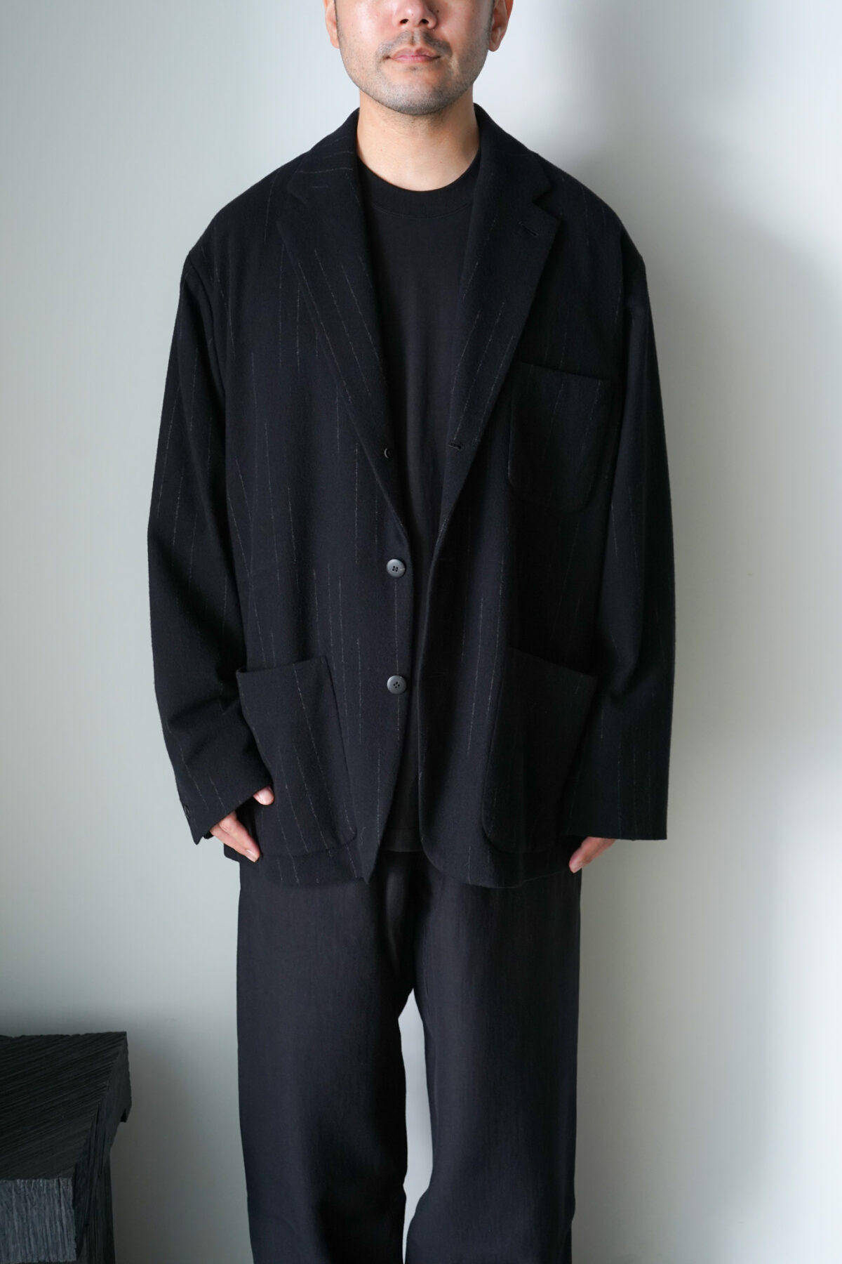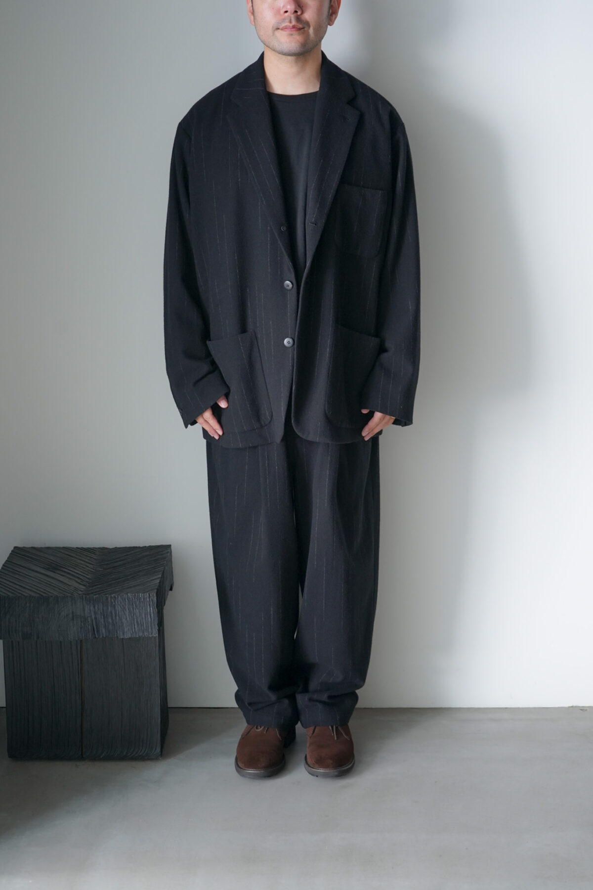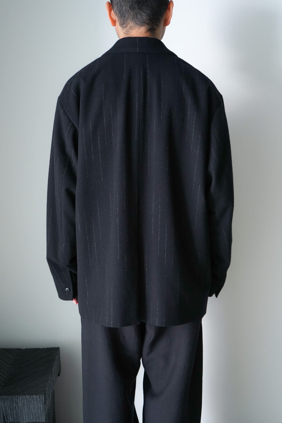 DOUBLE PLEATED WIDE EASY PANTS – KASURI STRIPE – と同素材、セットアップで着用可能です。