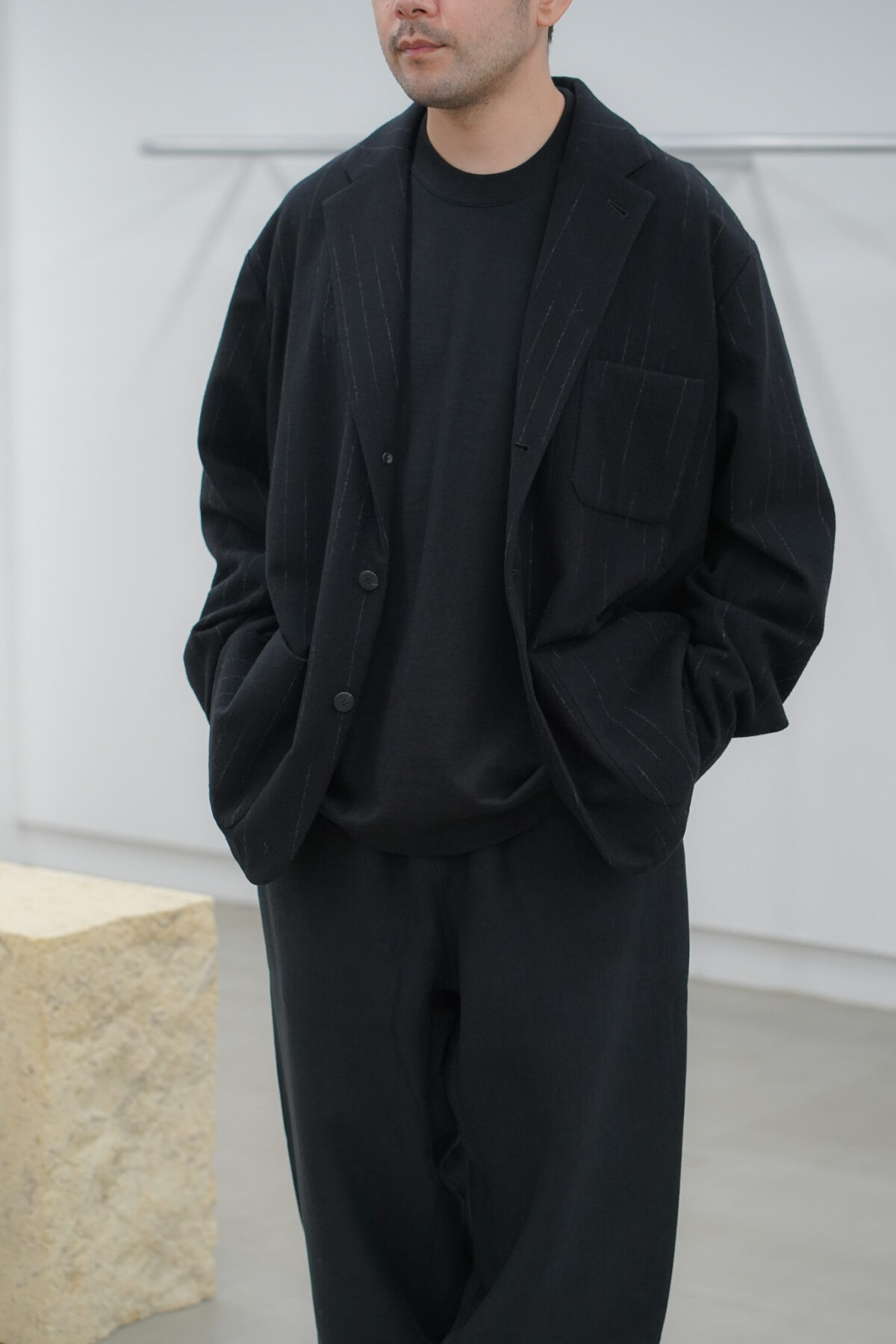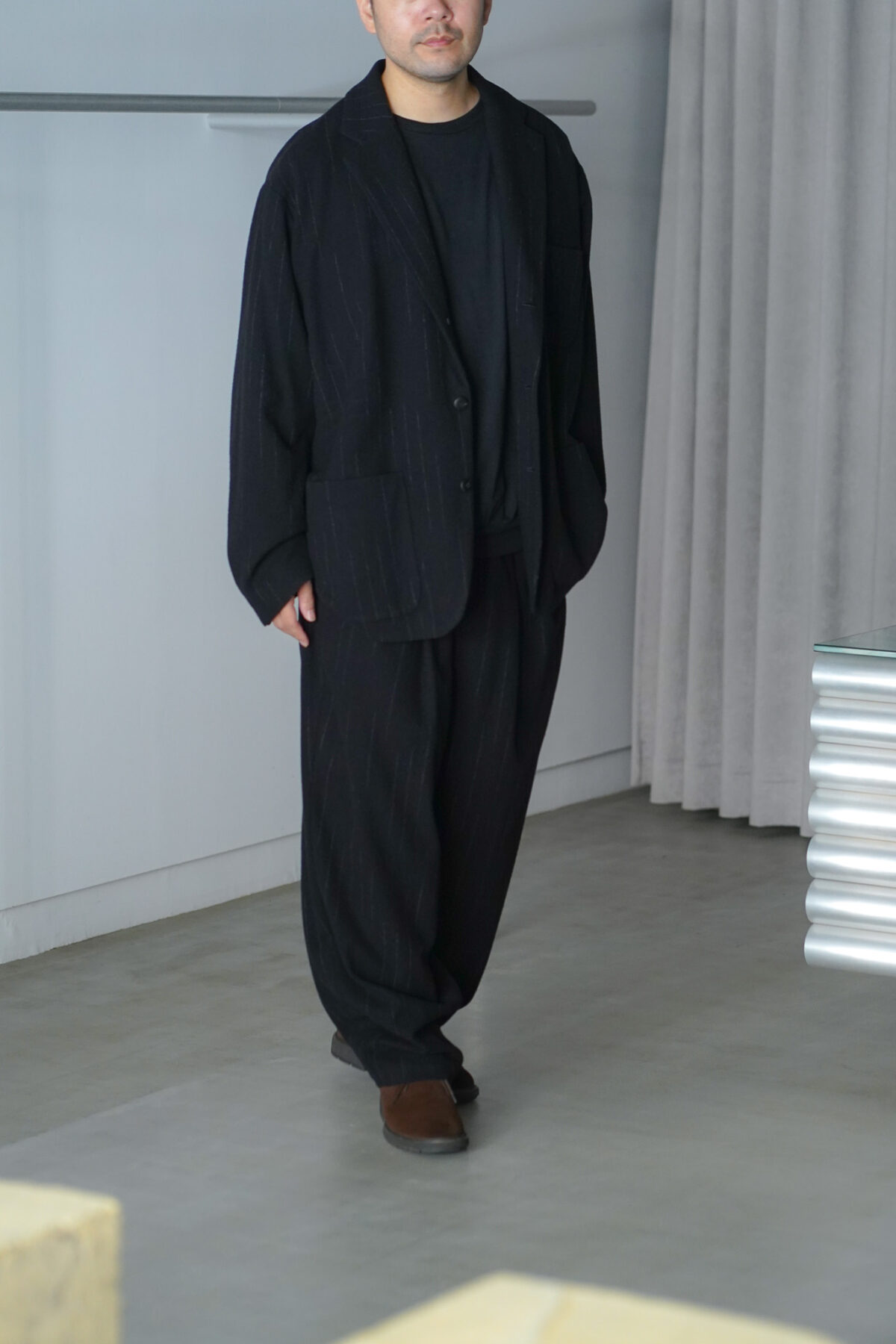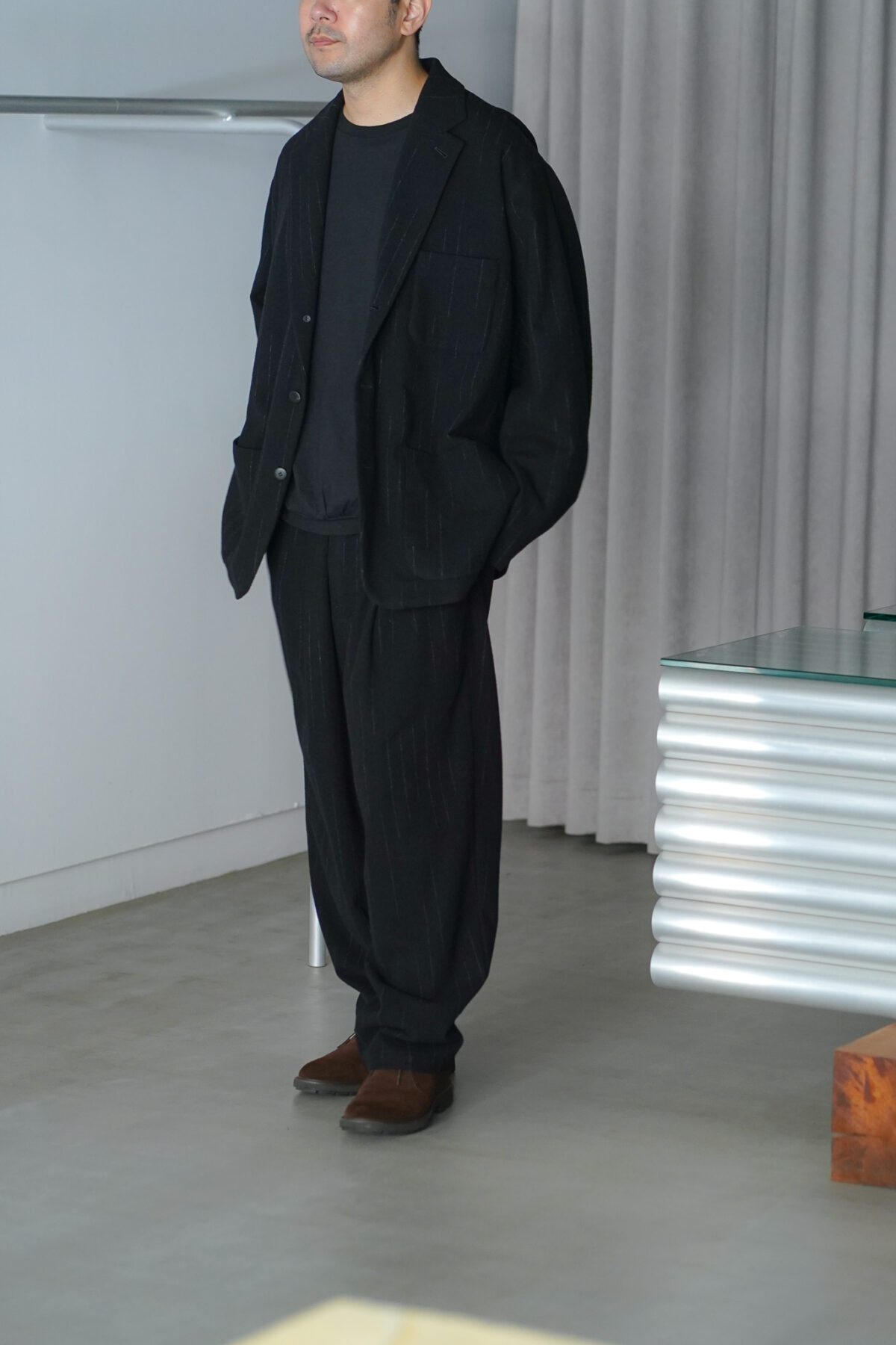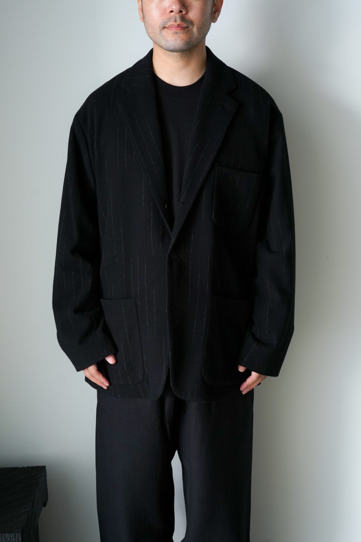 DOUBLE PLEATED WIDE EASY PANTS – KASURI STRIPE – と同素材、セットアップで着用可能です。