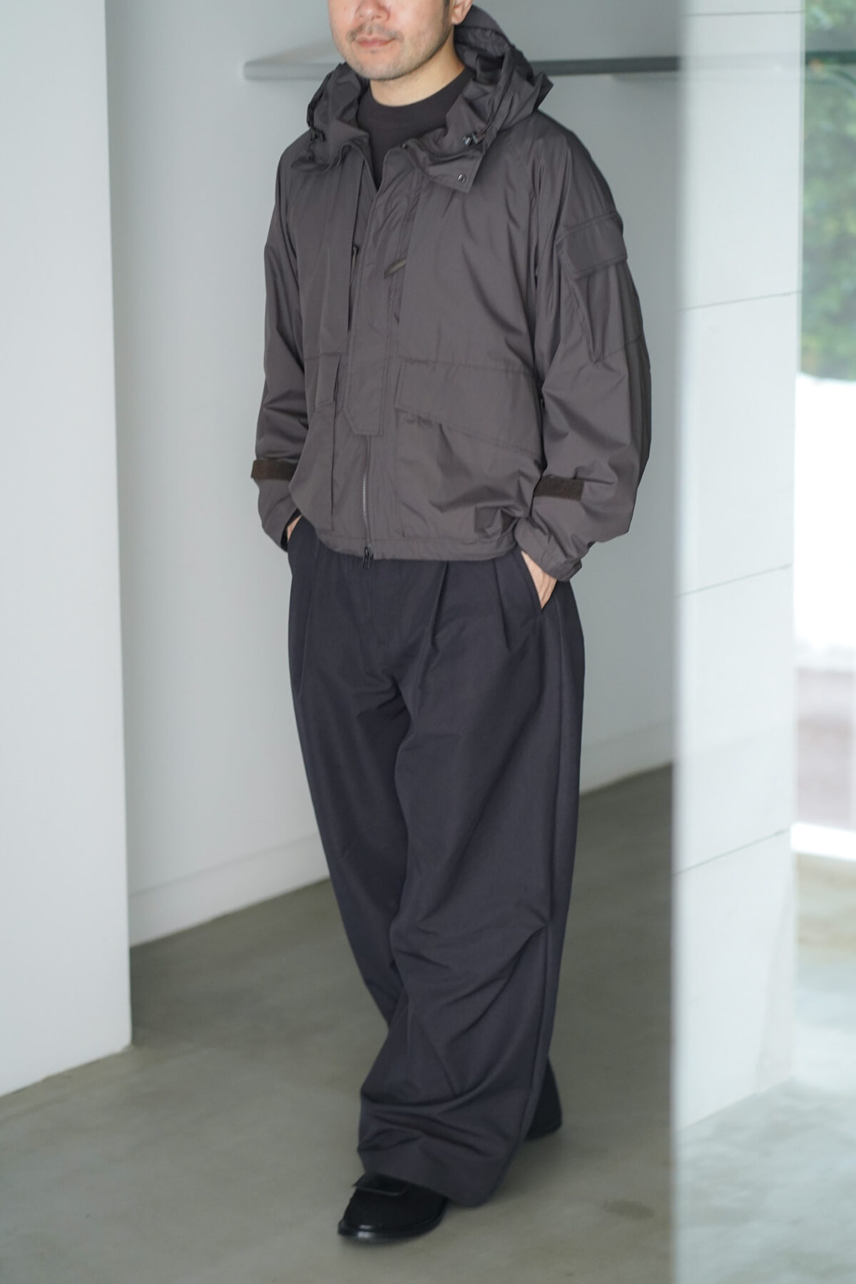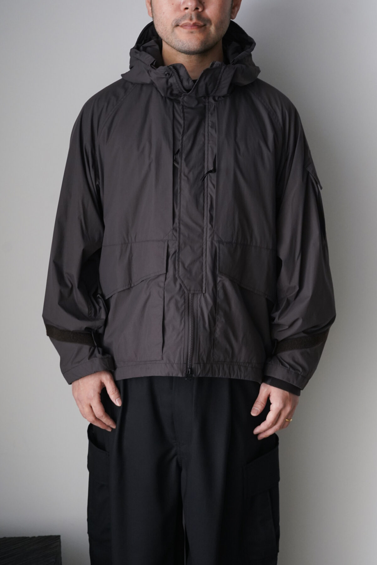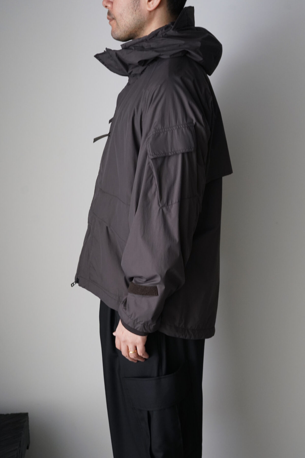 裾口のスピンドル、袖タブにより、機能的なシルエット変化が可能。