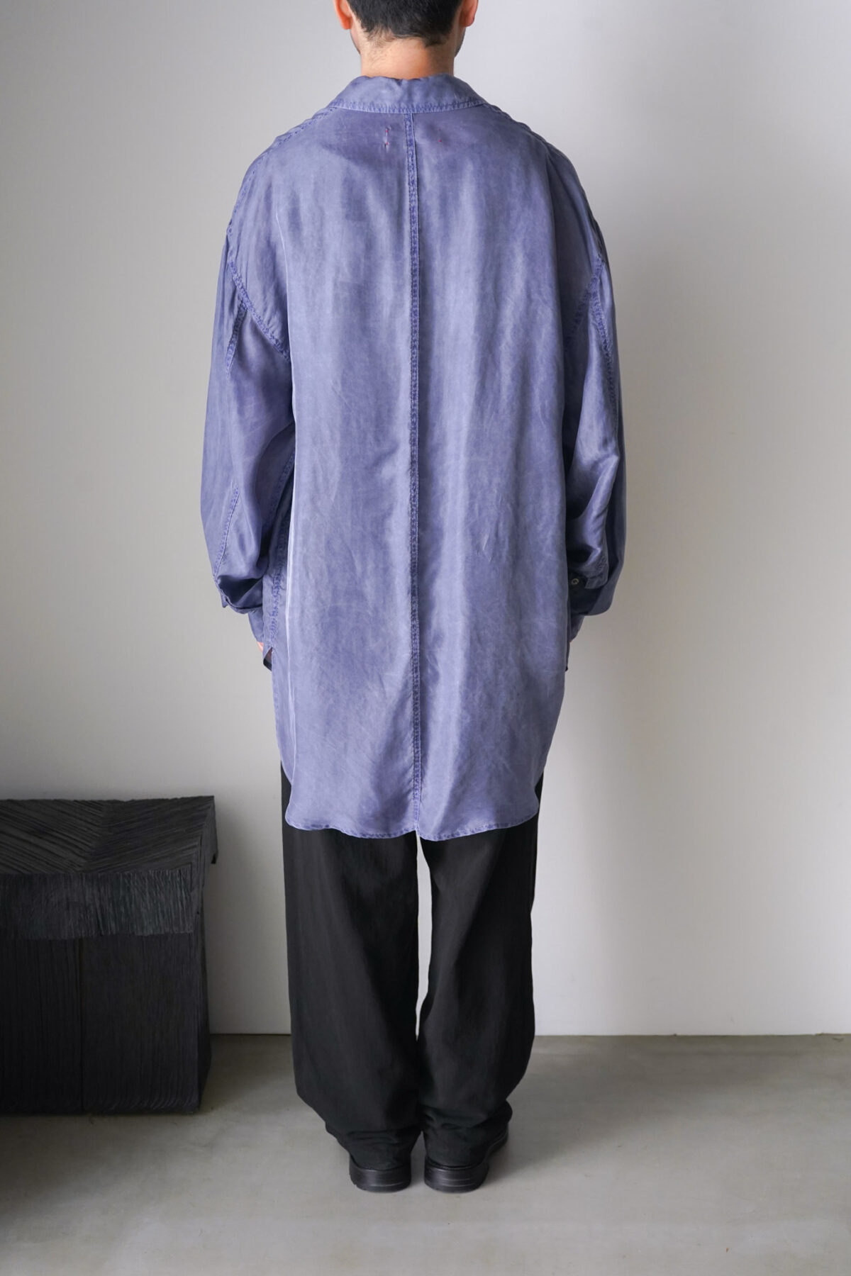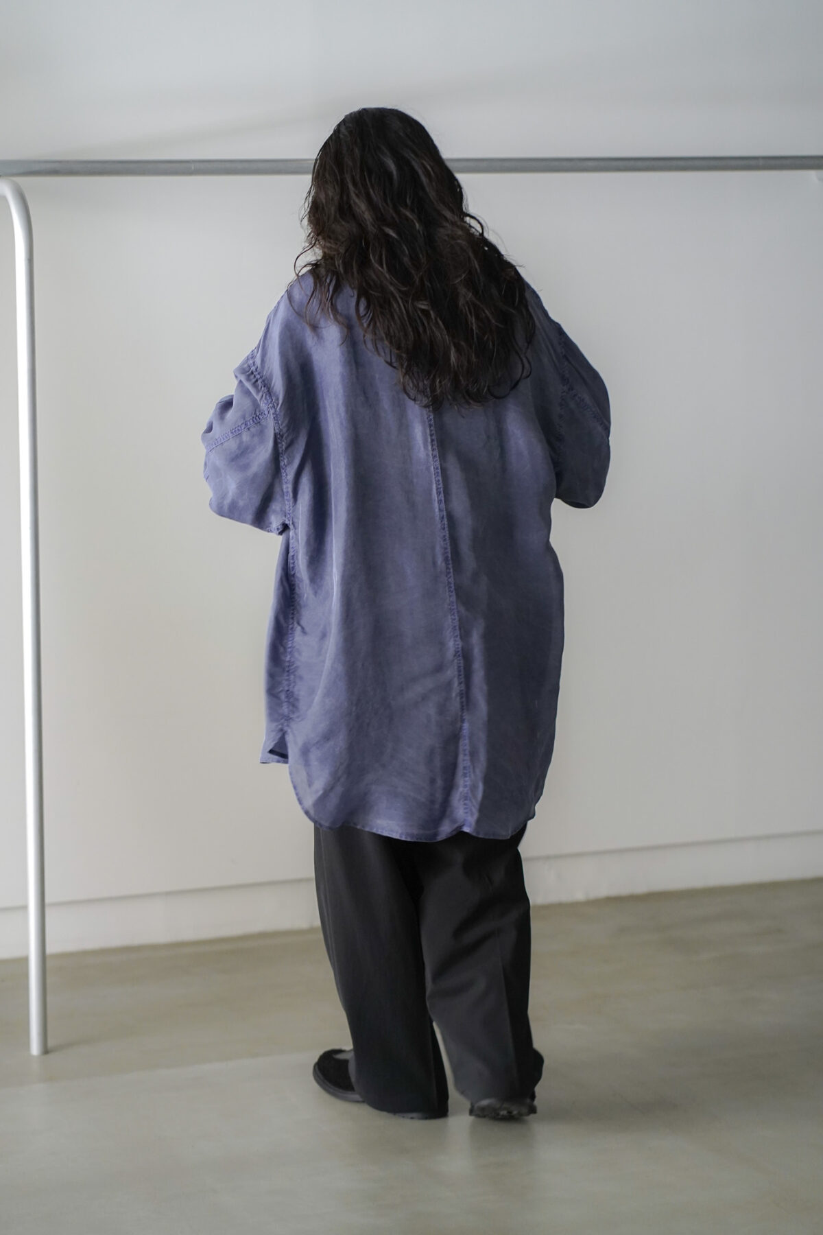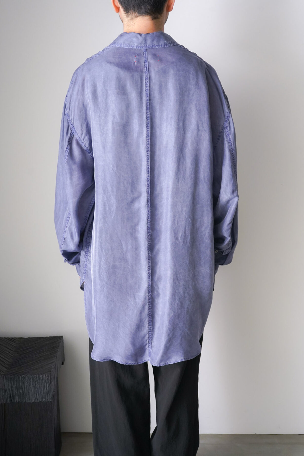 前身頃と後身頃で着丈に差をつけたデザインは、動きが生まれ、軽やかな印象に仕上がっています。各所のステッチにはパッカリングが生まれ、軽やかさの中に奥行きのある表情が共存。