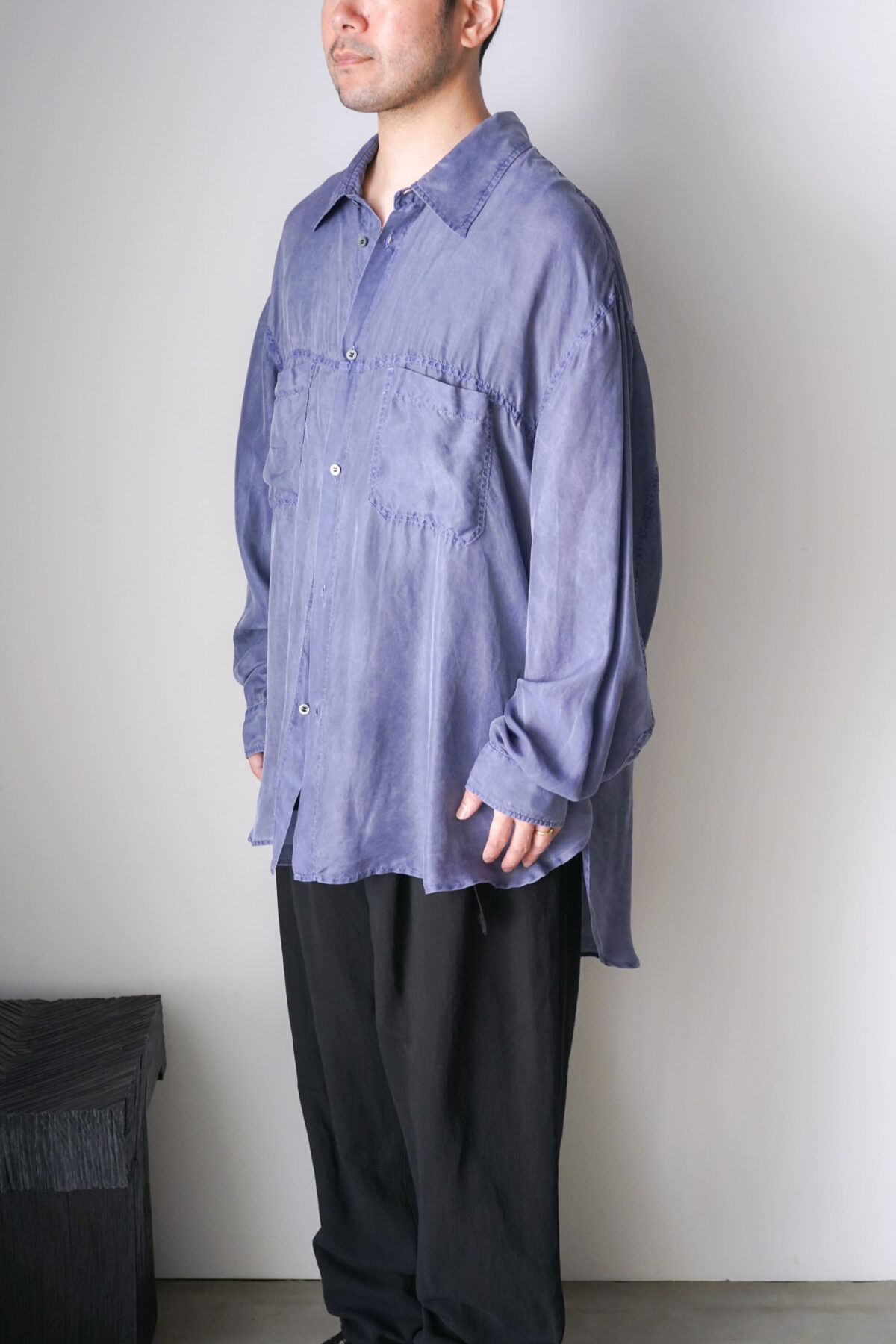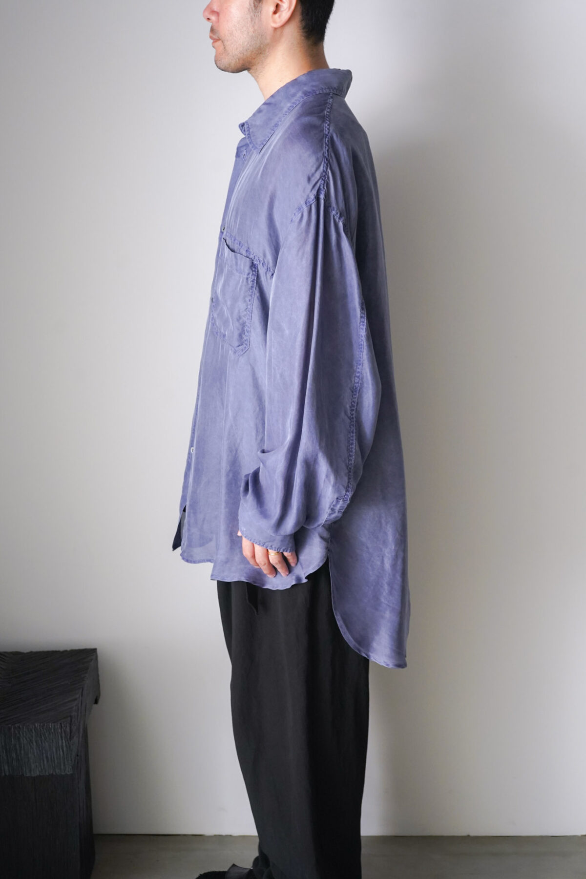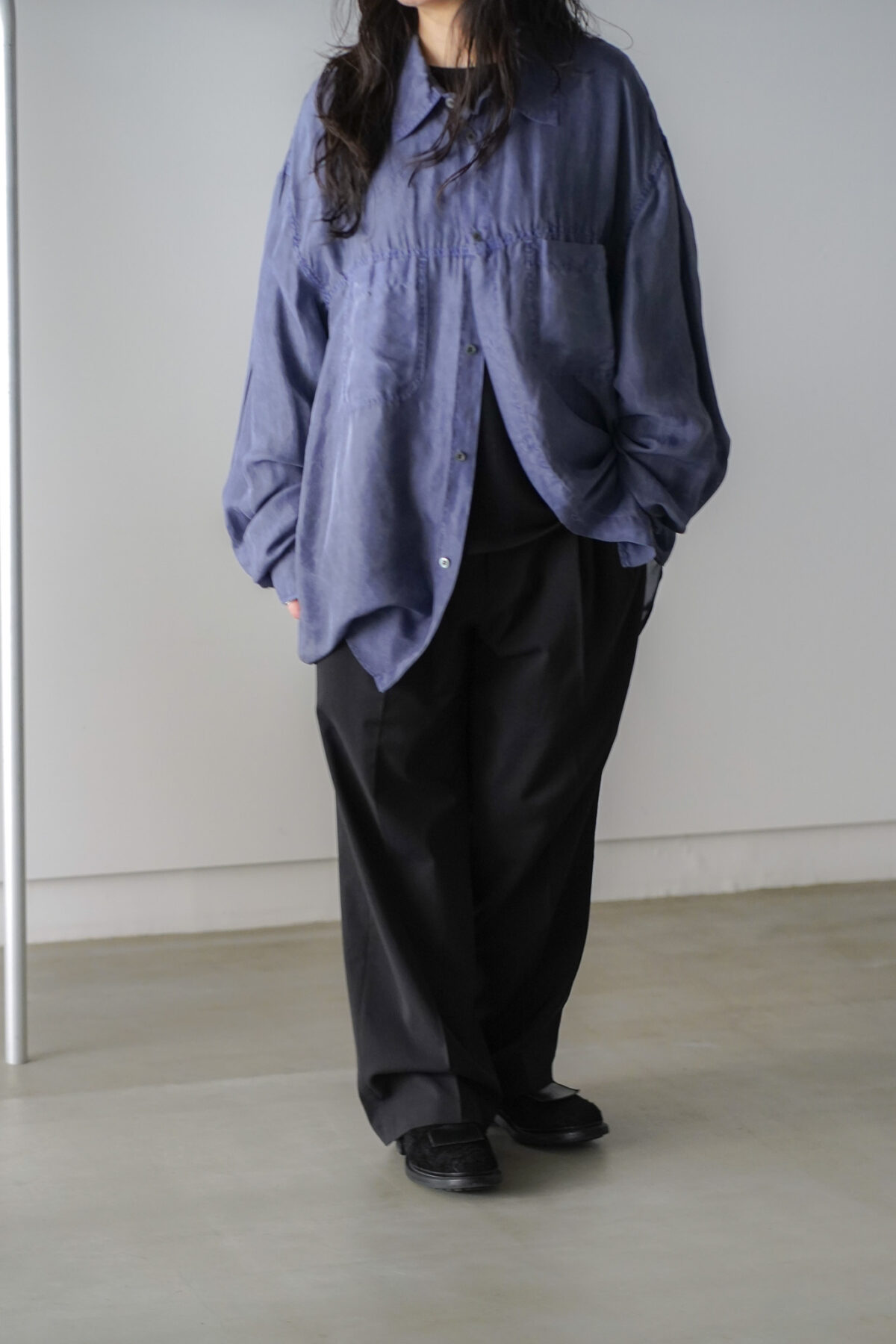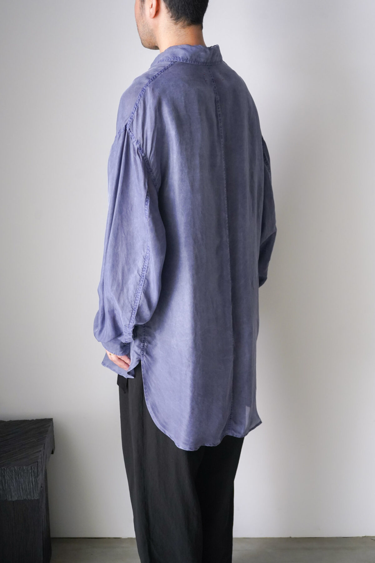 前身頃と後身頃で着丈に差をつけたデザインは、動きが生まれ、軽やかな印象に仕上がっています。各所のステッチにはパッカリングが生まれ、軽やかさの中に奥行きのある表情が共存。