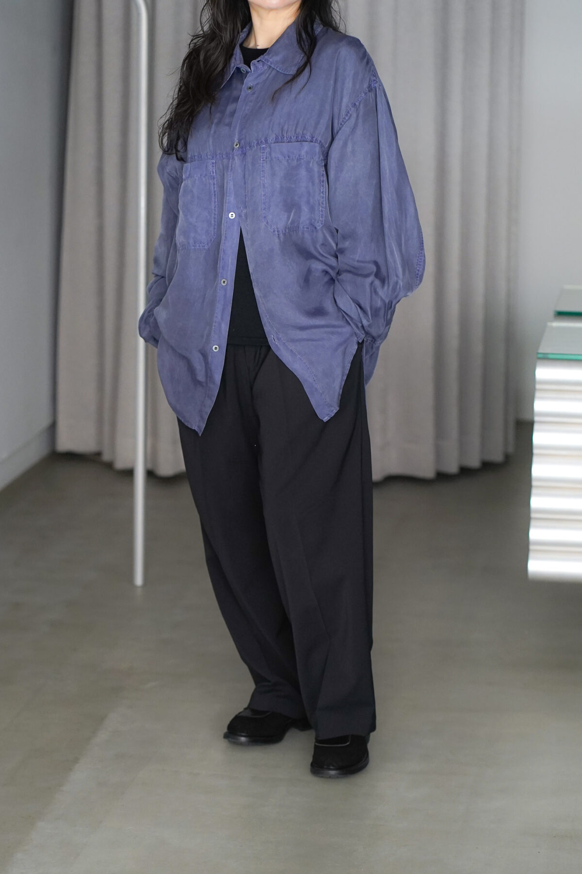 鈍い光沢感も特徴的で、主張しすぎずスタイリングに馴染むバランスです。シルクならではのなめらかな肌触りに加え、ひんやりとしたタッチで快適にご着用いただけます。