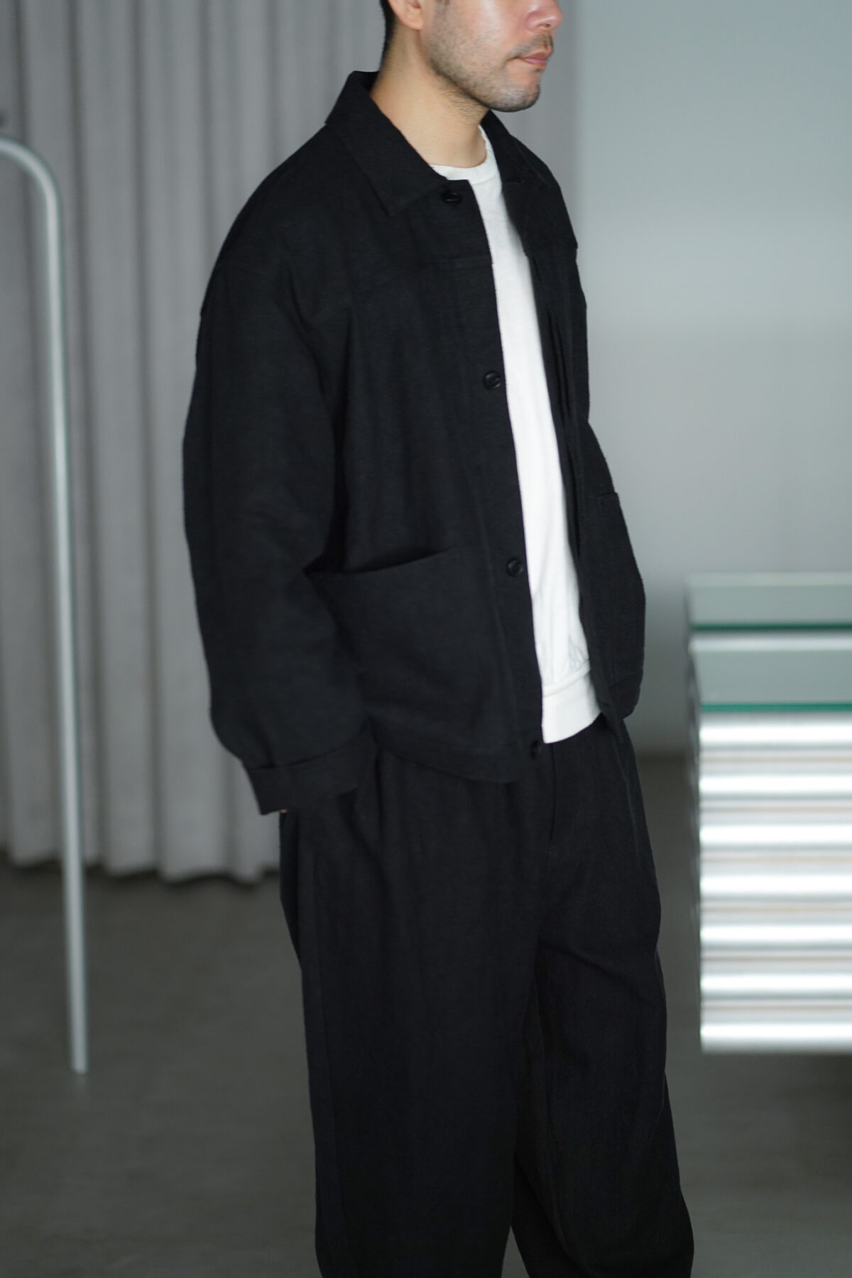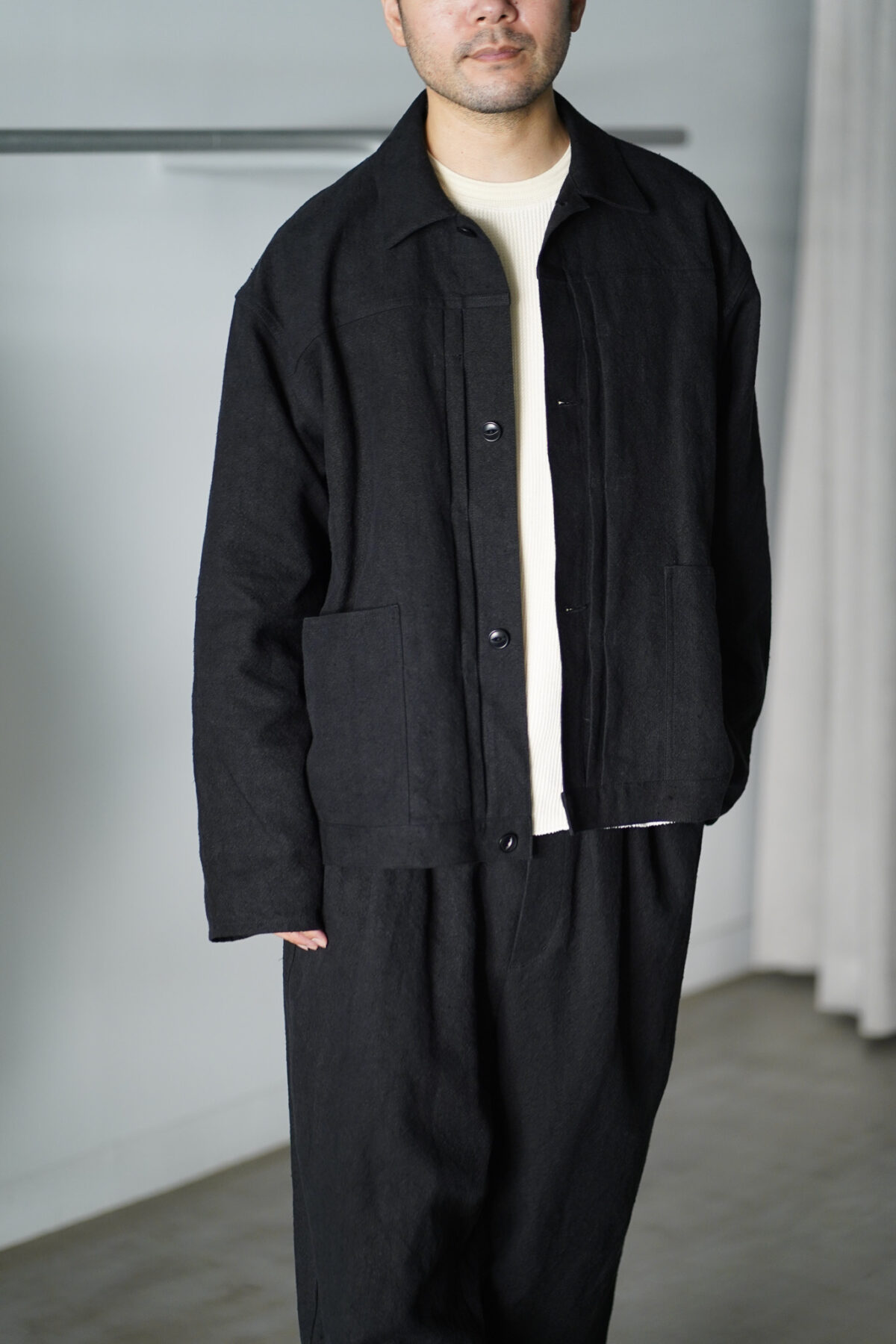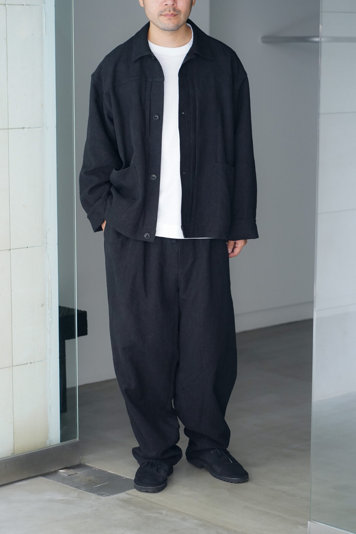 WIDE EASY PANTS – MAX HIGH COUNT HEMP – BLACK と同素材でセットアップで着用可能です。