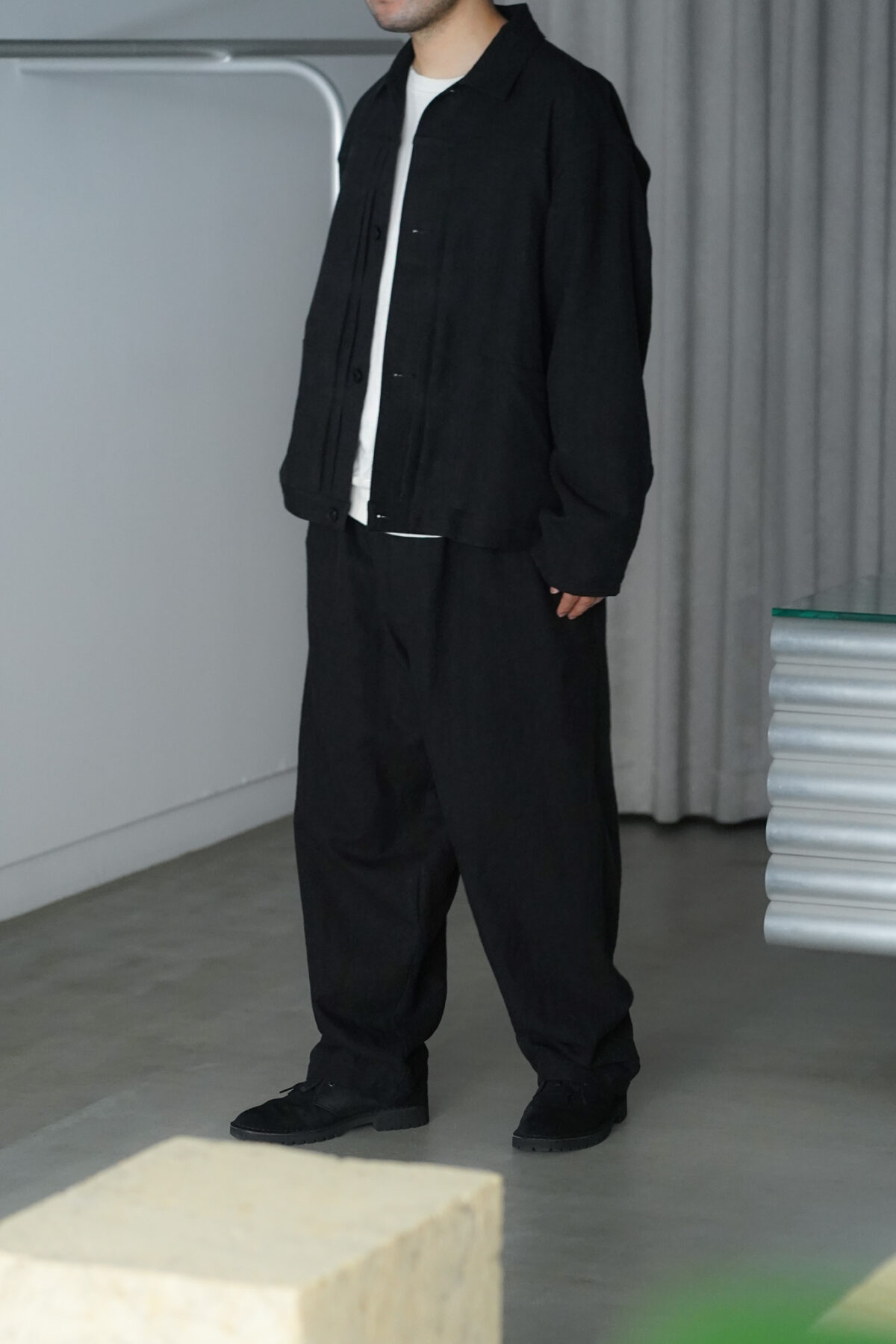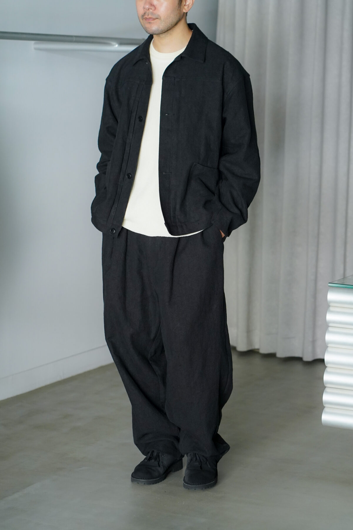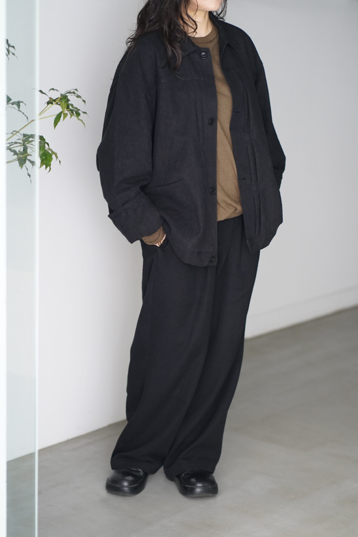 WIDE EASY PANTS – MAX HIGH COUNT HEMP – BLACK と同素材でセットアップで着用可能です。