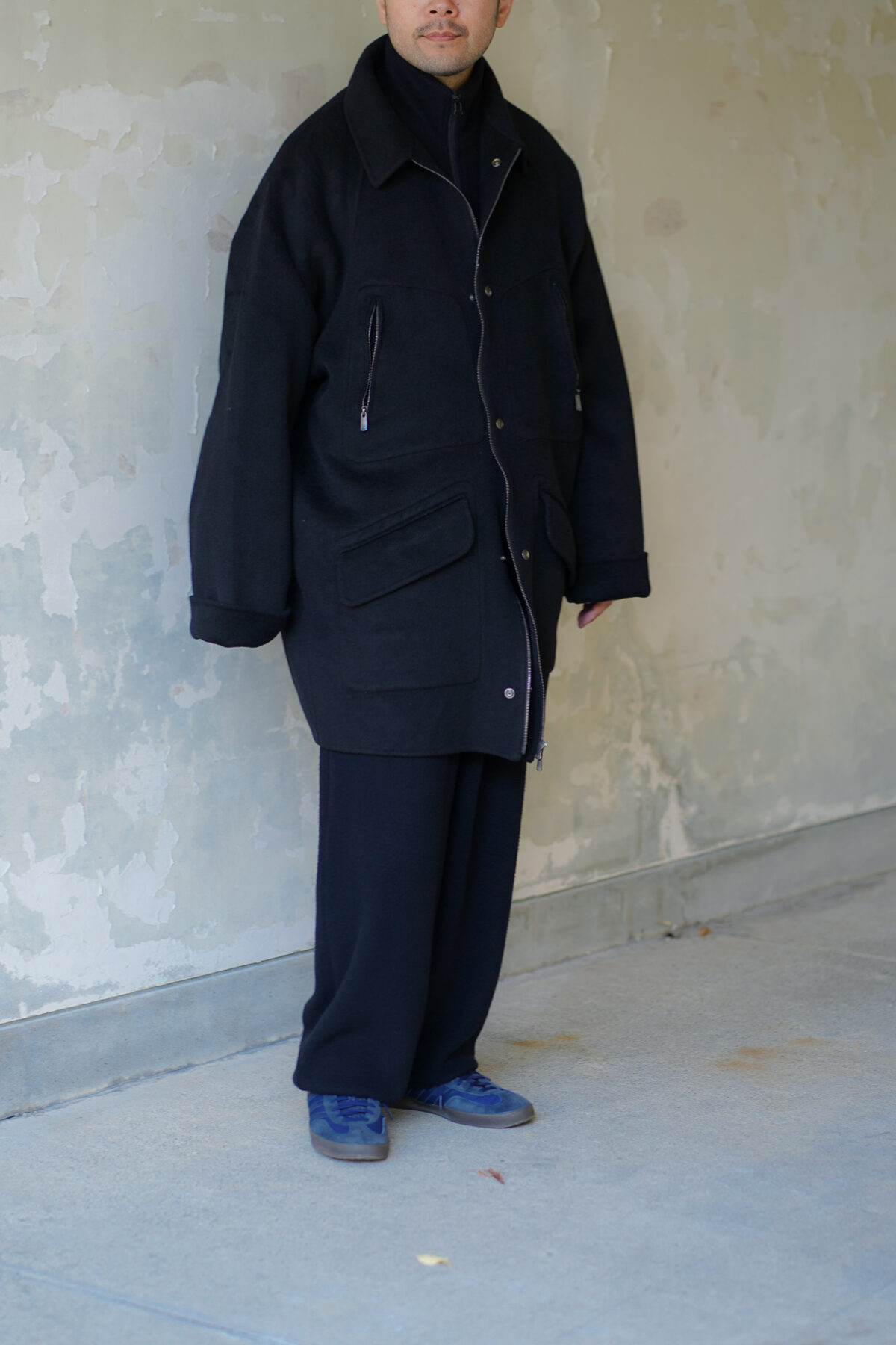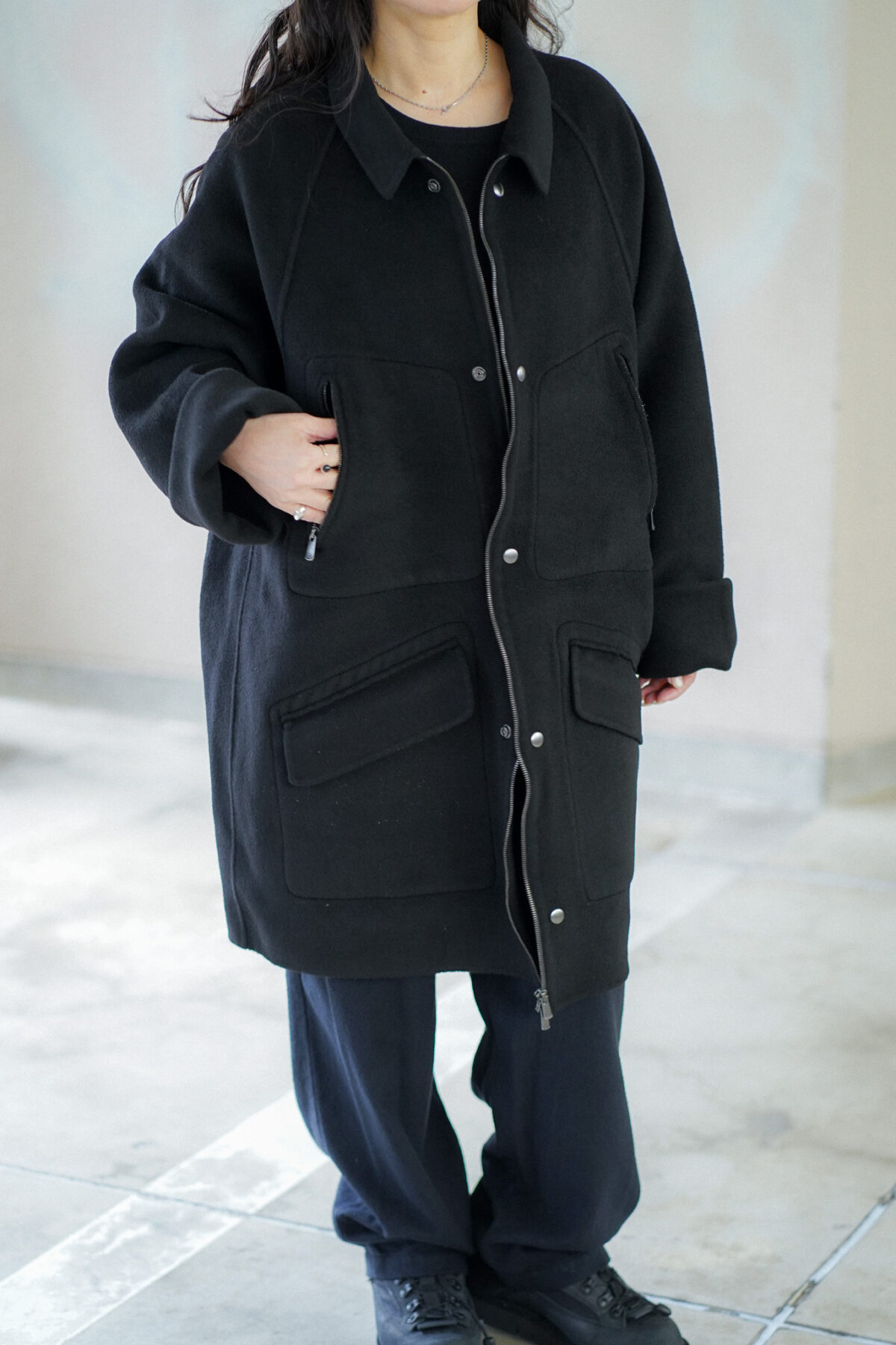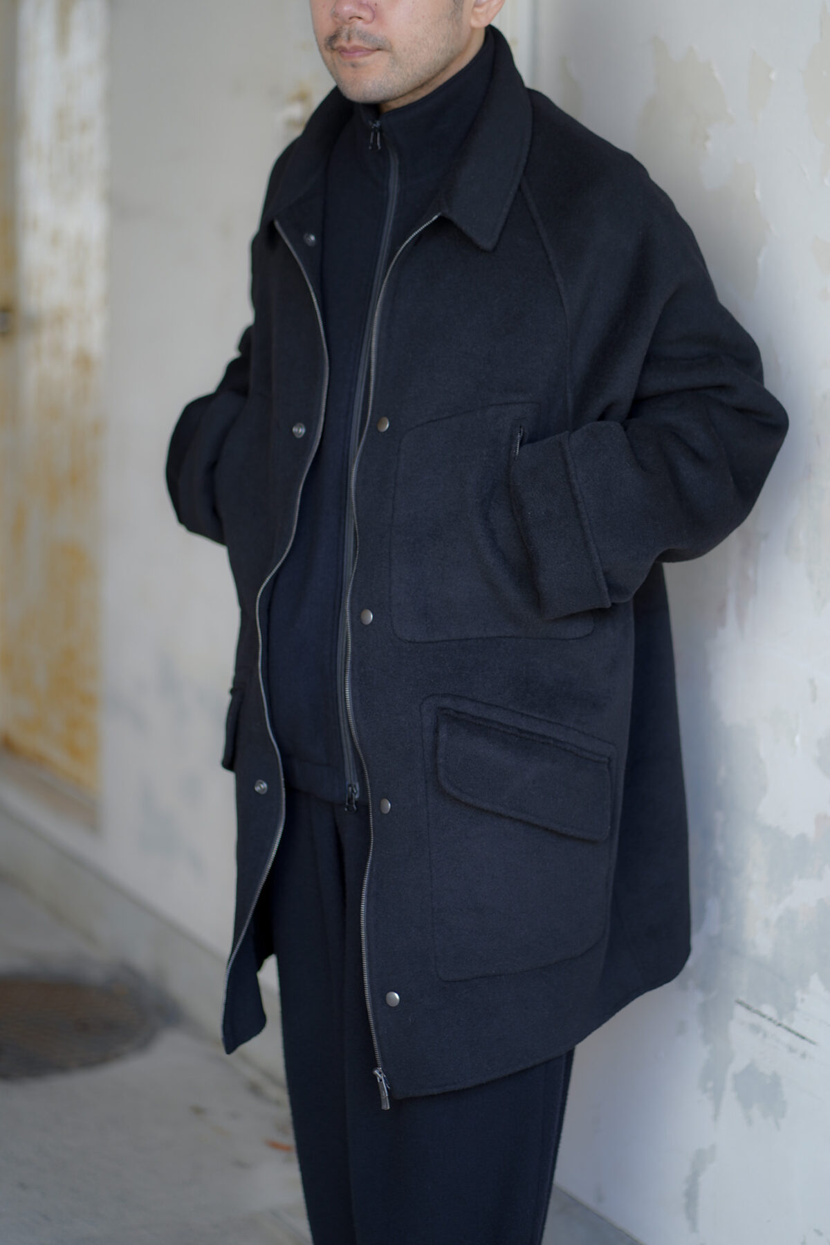 ダブルフェイスのリバー仕立て。全ての箇所をリバーでまとめず、ポケット部分は断ち切りの仕様。またフロントのジップは蛇行しておりクリーンな印象と粗野さを感じ、そのコントラスもとても魅力的に感じます。見返しがなく、ガウンのようなコートのような絶妙なバランス感で羽織っていただけます。