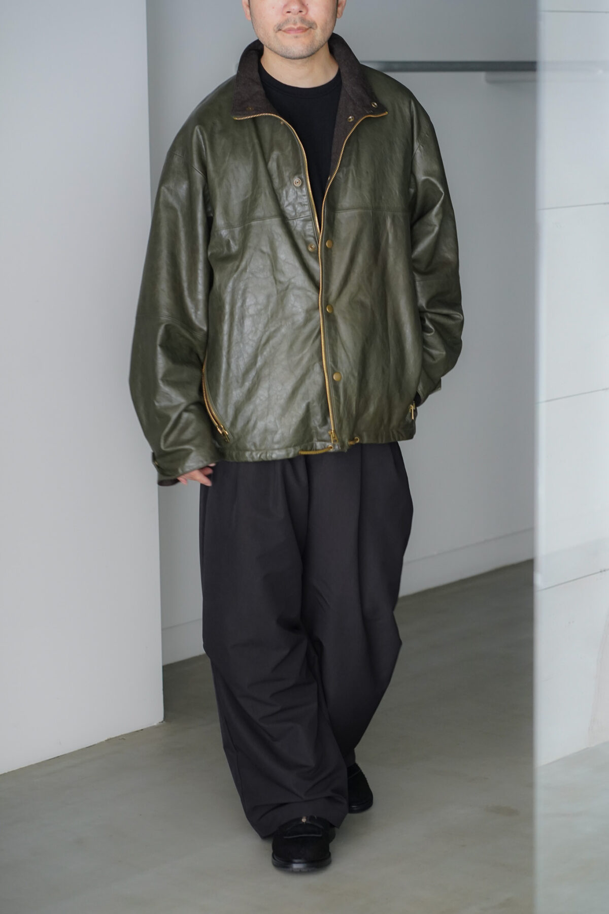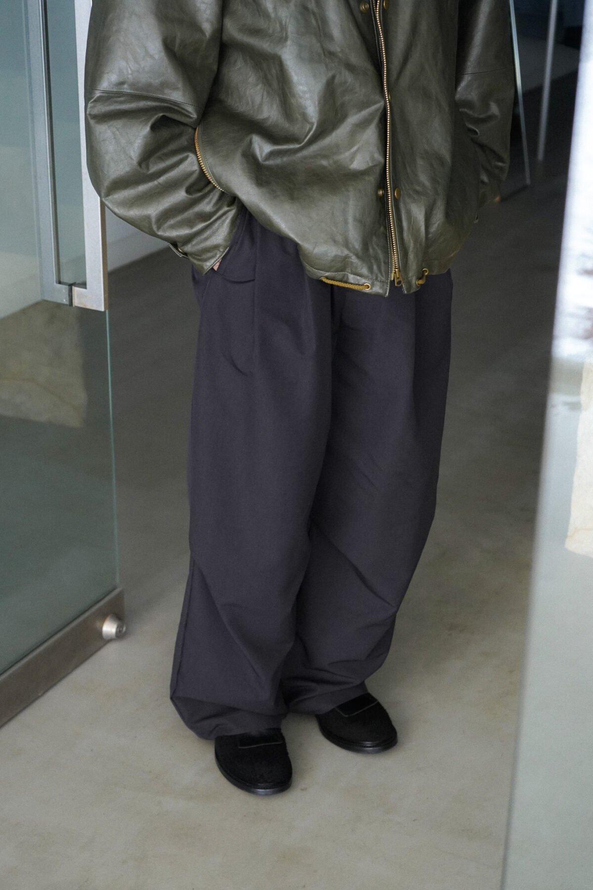 滑らかでパウダリーなタッチのポリエステルタフタ素材を使用したタックワイドパンツ。