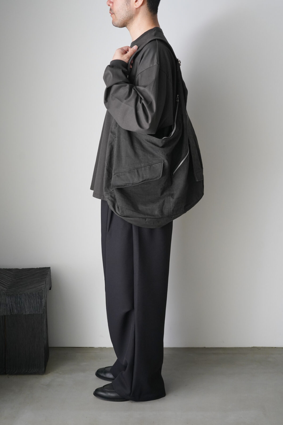 平行に配したジップポケットとフラップポケットも特徴的で、日常使いから軽い旅行までカバーできるサイズで製作。