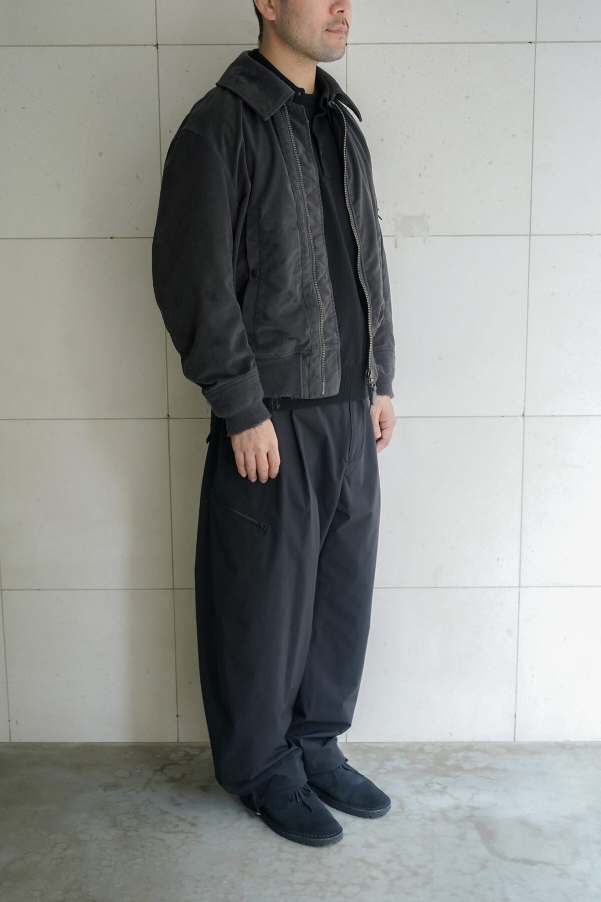 東レが開発した、再生資源を原料の一部に使用したスエード調の人工皮革(スエード)。ソフトでしなやかなタッチかつ、しわになりにくいため、自宅でもイージーケアが可能。耐摩耗性・抗ピリングなど、機能性も優れている。色がムラっぽく入るよコールドダイで染色を行った後、ストーンバイオウオッシュ、グラインダーでダメージを与えることで着古したような雰囲気に。ペンキ加工。