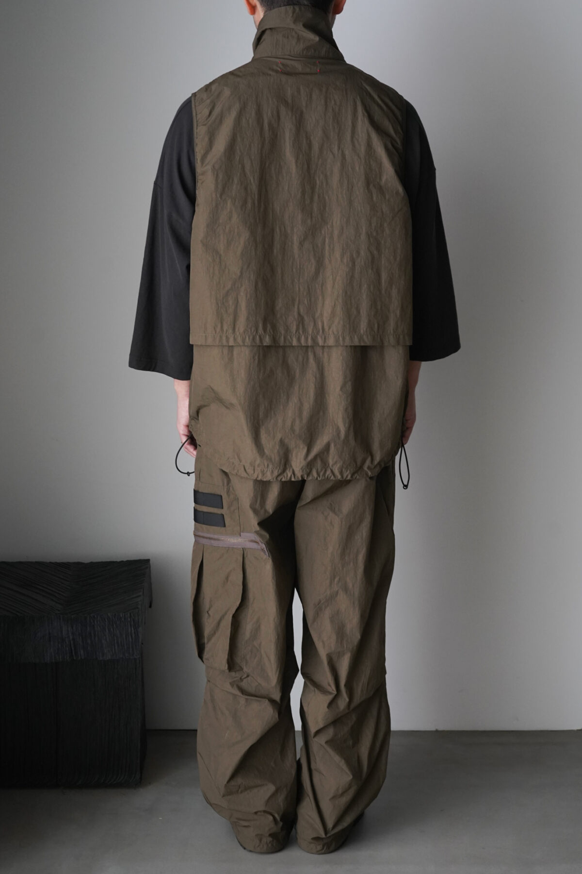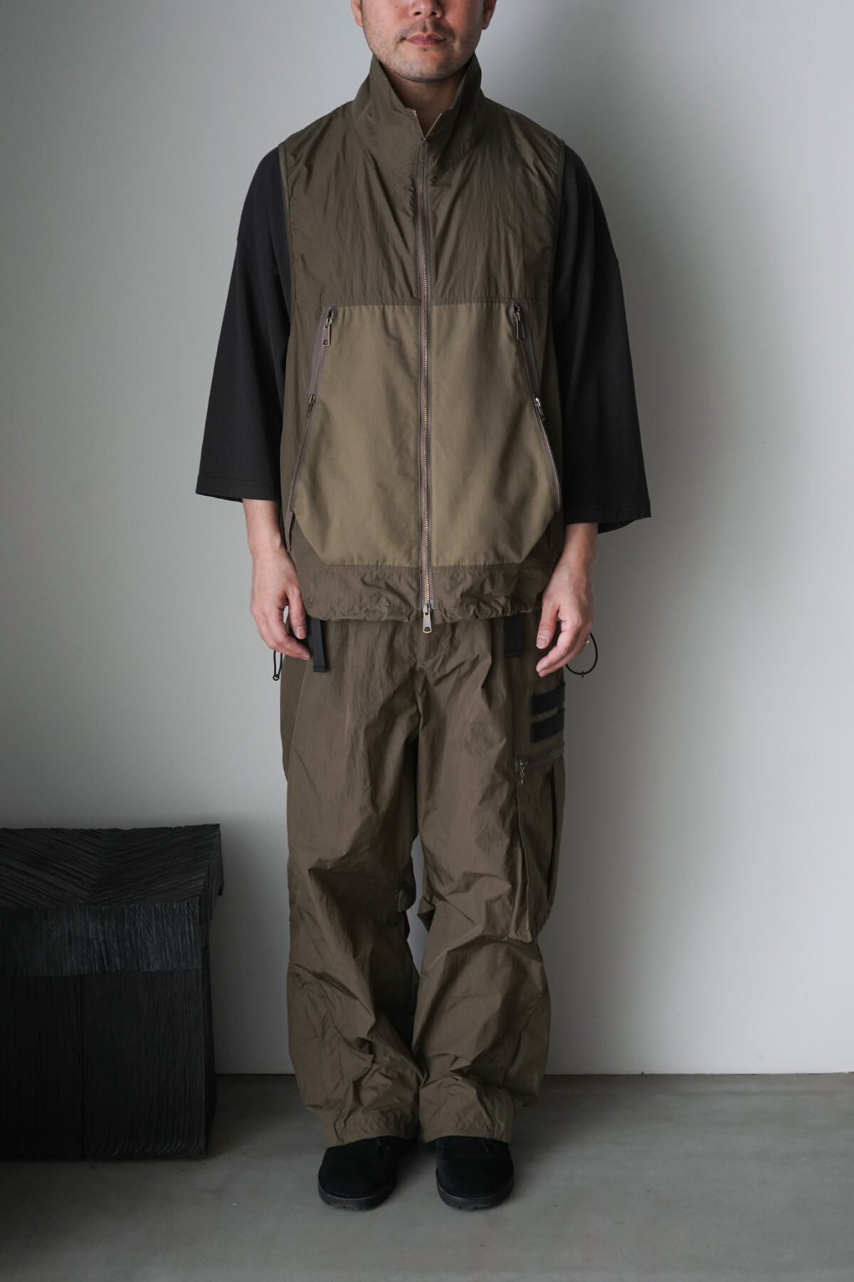 異なるナイロン素材を組み合わせ、ハリのある構築的なバランスに。