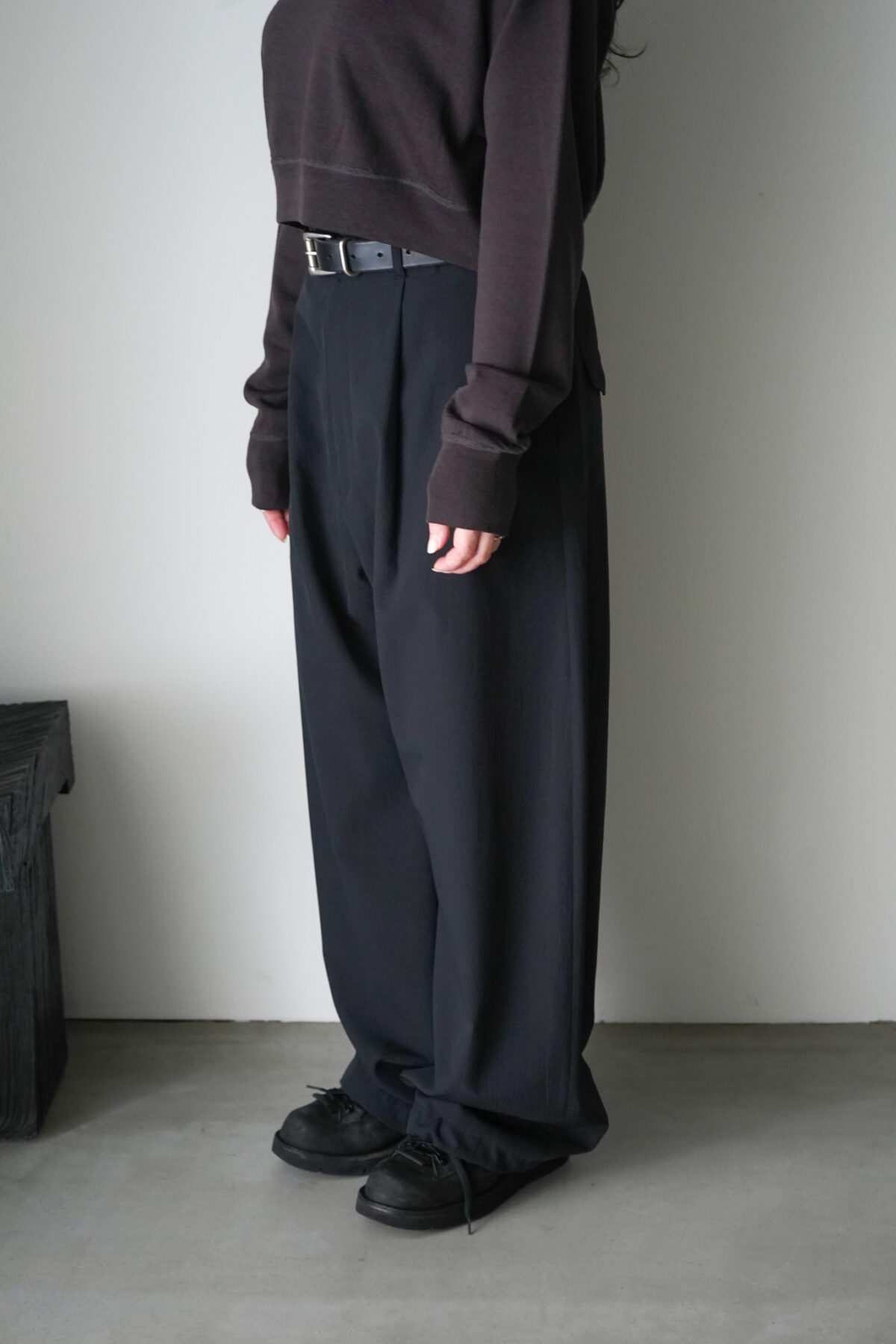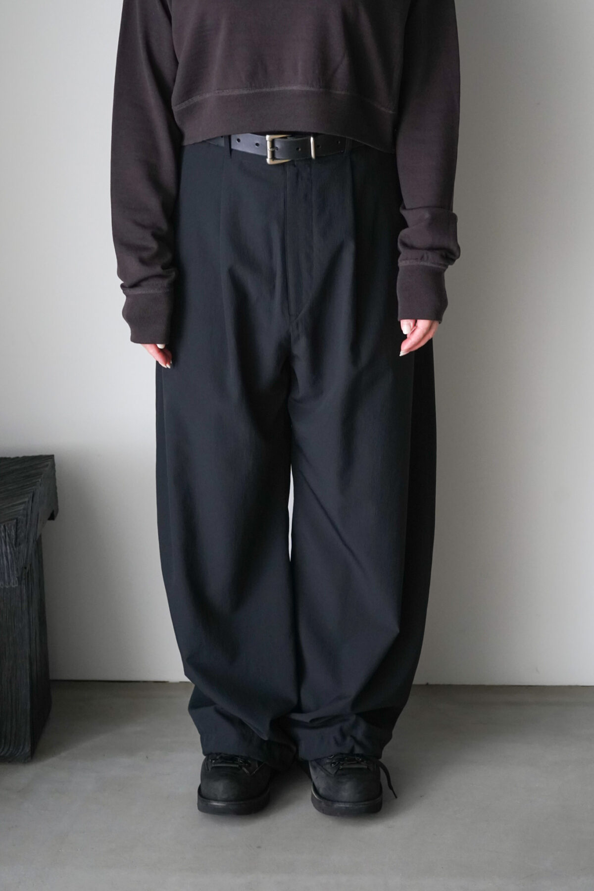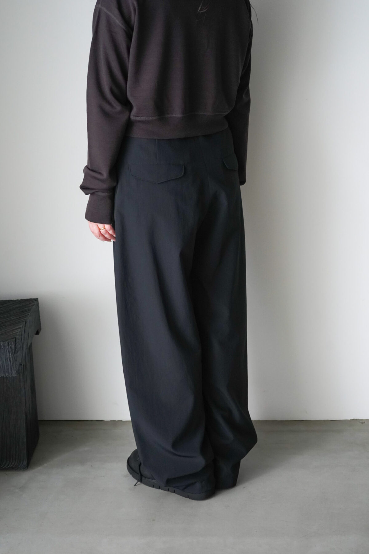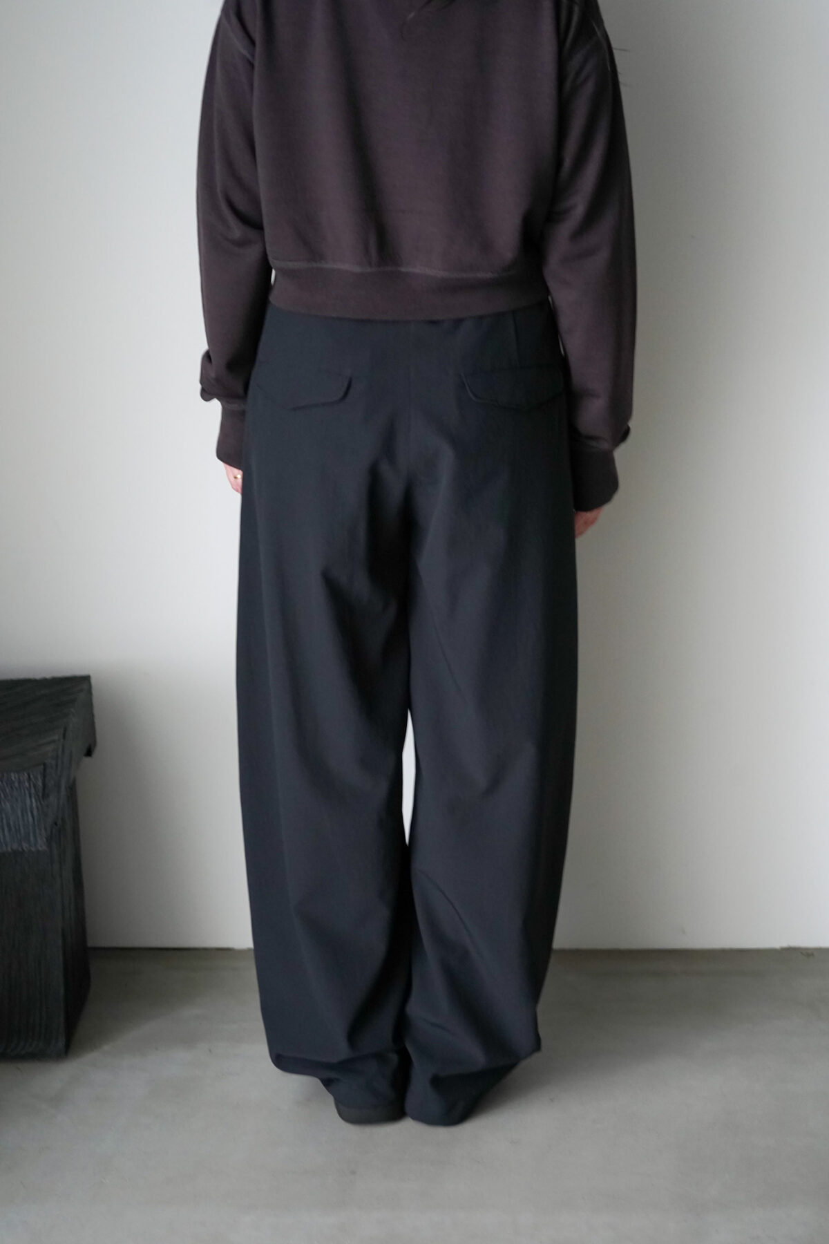 腰まわりが細く、前身に深い1タックを入れ、膝まわりにボリュームを持たせるパターンを採用することで、快適な動きをサポート。