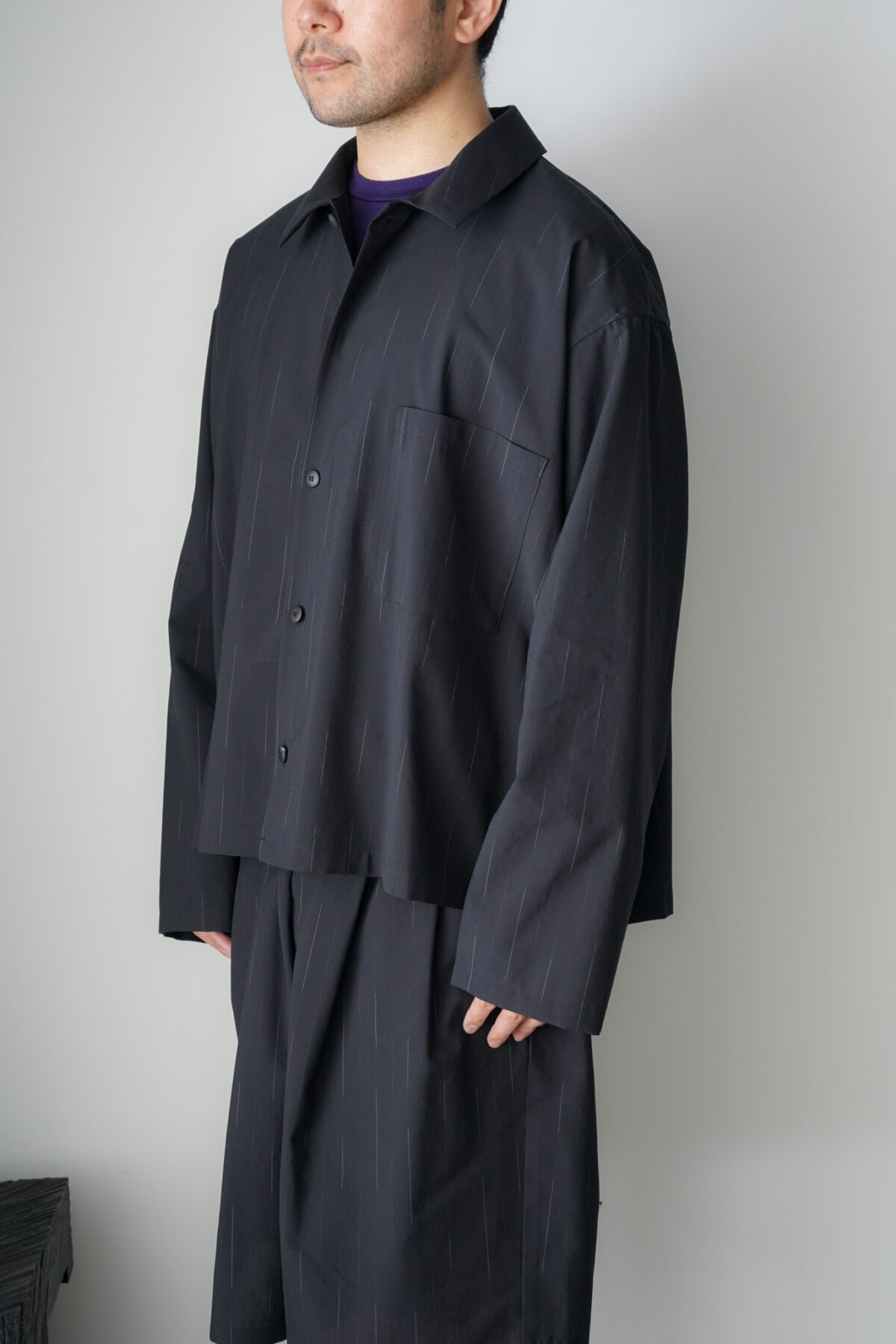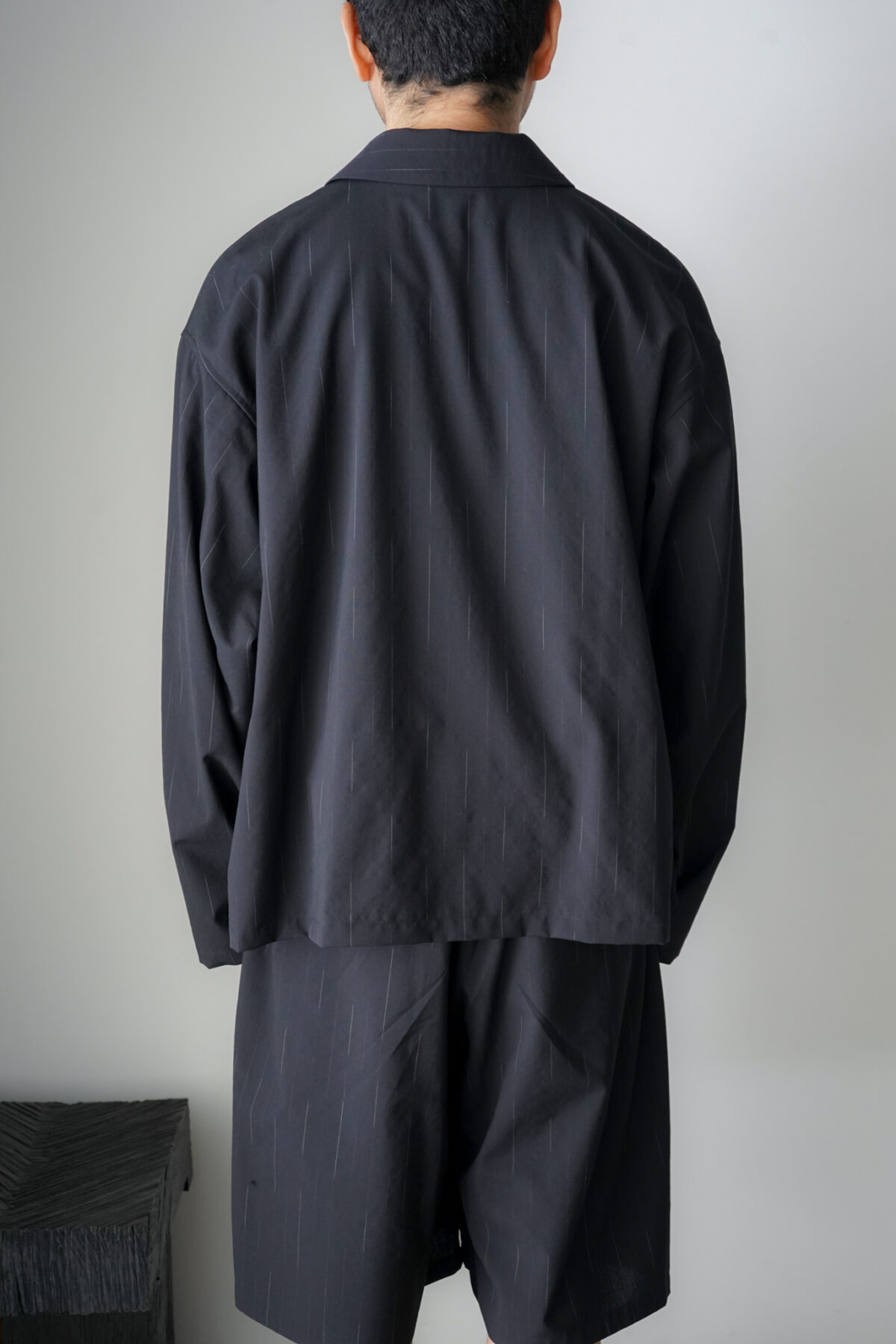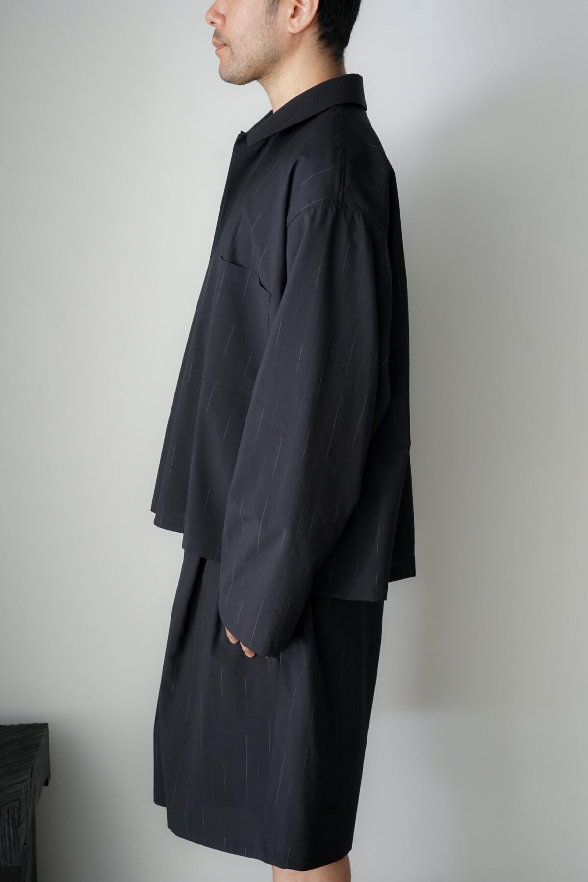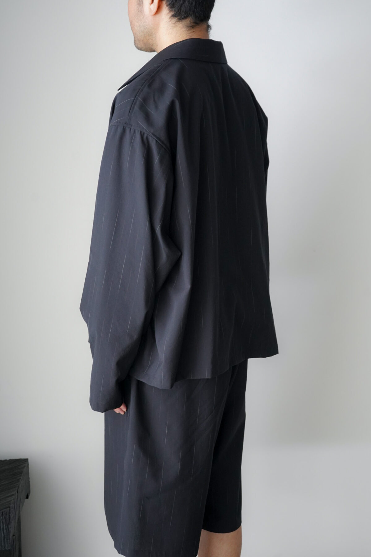 DOUBLE PLEATED WIDE EASY SHORTS – WOOL KASURI STRIPE – BLACK と同素材、セットアップとして着用可能です。