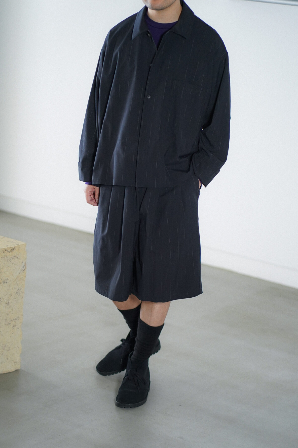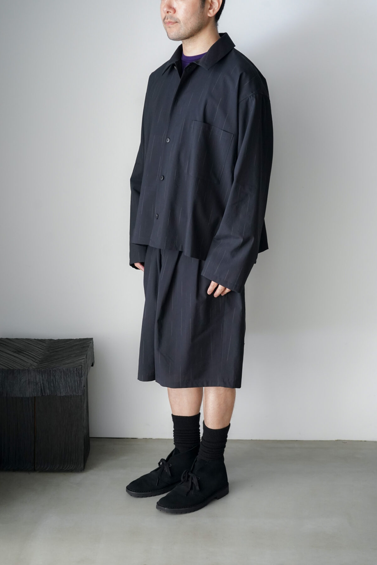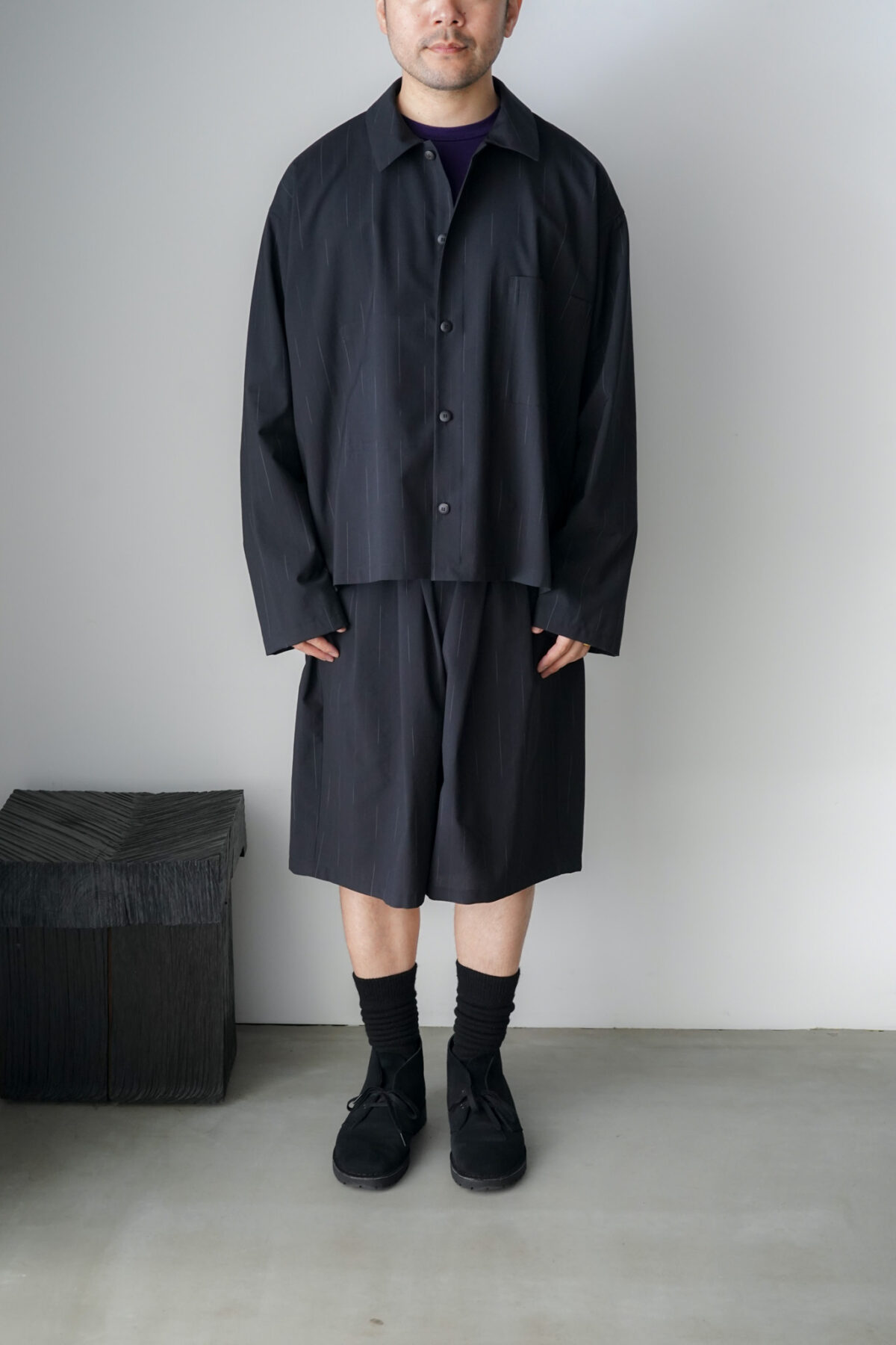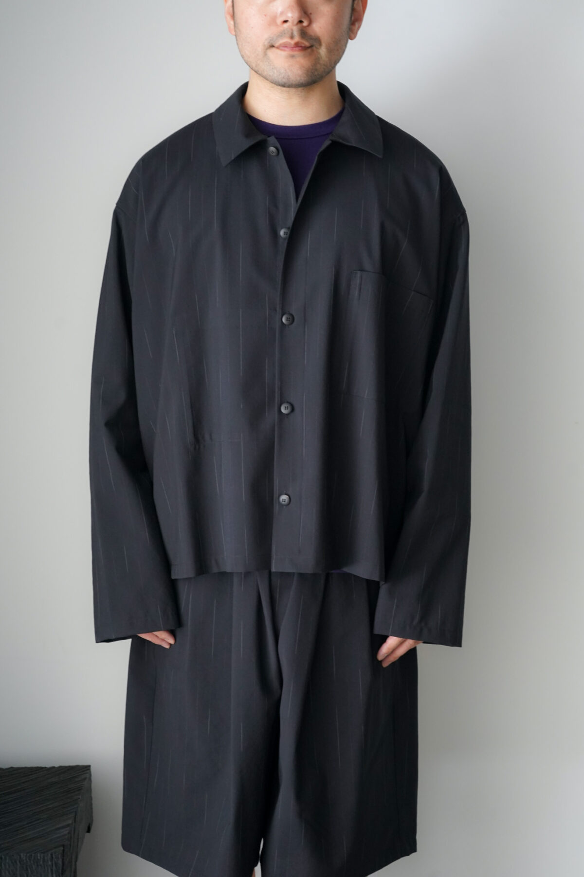 DOUBLE PLEATED WIDE EASY SHORTS – WOOL KASURI STRIPE – BLACK と同素材、セットアップとして着用可能です。