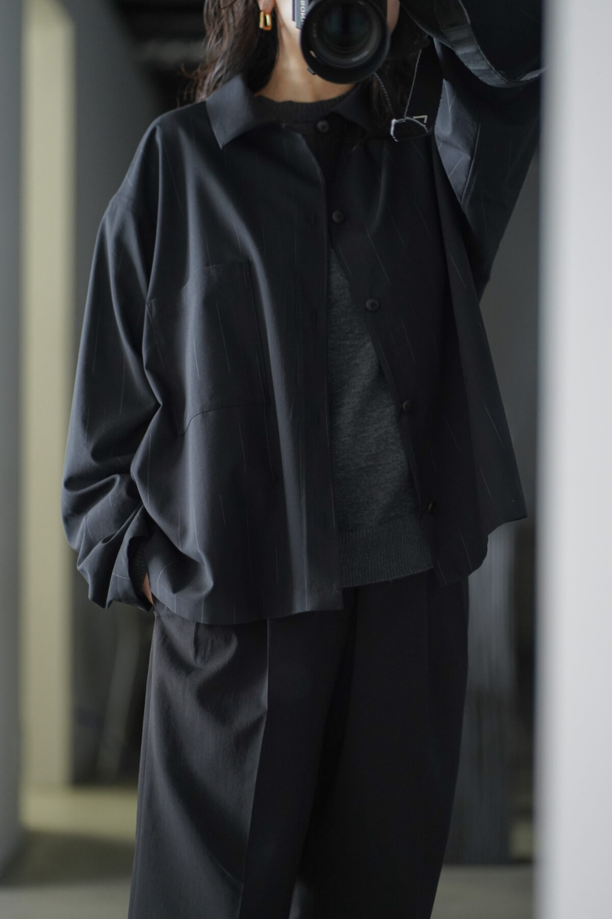 YOKO SAKAMOTO WORK BLOUSE - WOOL KASURI STRIPE - BLACK